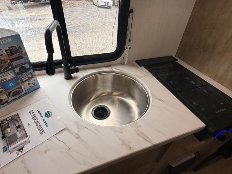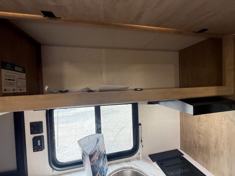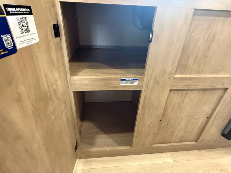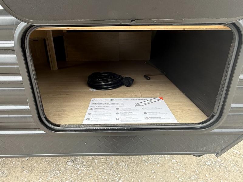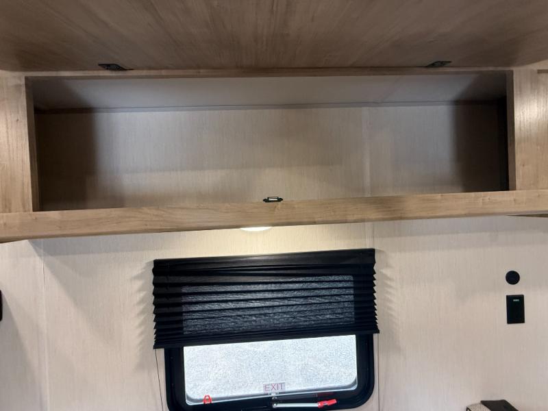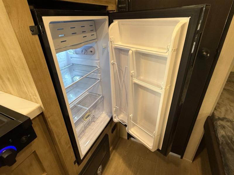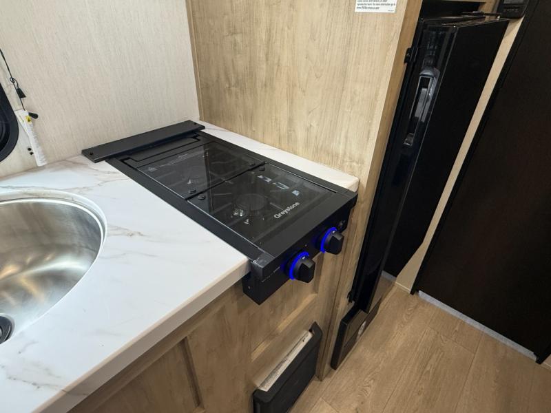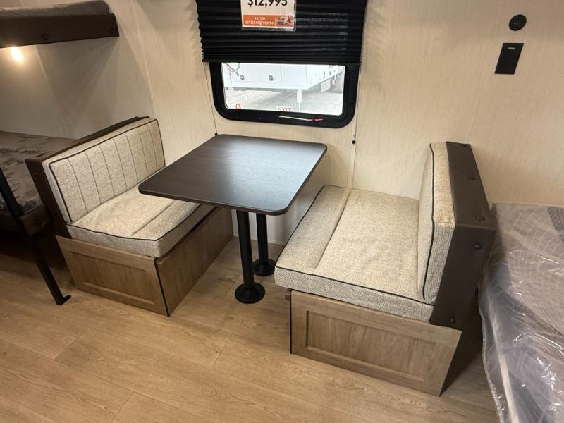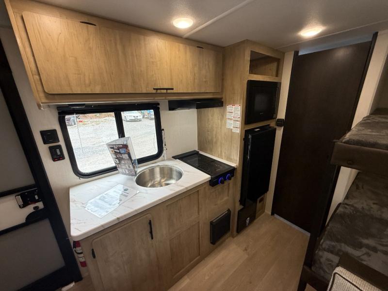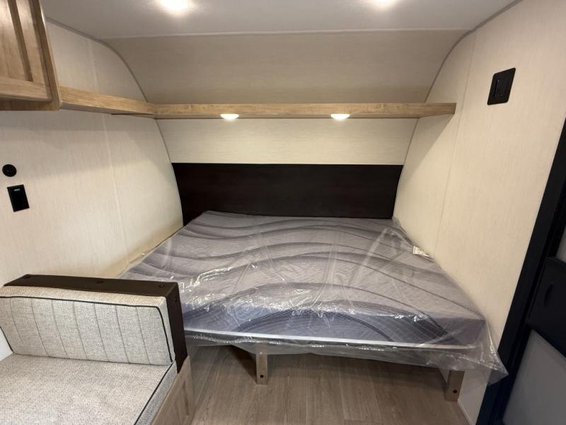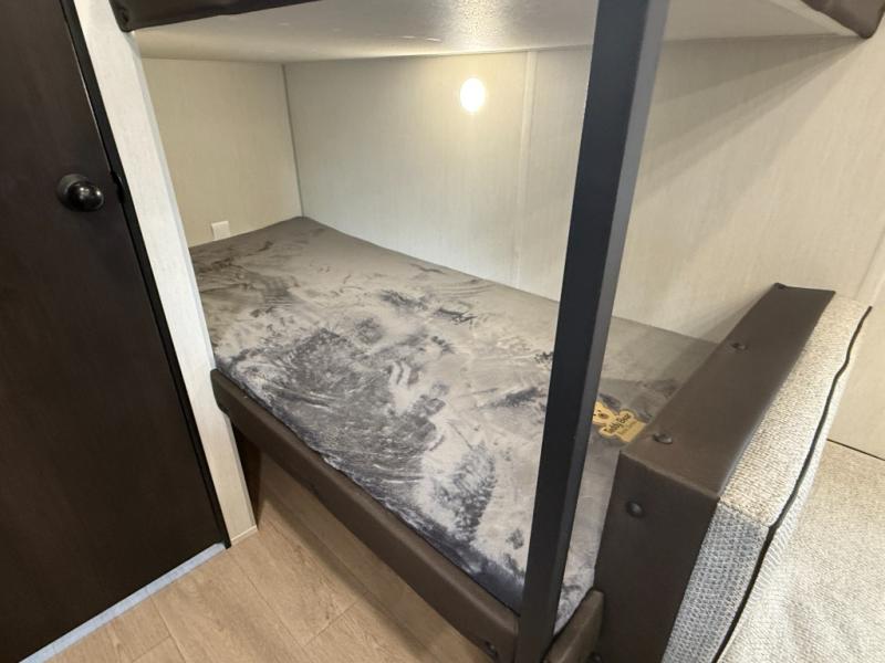 The whole family can sleep comfortably in this travel trailer! It has a set of bunk beds for the kids to sleep on, and you can sleep comfortably on the front queen bed with overhead cabinets and a shelf. The chef will enjoy preparing their best home cooked meals with the cooktop, and you can dine at the booth dinette. And the private bath onboard means you won't have to leave your camper in the middle of the night!