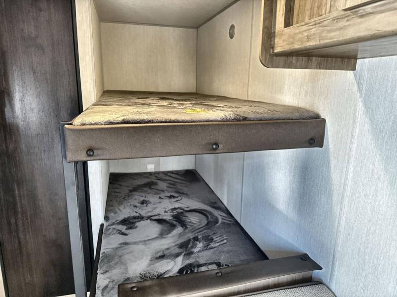 The whole family can sleep comfortably in this travel trailer! It has a set of bunk beds for the kids to sleep on, and you can sleep comfortably on the front queen bed with overhead cabinets and a shelf. The chef will enjoy preparing their best home cooked meals with the cooktop, and you can dine at the booth dinette. And the private bath onboard means you won't have to leave your camper in the middle of the night!