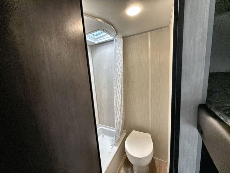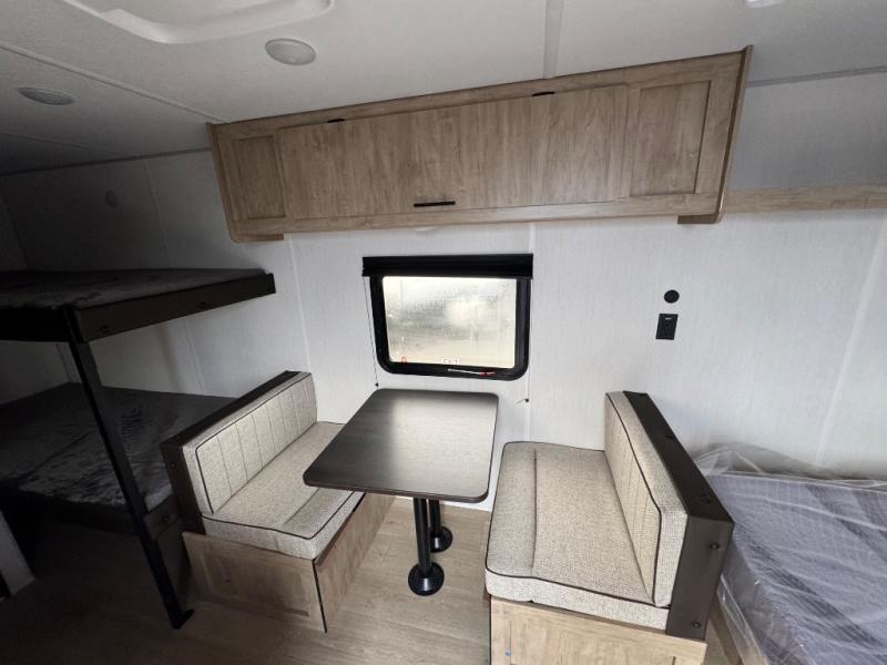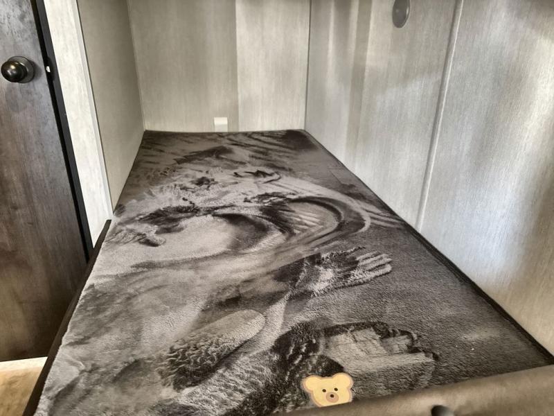 The whole family can sleep comfortably in this travel trailer! It has a set of bunk beds for the kids to sleep on, and you can sleep comfortably on the front queen bed with overhead cabinets and a shelf. The chef will enjoy preparing their best home cooked meals with the cooktop, and you can dine at the booth dinette. And the private bath onboard means you won't have to leave your camper in the middle of the night!