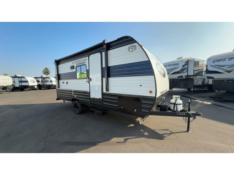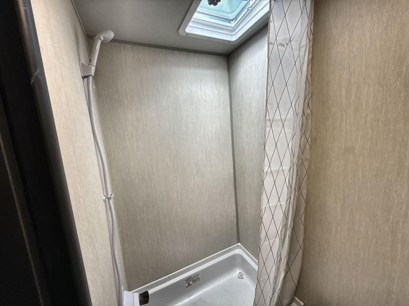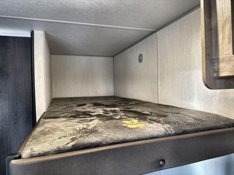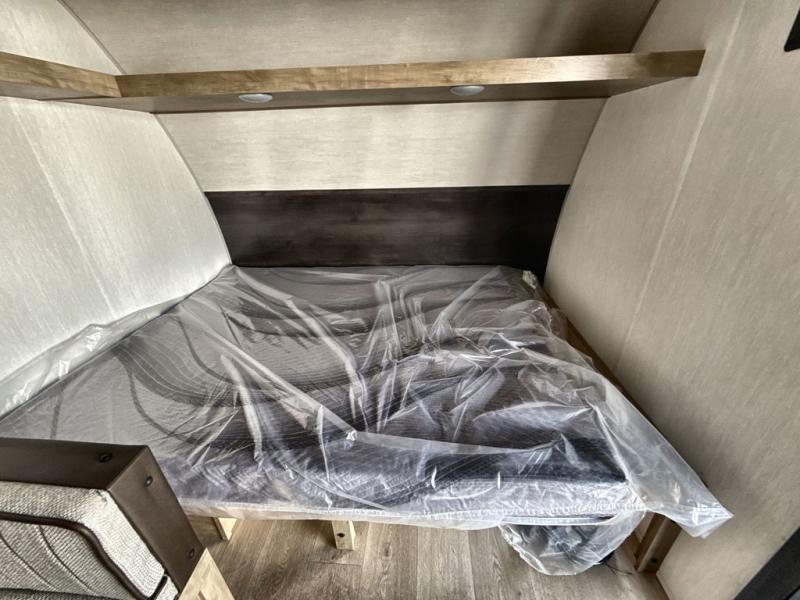 The whole family can sleep comfortably in this travel trailer! It has a set of bunk beds for the kids to sleep on, and you can sleep comfortably on the front queen bed with overhead cabinets and a shelf. The chef will enjoy preparing their best home cooked meals with the cooktop, and you can dine at the booth dinette. And the private bath onboard means you won't have to leave your camper in the middle of the night!