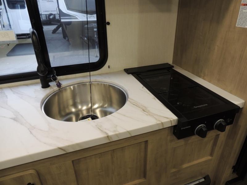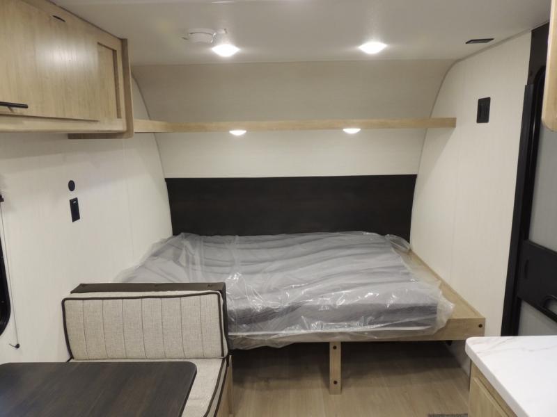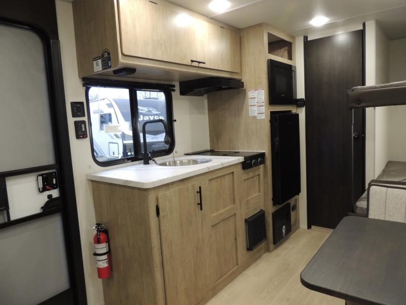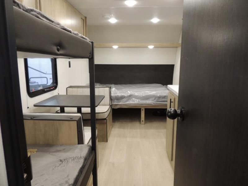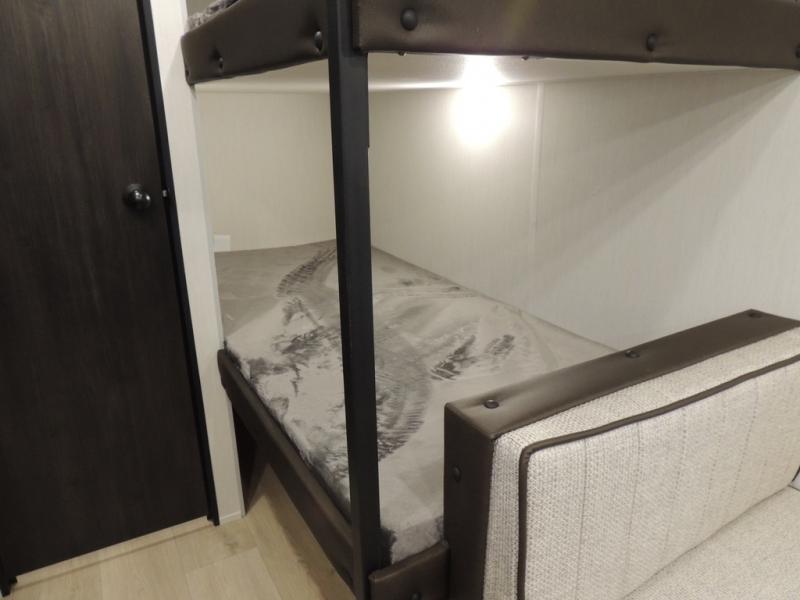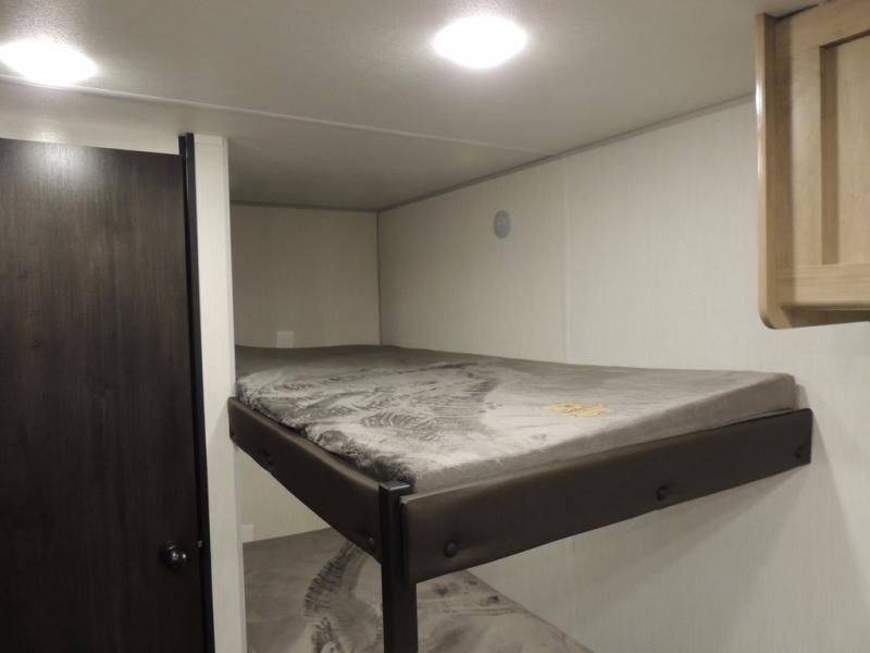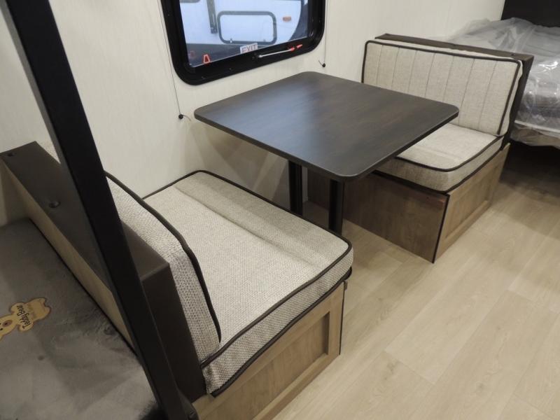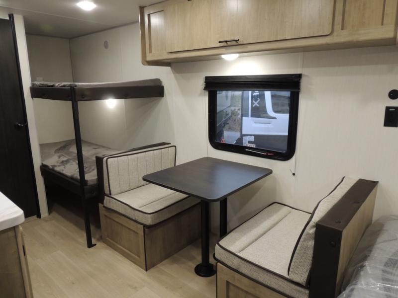 The whole family can sleep comfortably in this travel trailer! It has a set of bunk beds for the kids to sleep on, and you can sleep comfortably on the front queen bed with overhead cabinets and a shelf. The chef will enjoy preparing their best home cooked meals with the cooktop, and you can dine at the booth dinette. And the private bath onboard means you won't have to leave your camper in the middle of the night!