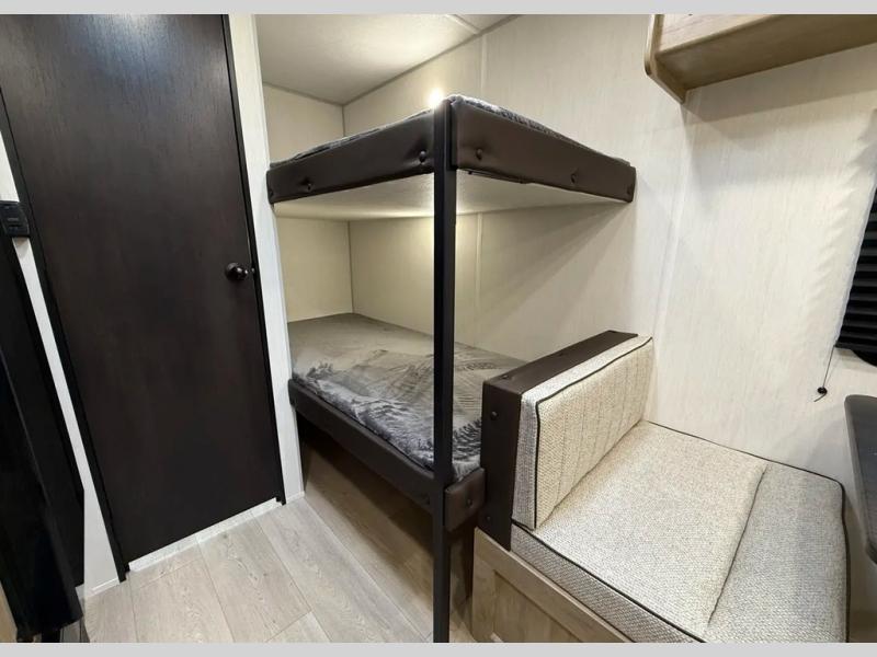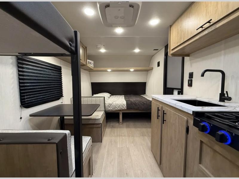 The whole family can sleep comfortably in this travel trailer! It has a set of bunk beds for the kids to sleep on, and you can sleep comfortably on the front queen bed with overhead cabinets and a shelf. The chef will enjoy preparing their best home cooked meals with the cooktop, and you can dine at the booth dinette. And the private bath onboard means you won't have to leave your camper in the middle of the night!