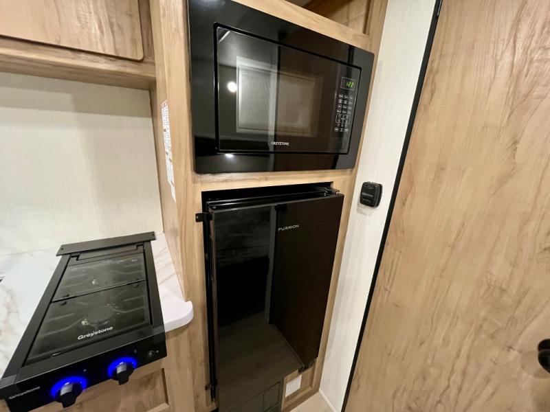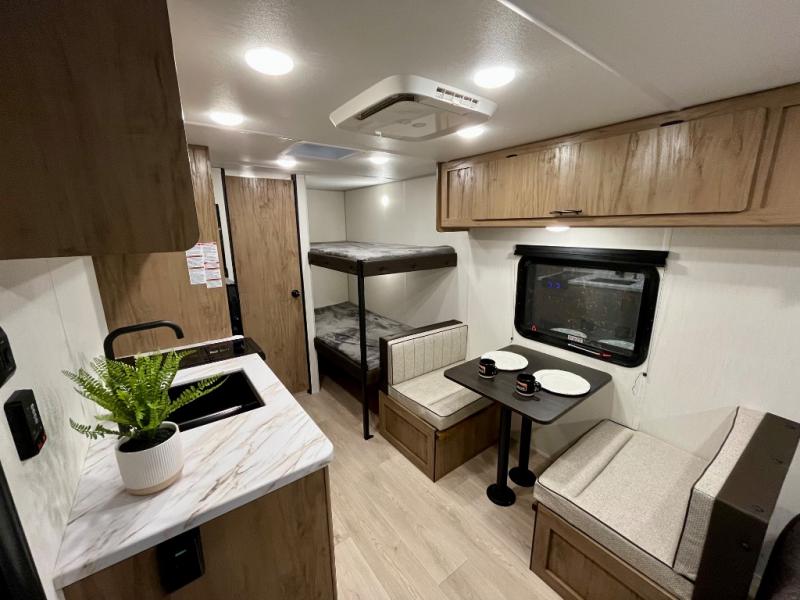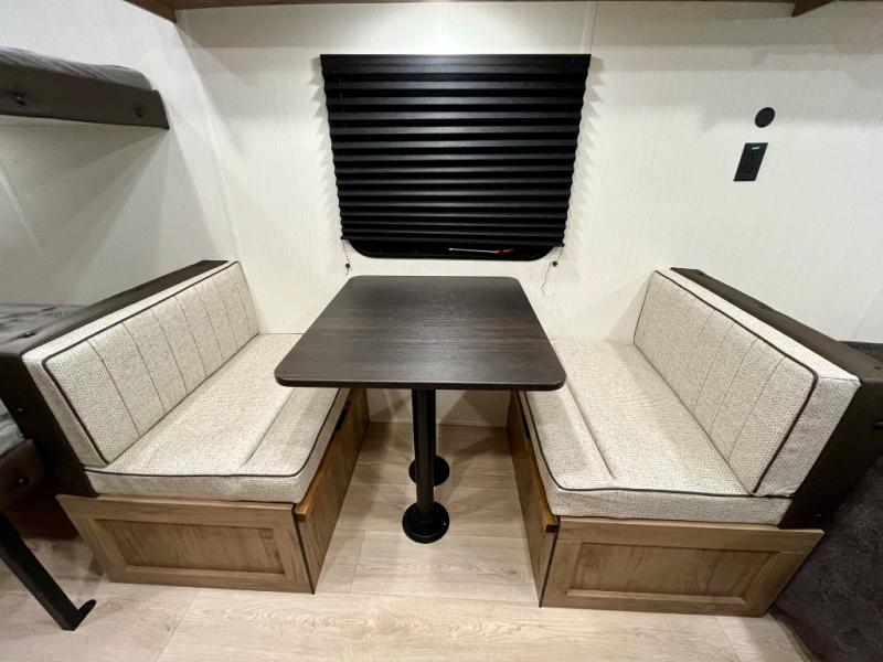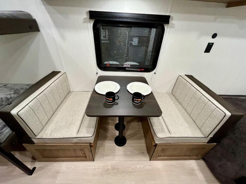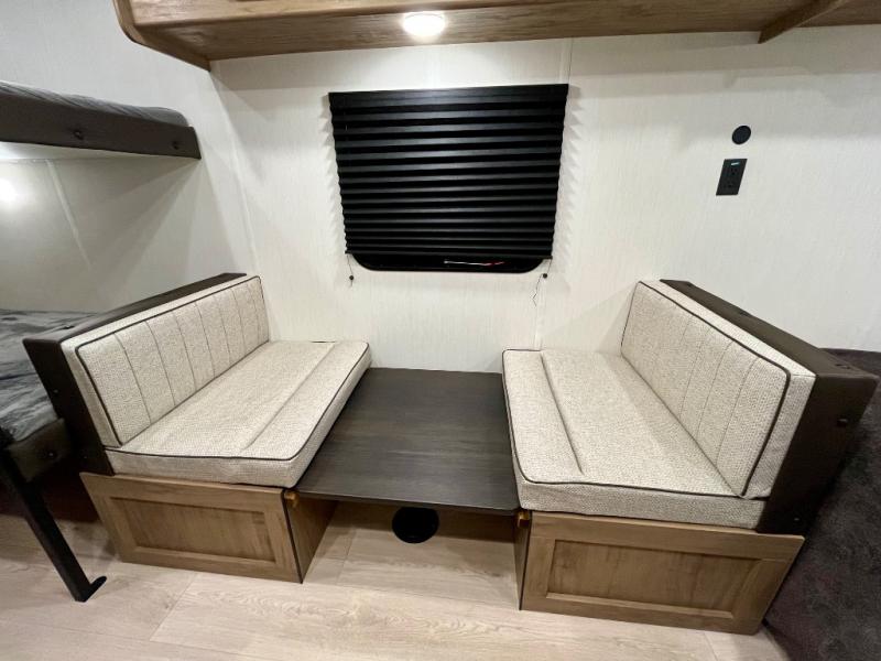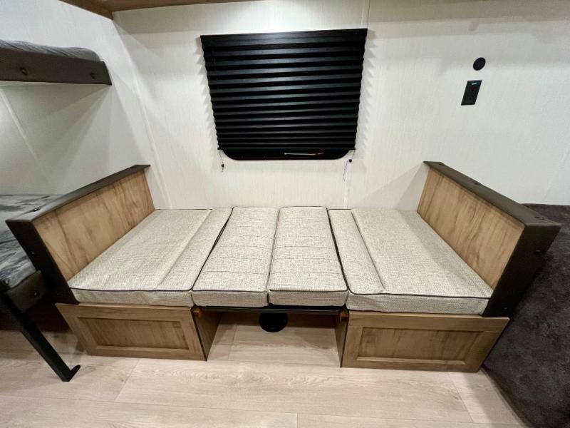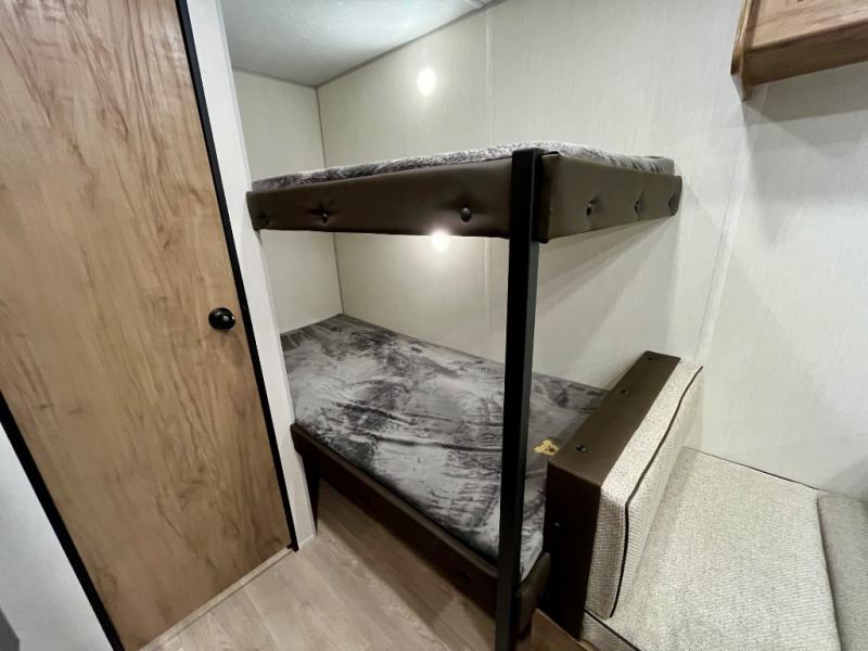 The whole family can sleep comfortably in this travel trailer! It has a set of bunk beds for the kids to sleep on, and you can sleep comfortably on the front queen bed with overhead cabinets and a shelf. The chef will enjoy preparing their best home cooked meals with the cooktop, and you can dine at the booth dinette. And the private bath onboard means you won't have to leave your camper in the middle of the night!