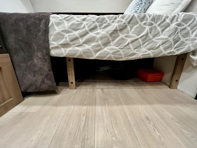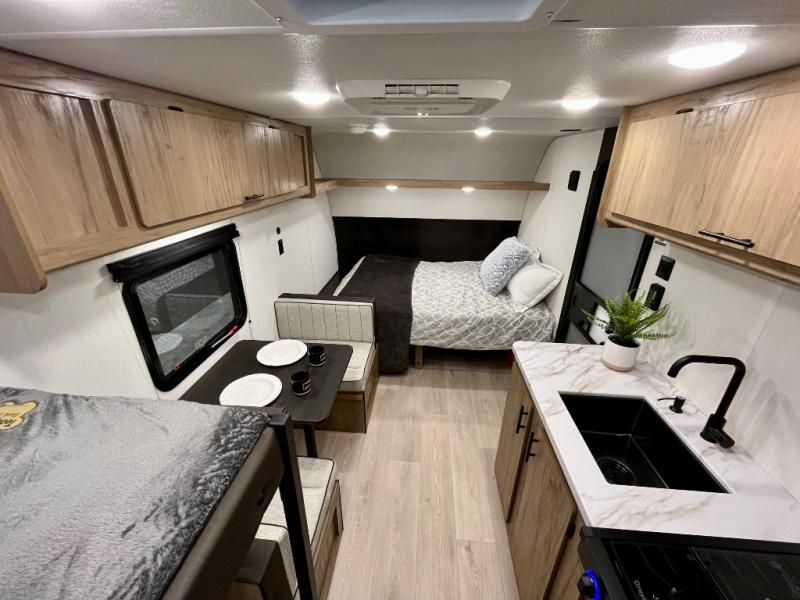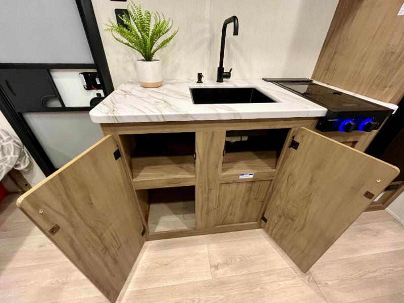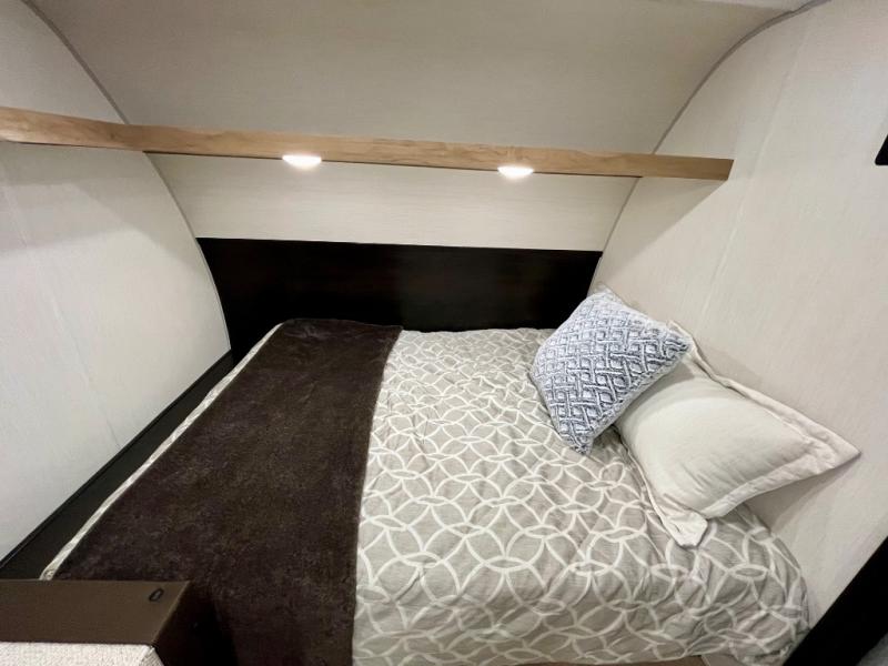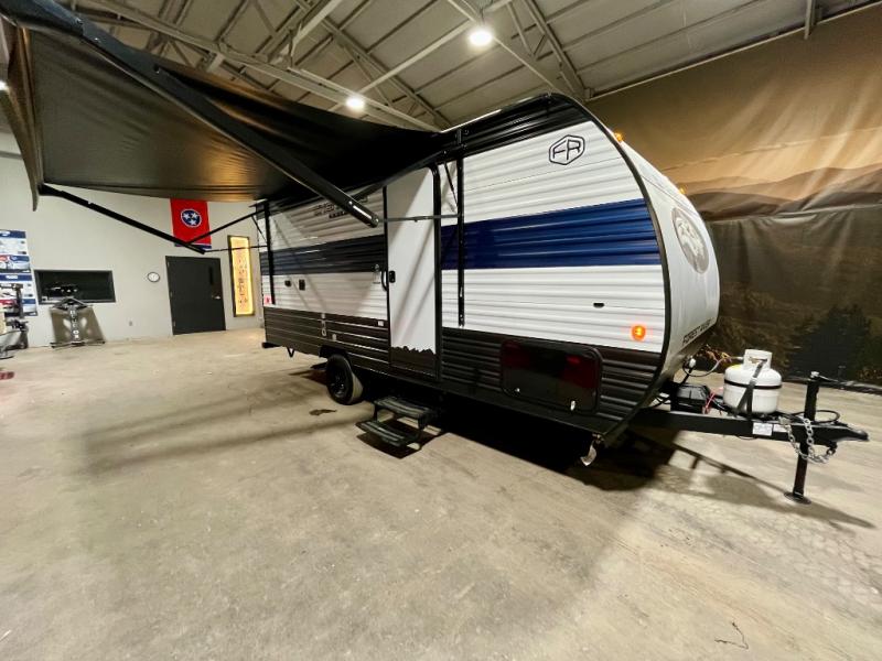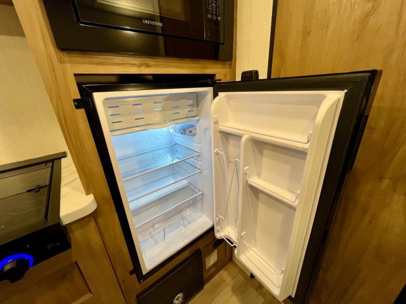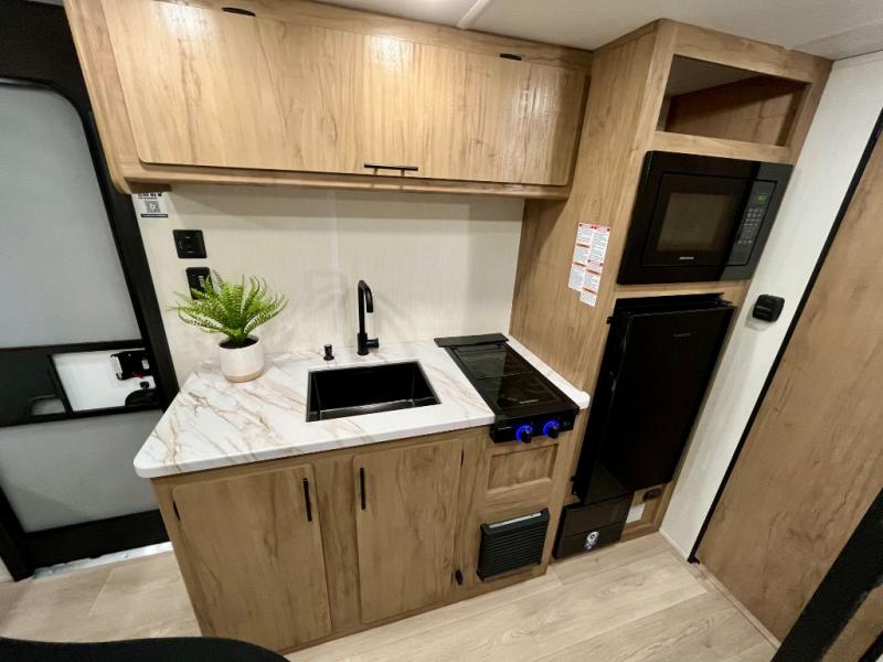 The whole family can sleep comfortably in this travel trailer! It has a set of bunk beds for the kids to sleep on, and you can sleep comfortably on the front queen bed with overhead cabinets and a shelf. The chef will enjoy preparing their best home cooked meals with the cooktop, and you can dine at the booth dinette. And the private bath onboard means you won't have to leave your camper in the middle of the night!
