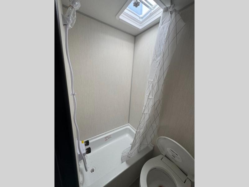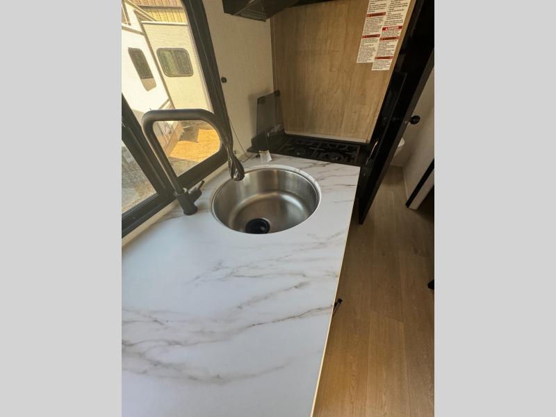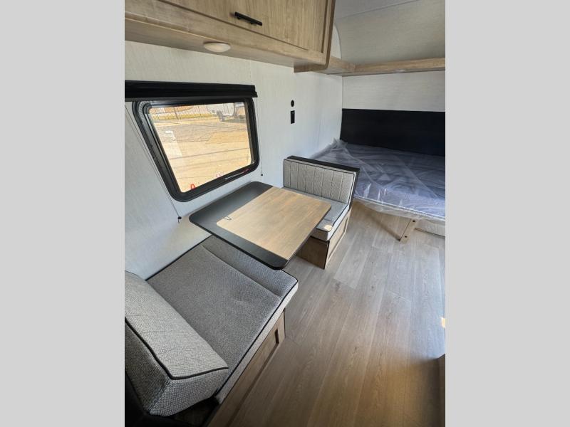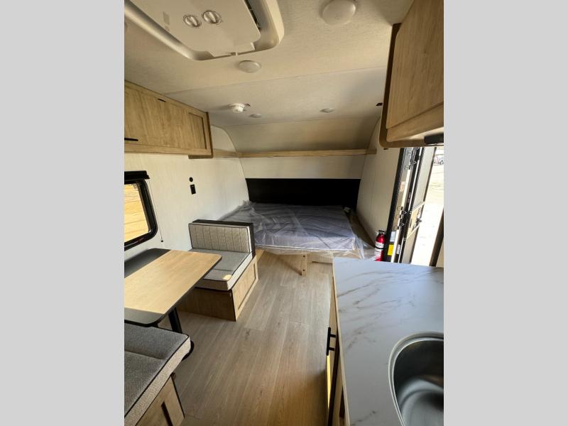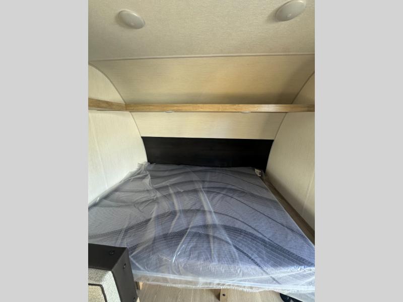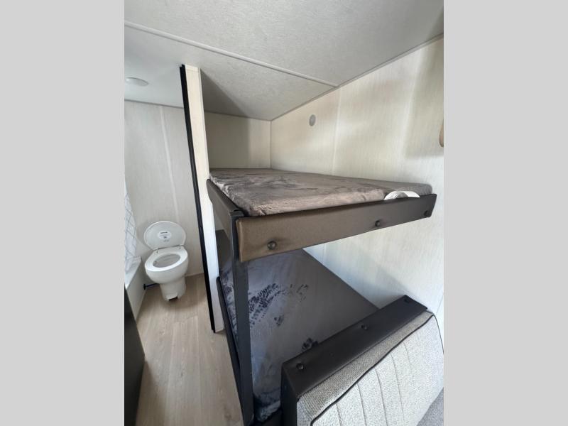 The whole family can sleep comfortably in this travel trailer! It has a set of bunk beds for the kids to sleep on, and you can sleep comfortably on the front queen bed with overhead cabinets and a shelf. The chef will enjoy preparing their best home cooked meals with the cooktop, and you can dine at the booth dinette. And the private bath onboard means you won't have to leave your camper in the middle of the night!