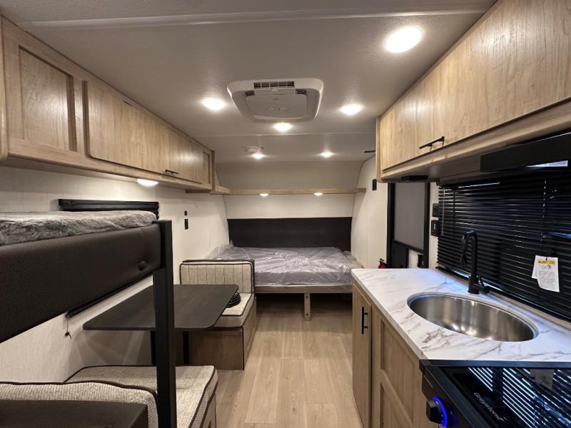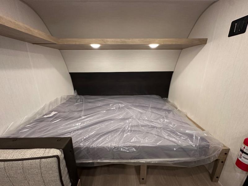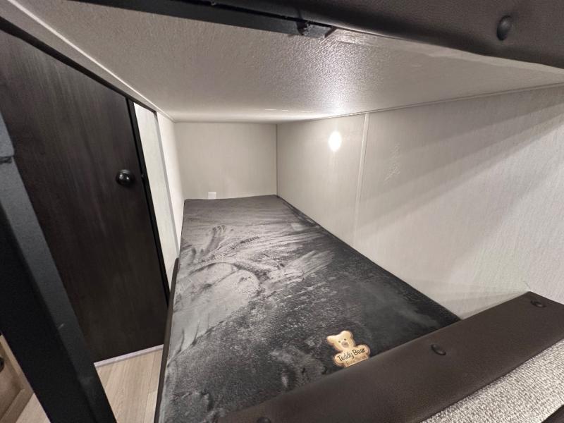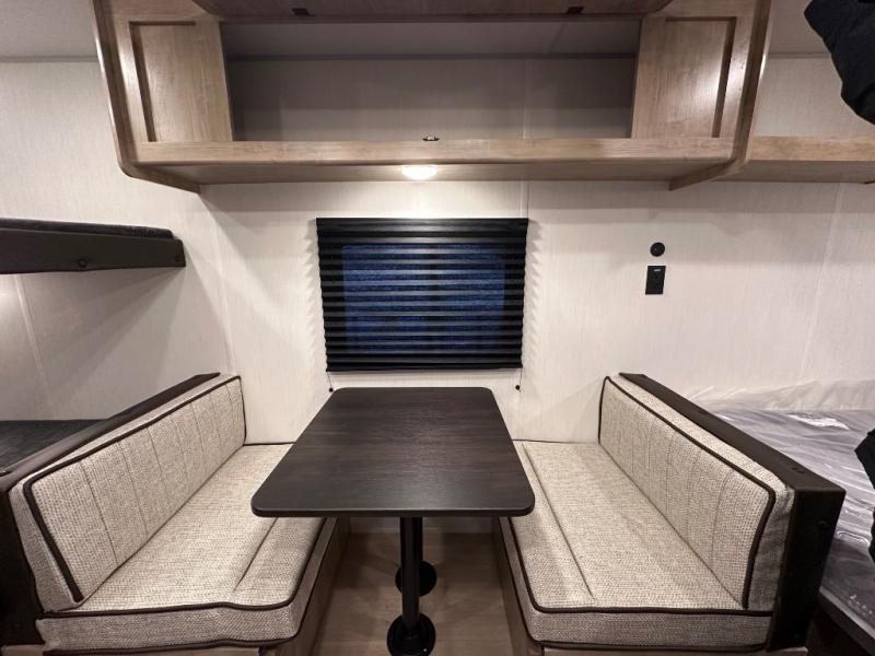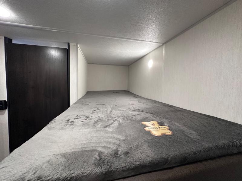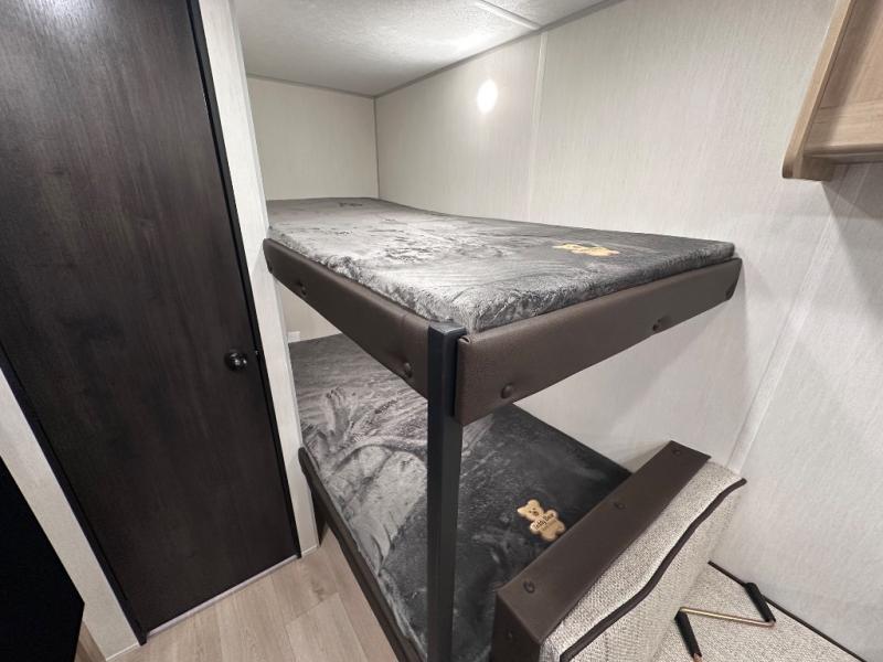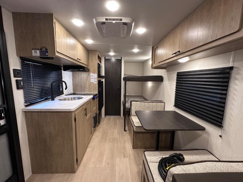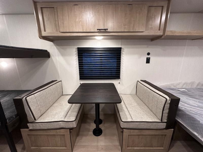 The whole family can sleep comfortably in this travel trailer! It has a set of bunk beds for the kids to sleep on, and you can sleep comfortably on the front queen bed with overhead cabinets and a shelf. The chef will enjoy preparing their best home cooked meals with the cooktop, and you can dine at the booth dinette. And the private bath onboard means you won't have to leave your camper in the middle of the night!