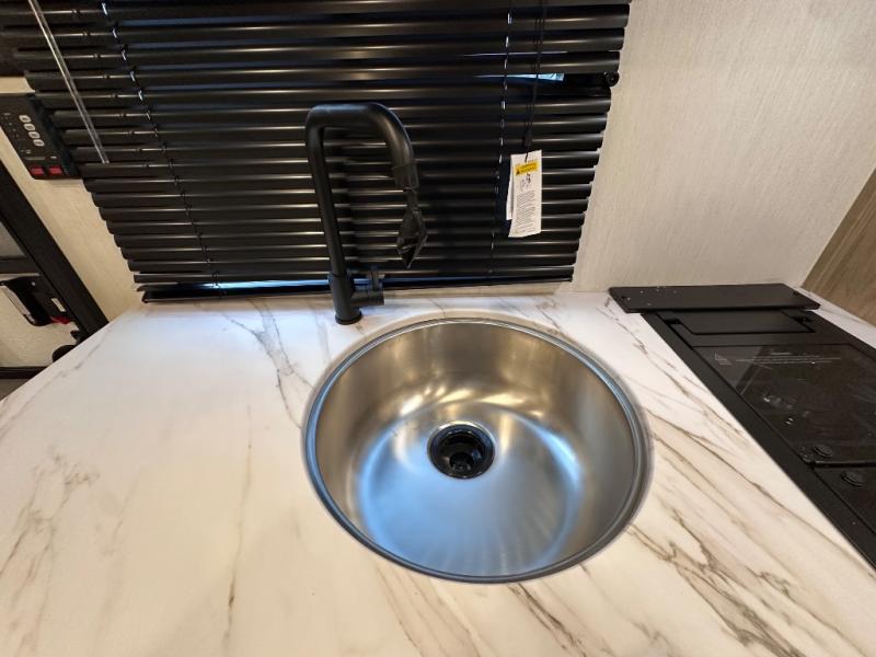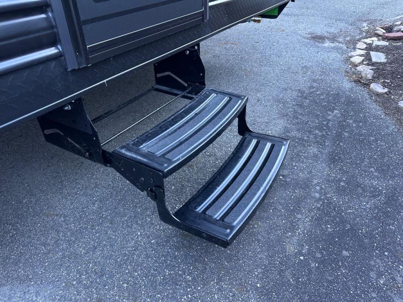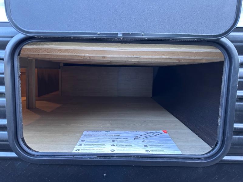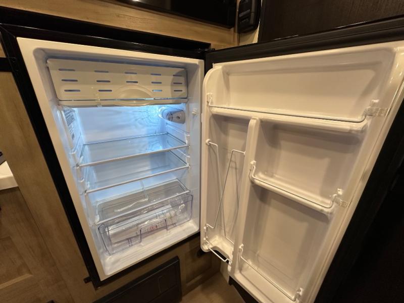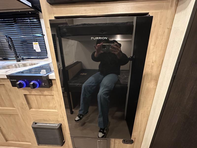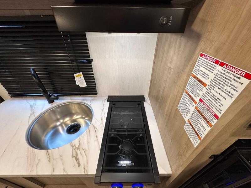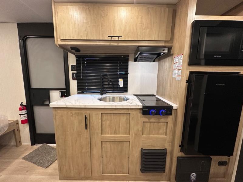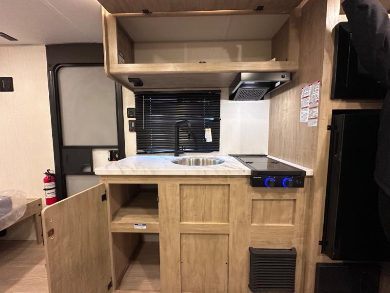 The whole family can sleep comfortably in this travel trailer! It has a set of bunk beds for the kids to sleep on, and you can sleep comfortably on the front queen bed with overhead cabinets and a shelf. The chef will enjoy preparing their best home cooked meals with the cooktop, and you can dine at the booth dinette. And the private bath onboard means you won't have to leave your camper in the middle of the night!