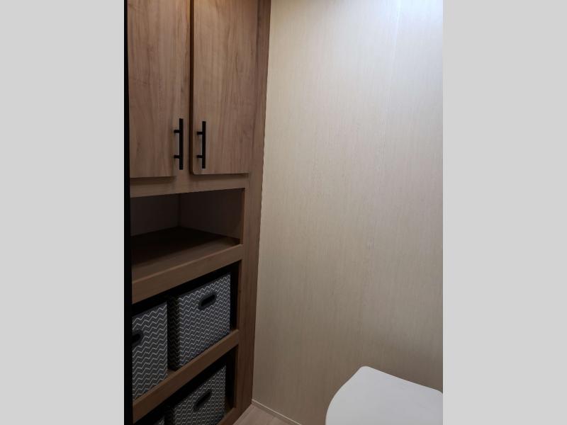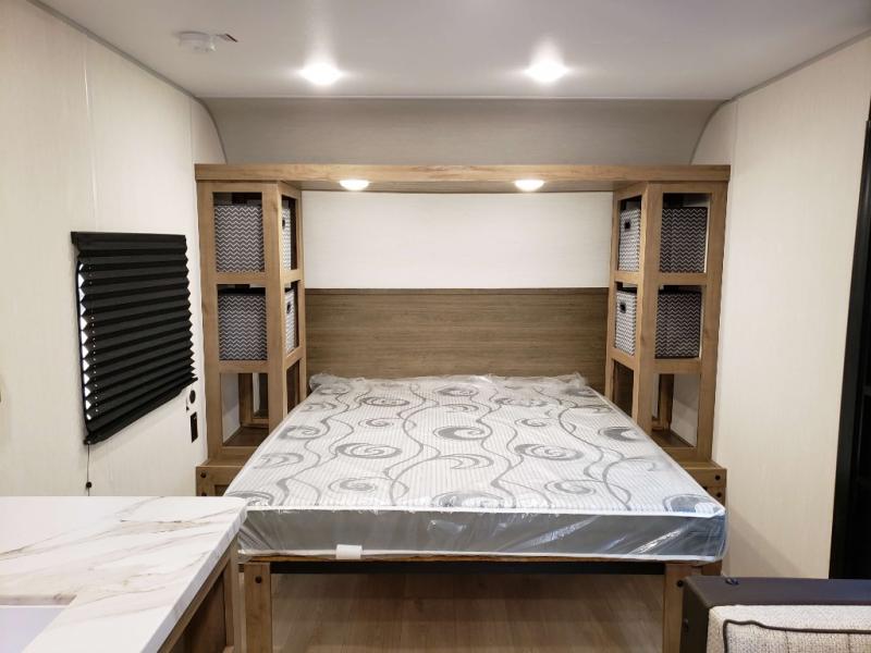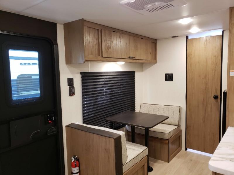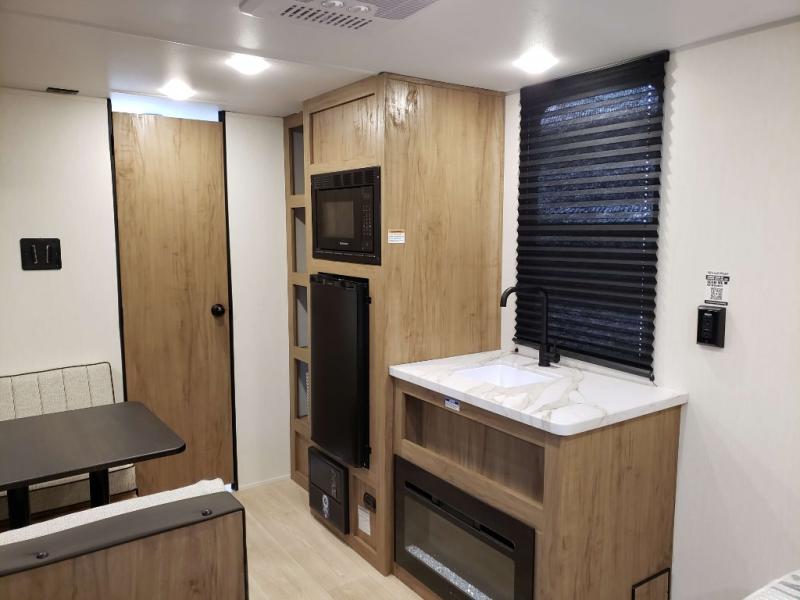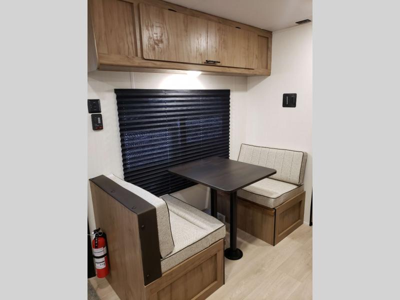 You will love weekends at the lake in this all-electric travel trailer that can sleep three each night! The front queen bed includes dual storage drawers on either side of the bed to keep your clothes tidy, and there is a shelf above the bed to keep books! After you've made breakfast, you can dine at the booth dinette and cleanup will be easy with the rectangle sink. A spacious full rear bath lets you clean up each day, and there is a closet with shelves to keep towels and toiletries. You'll find additional storage in the pantry with shelves next to the refrigerator and outside storage for camp chairs, tools, and more!