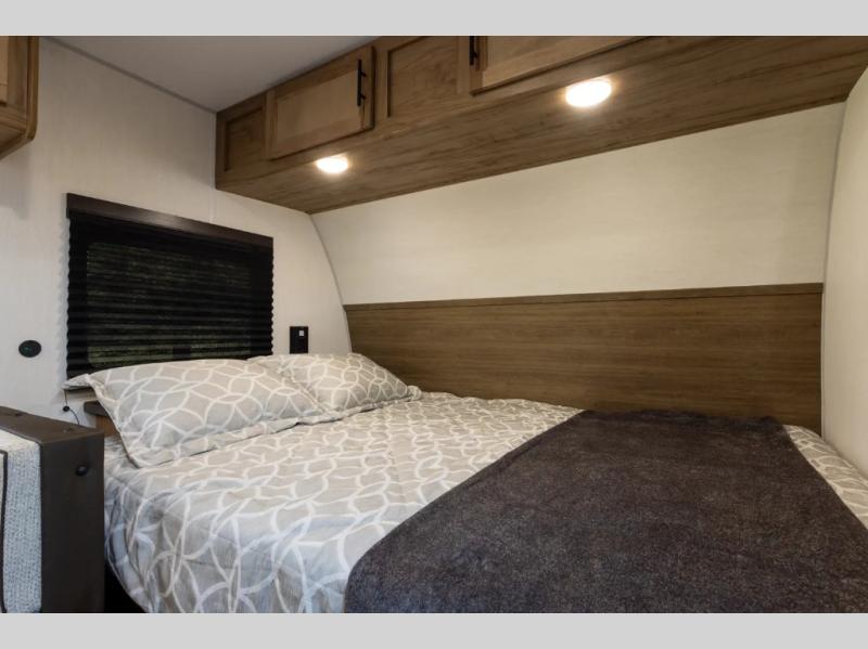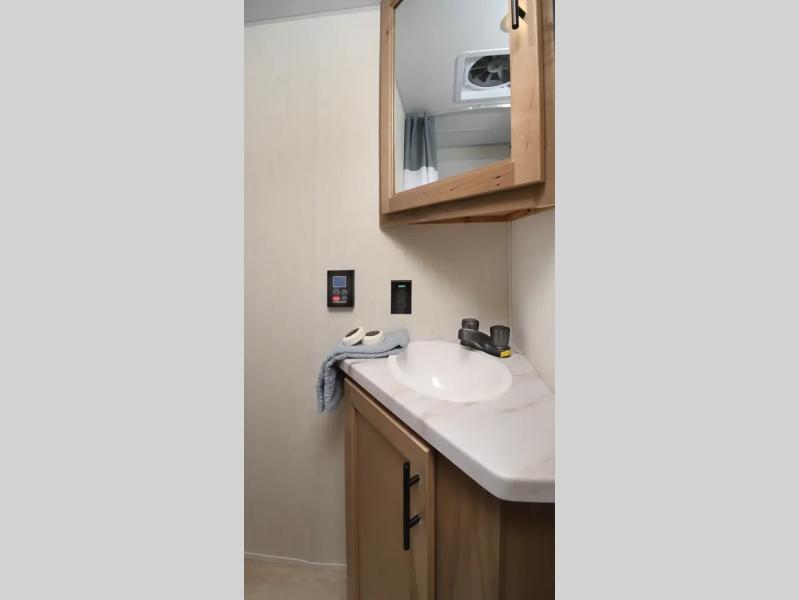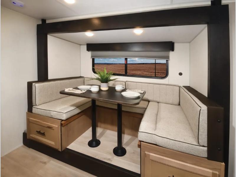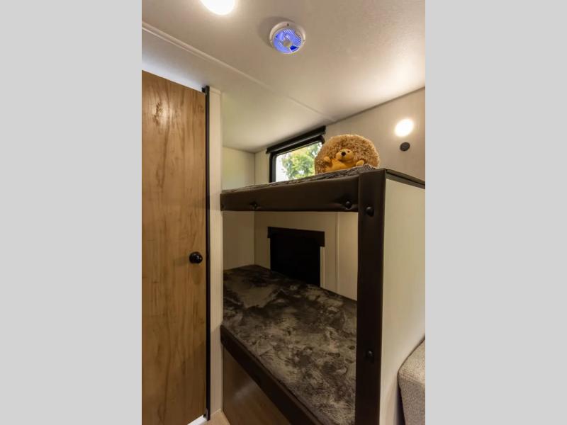 This family travel trailer is ready to head to the campground whenever you are! The kiddos can sleep on the set of double-size bed bunks and you can sleep on the front queen bed, plus the U-shaped dinette slide can also transform into an extra sleeping space when you aren't using it to enjoy a meal prepared with the high output cooktop. You can also prepare your delicious meals at the outside mini kitchen and stay protected by the power awning. The exterior not only has outside storage and an outside TV mount, but also features an outside storage plus door for access to the storage space underneath the bottom bunk bed. The rear corner bath allows everyone to stay clean and refreshed while you camp.
