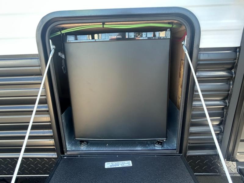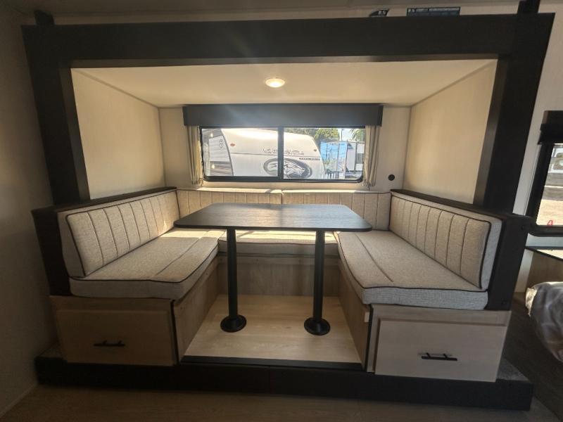 This family travel trailer is ready to head to the campground whenever you are! The kiddos can sleep on the set of double-size bed bunks and you can sleep on the front queen bed, plus the U-shaped dinette slide can also transform into an extra sleeping space when you aren't using it to enjoy a meal prepared with the high output cooktop. You can also prepare your delicious meals at the outside mini kitchen and stay protected by the power awning. The exterior not only has outside storage and an outside TV mount, but also features an outside storage plus door for access to the storage space underneath the bottom bunk bed. The rear corner bath allows everyone to stay clean and refreshed while you camp.