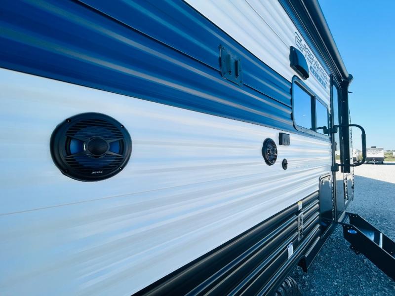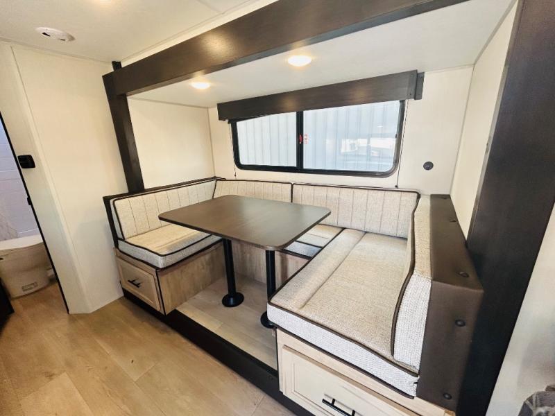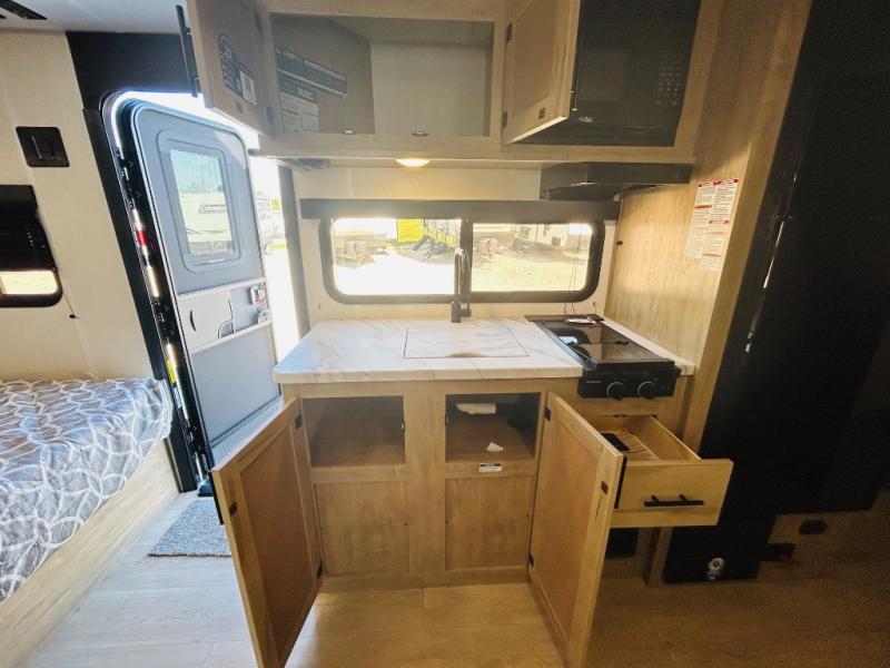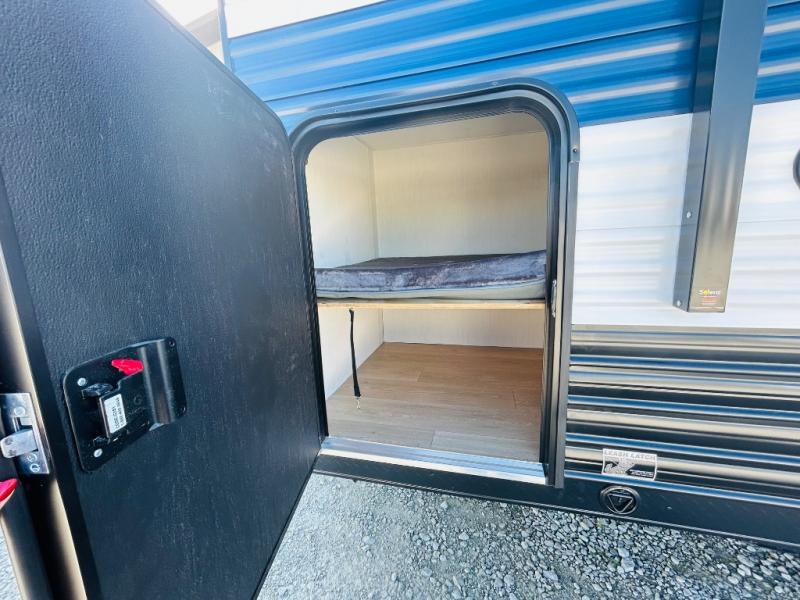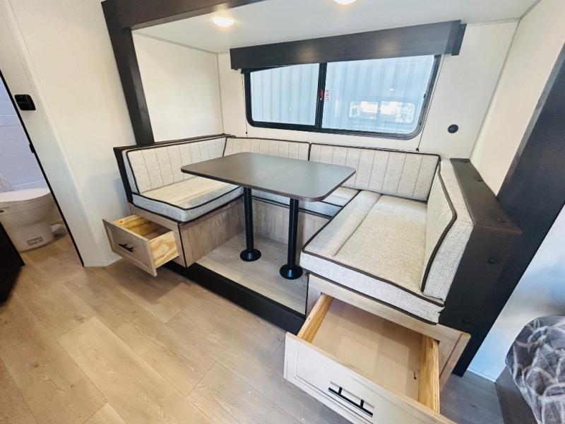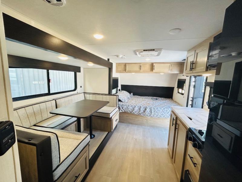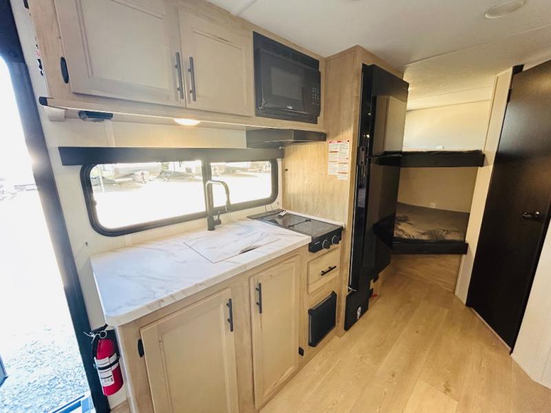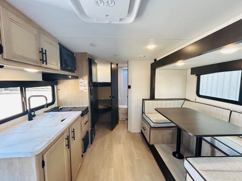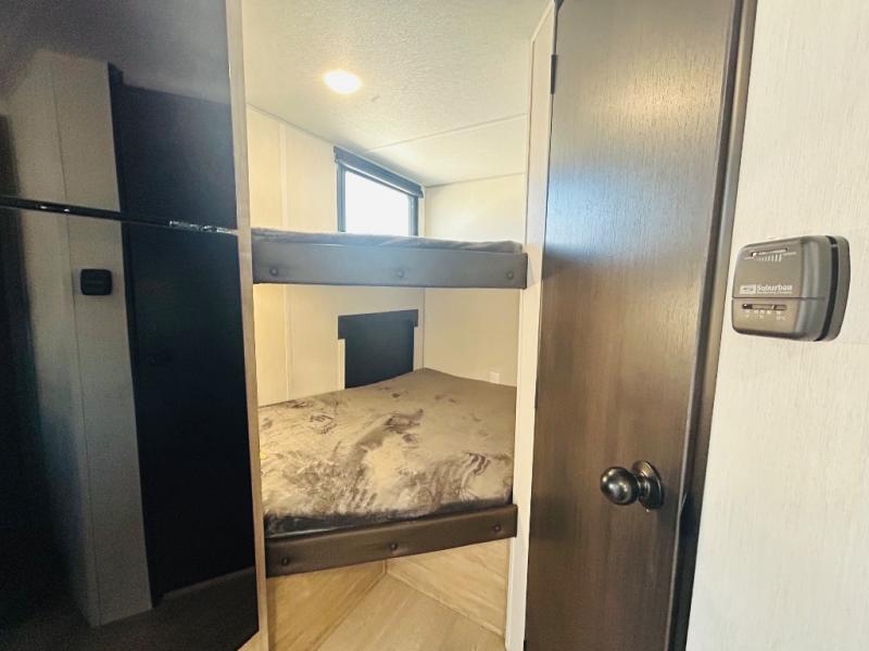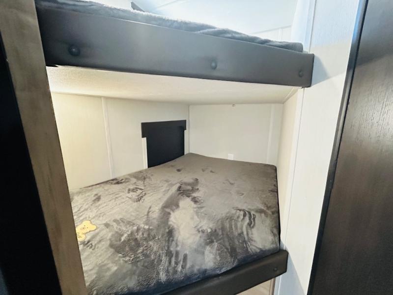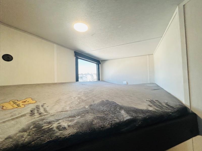 This family travel trailer is ready to head to the campground whenever you are! The kiddos can sleep on the set of double-size bed bunks, and you can sleep on the front queen bed, plus the U-shaped dinette slide can also transform into an extra sleeping space when you aren't using it to enjoy a meal prepared with the cooktop. You can also prepare your delicious meals at the outside mini kitchen and stay protected by the power awning. The exterior not only has outside storage and an outside TV mount but also features an outside storage plus door for access to the storage space underneath the bottom bunk bed. The rear corner bath allows everyone to stay clean and refreshed while you camp.