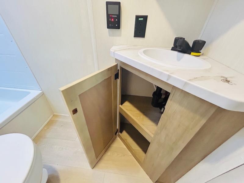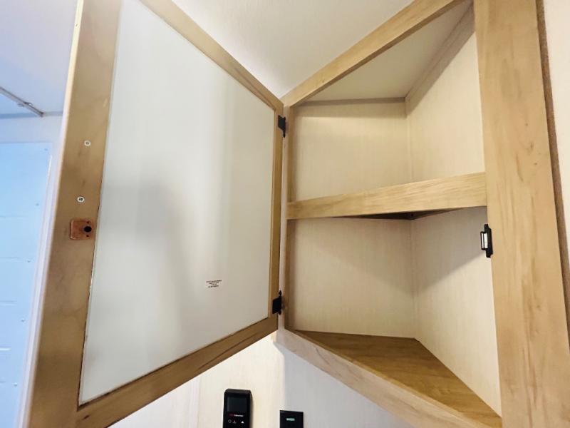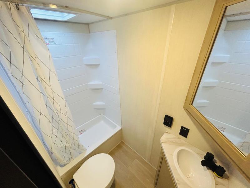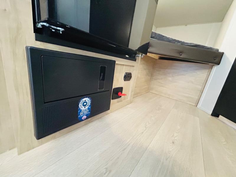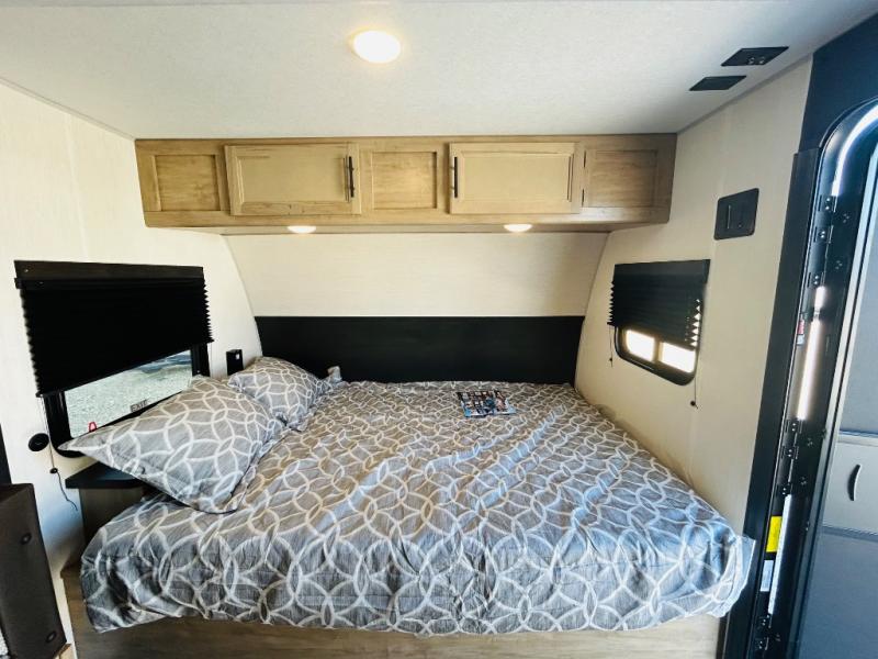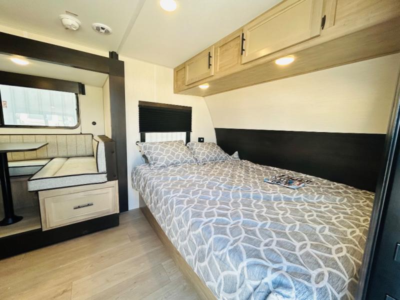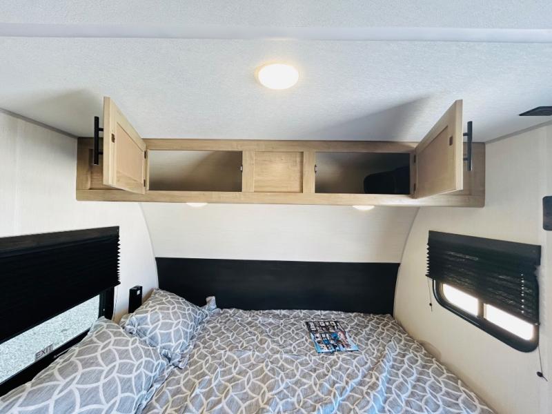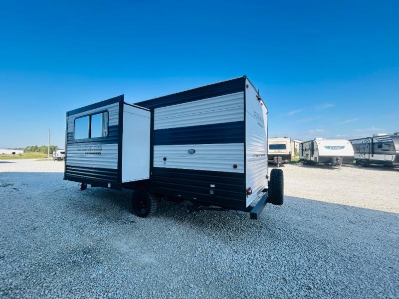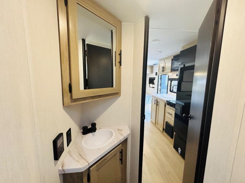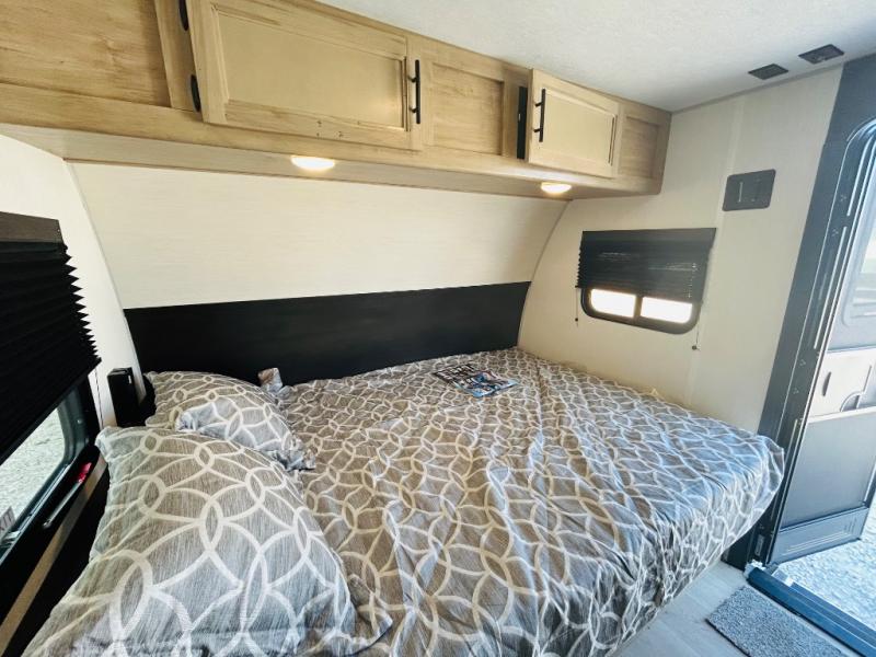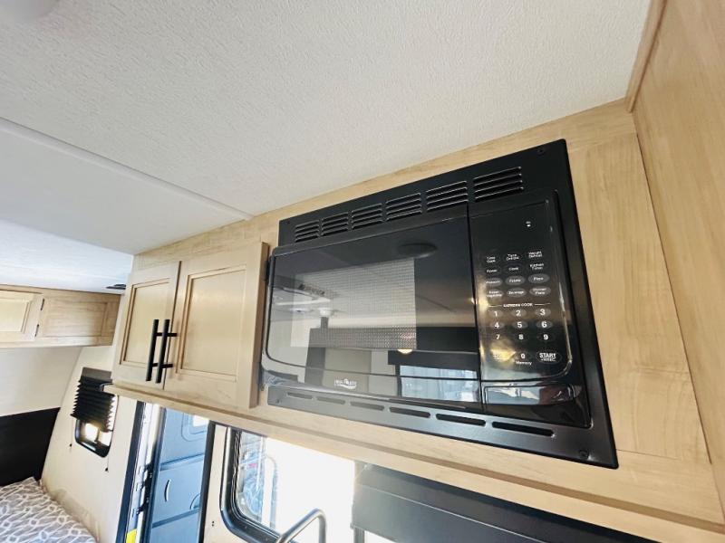 This family travel trailer is ready to head to the campground whenever you are! The kiddos can sleep on the set of double-size bed bunks, and you can sleep on the front queen bed, plus the U-shaped dinette slide can also transform into an extra sleeping space when you aren't using it to enjoy a meal prepared with the cooktop. You can also prepare your delicious meals at the outside mini kitchen and stay protected by the power awning. The exterior not only has outside storage and an outside TV mount but also features an outside storage plus door for access to the storage space underneath the bottom bunk bed. The rear corner bath allows everyone to stay clean and refreshed while you camp.
