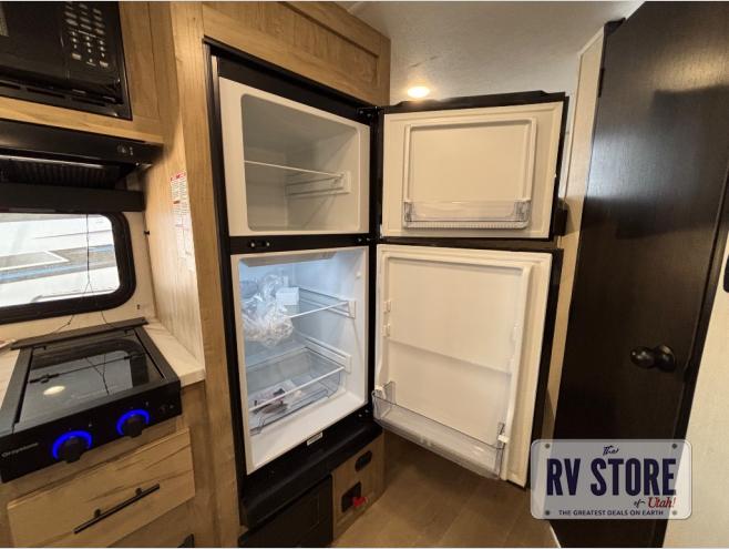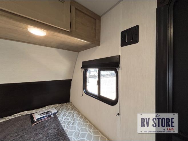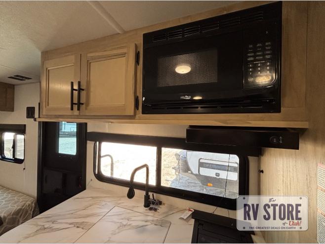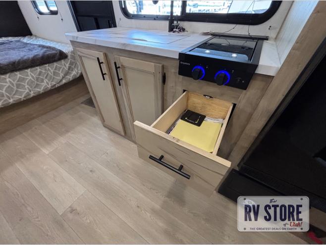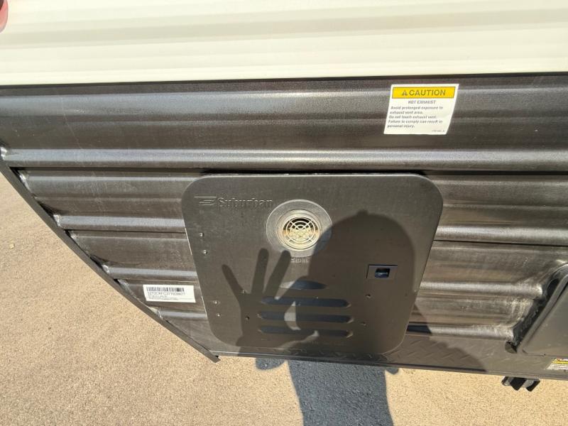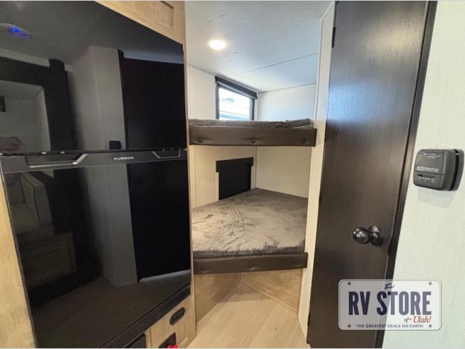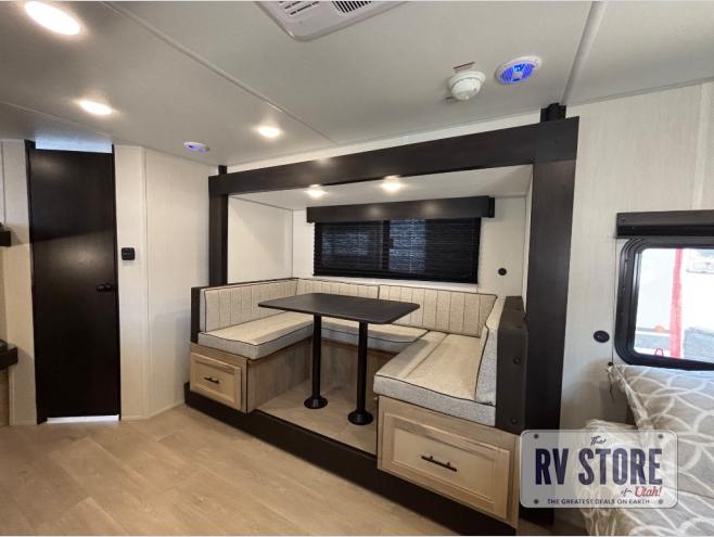 This family travel trailer is ready to head to the campground whenever you are! The kiddos can sleep on the set of double-size bed bunks and you can sleep on the front queen bed, plus the U-shaped dinette slide can also transform into an extra sleeping space when you aren't using it to enjoy a meal prepared with the high output cooktop. You can also prepare your delicious meals at the outside mini kitchen and stay protected by the power awning. The exterior not only has outside storage and an outside TV mount, but also features an outside storage plus door for access to the storage space underneath the bottom bunk bed. The rear corner bath allows everyone to stay clean and refreshed while you camp.