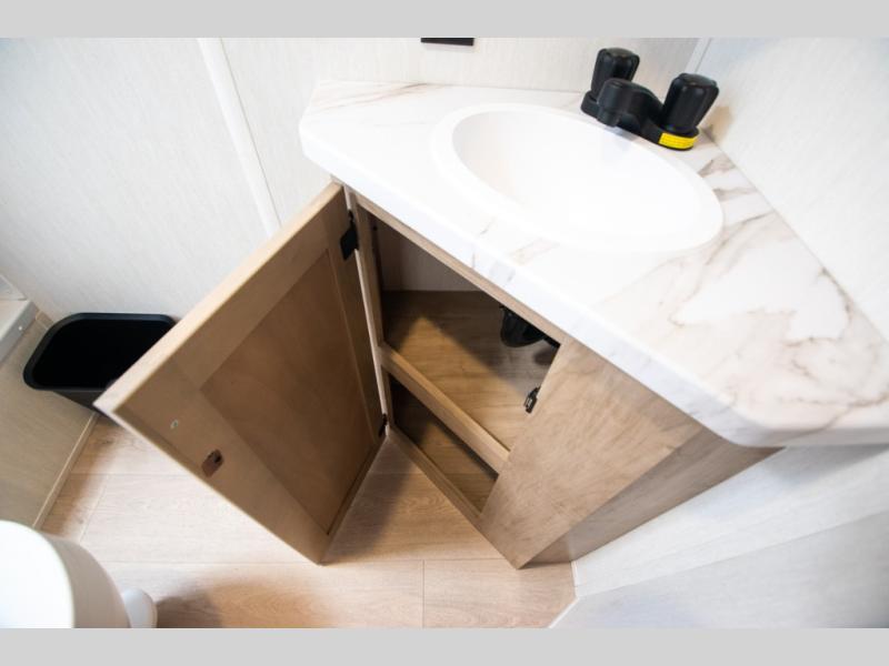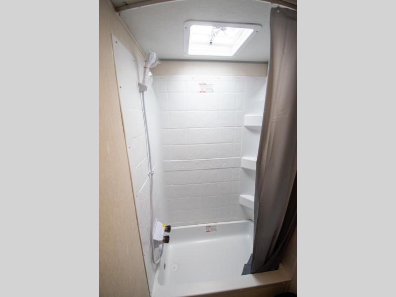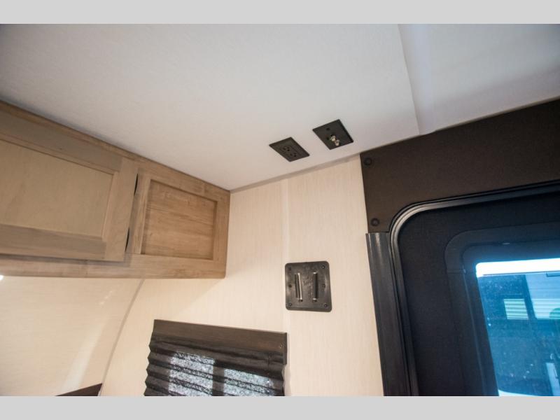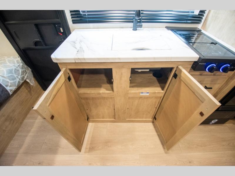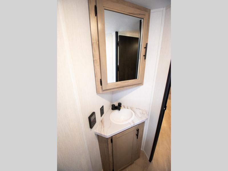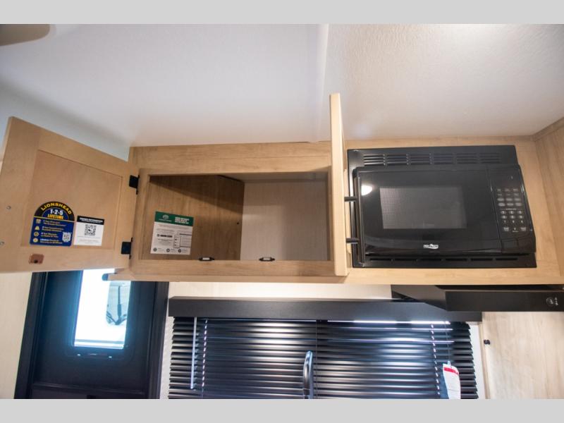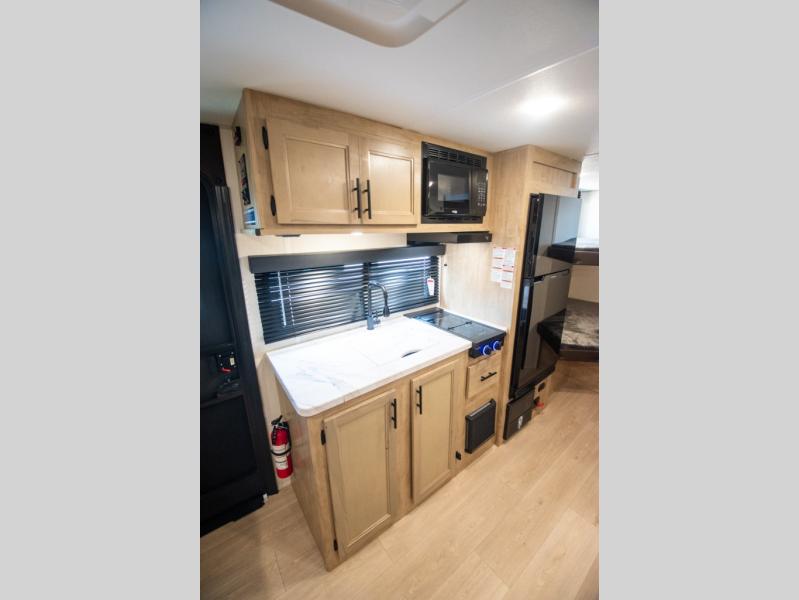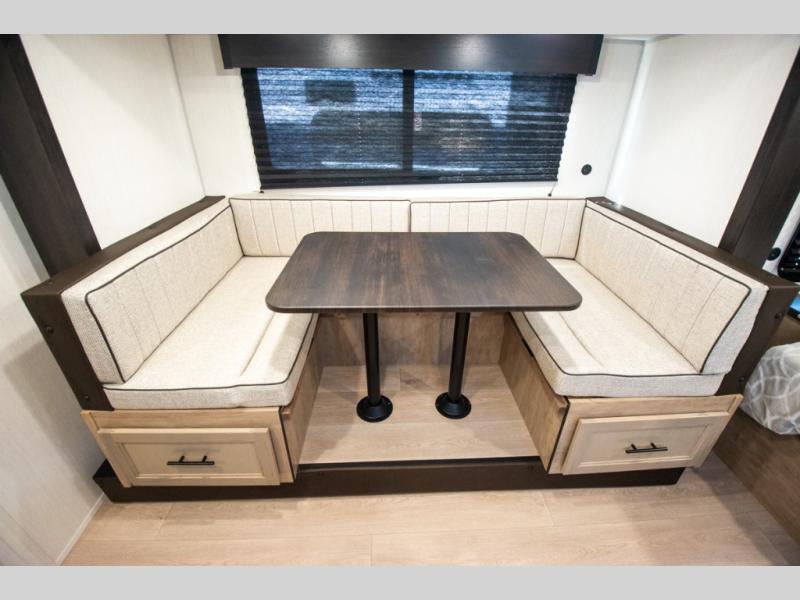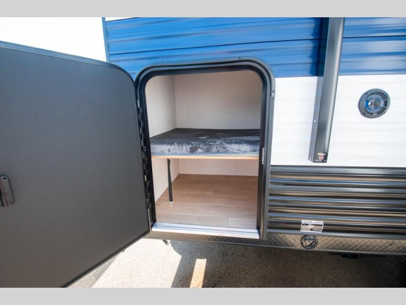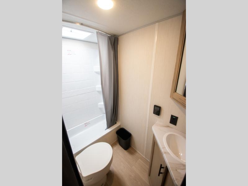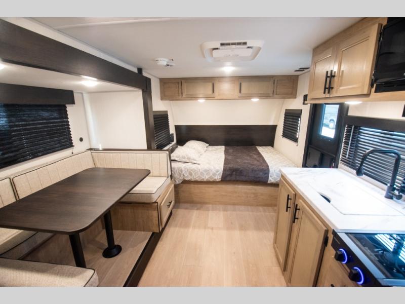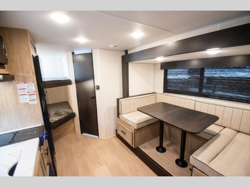 This family travel trailer is ready to head to the campground whenever you are! The kiddos can sleep on the set of double-size bed bunks and you can sleep on the front queen bed, plus the U-shaped dinette slide can also transform into an extra sleeping space when you aren't using it to enjoy a meal prepared with the high output cooktop. You can also prepare your delicious meals at the outside mini kitchen and stay protected by the power awning. The exterior not only has outside storage and an outside TV mount, but also features an outside storage plus door for access to the storage space underneath the bottom bunk bed. The rear corner bath allows everyone to stay clean and refreshed while you camp.