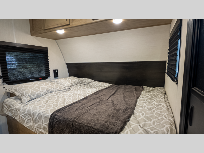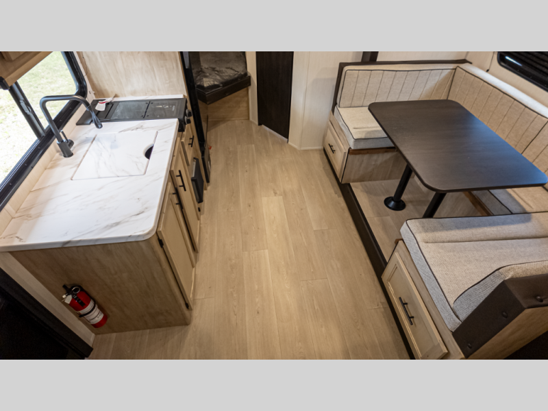 A: The 17JW fits snugly under 24 ft and weighs ~4,311 lb dry, yet delivers a full U-shaped dinette slide, owner queen bed, rear wet bath, chef-ready kitchen, and outdoor cooking station—plus 200 W solar and rugged extras for true camp-readiness.