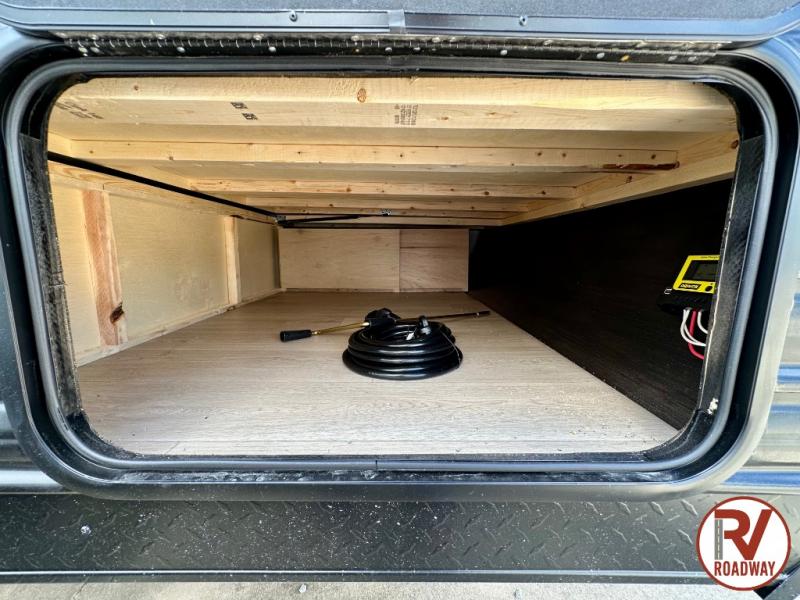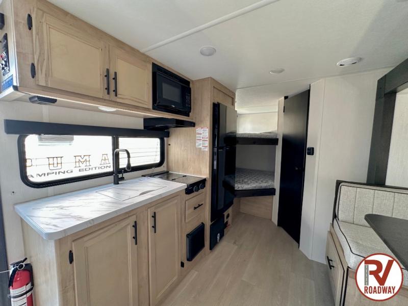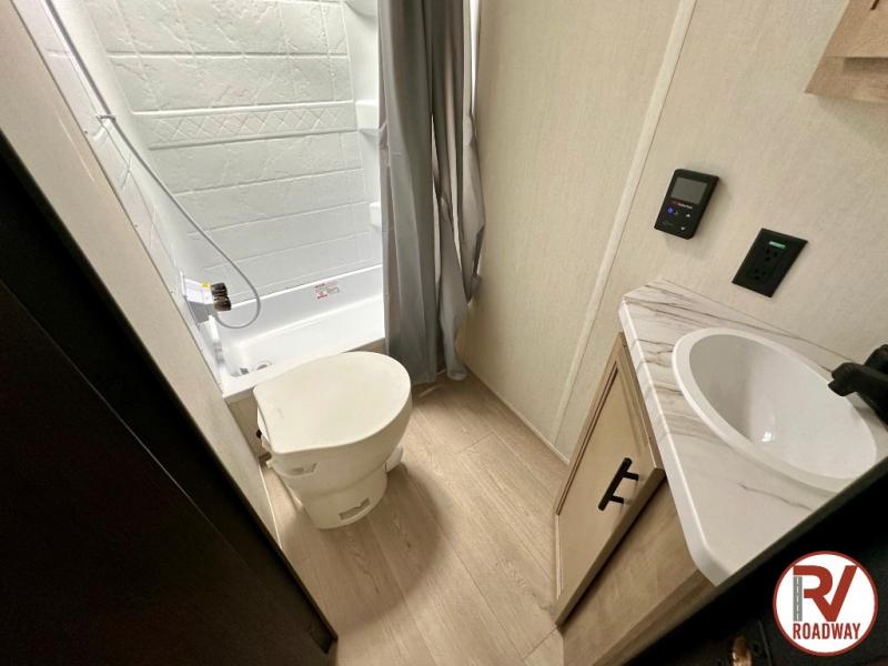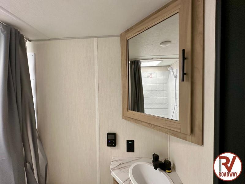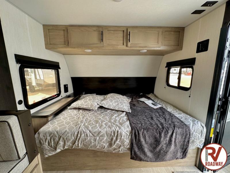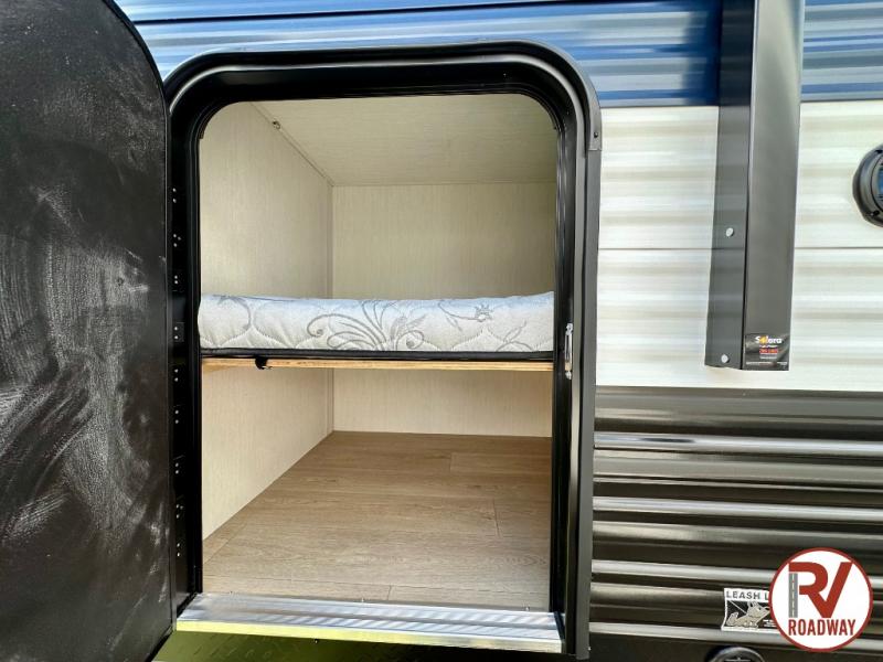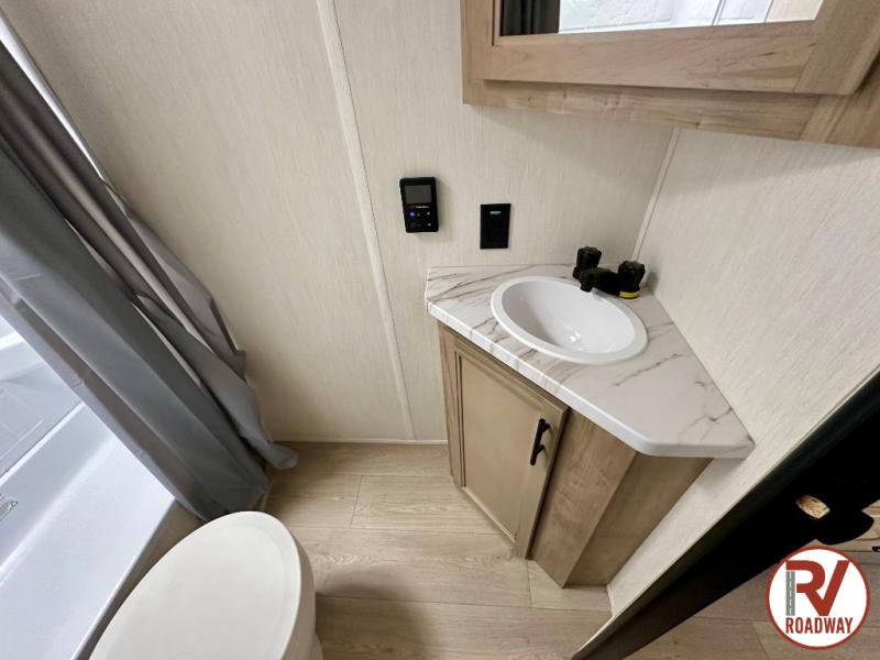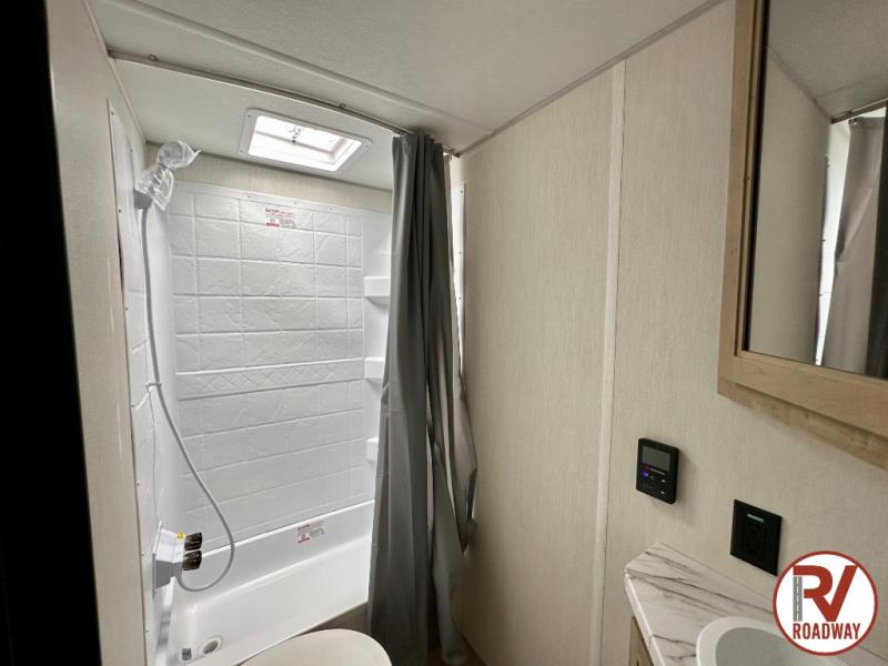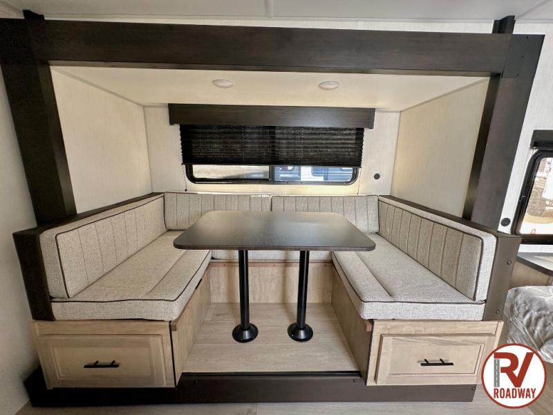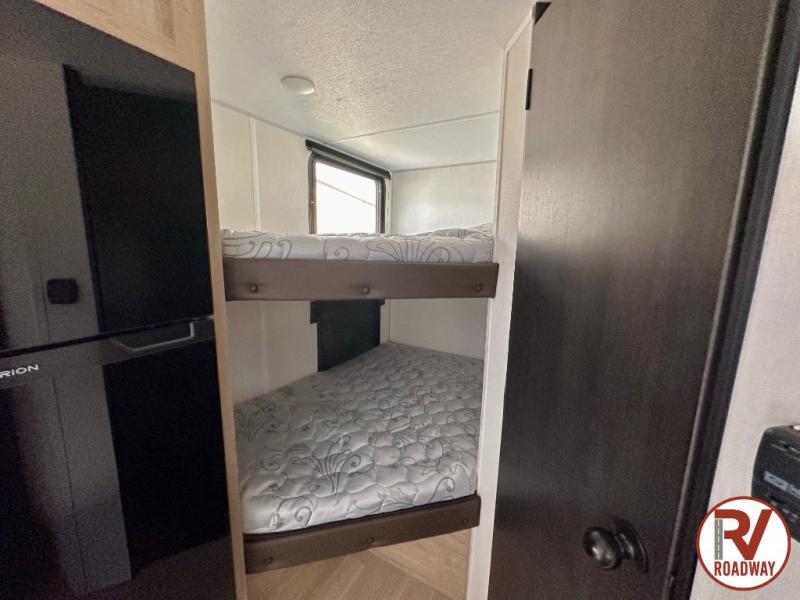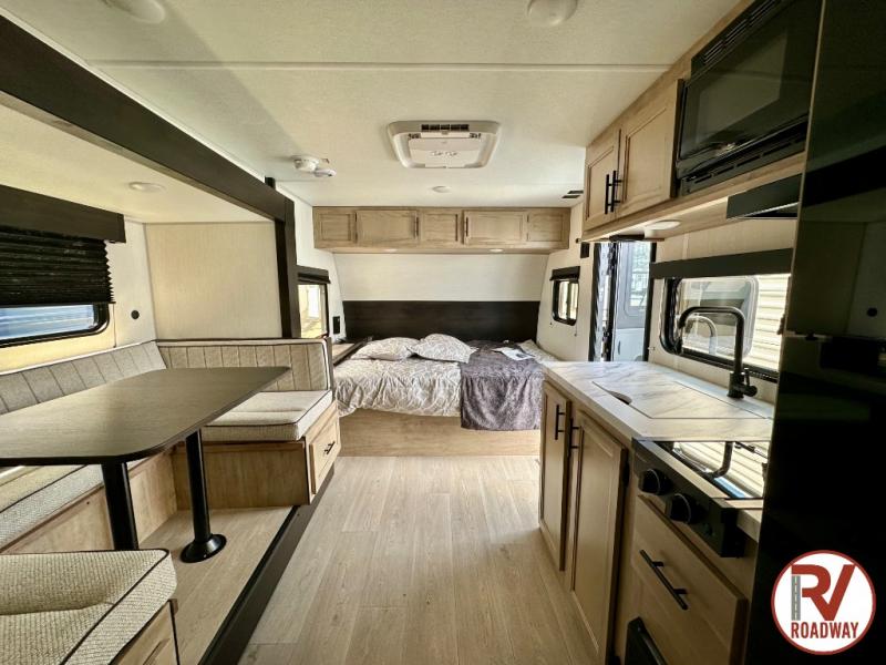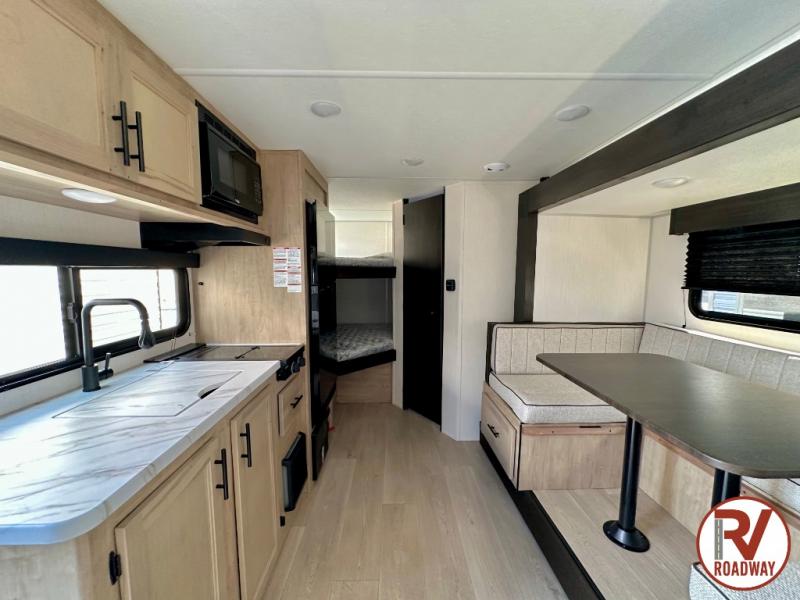 This family travel trailer is ready to head to the campground whenever you are! The kiddos can sleep on the set of double-size bed bunks and you can sleep on the front queen bed, plus the U-shaped dinette slide can also transform into an extra sleeping space when you aren't using it to enjoy a meal prepared with the high output cooktop. You can also prepare your delicious meals at the outside mini kitchen and stay protected by the power awning. The exterior not only has outside storage and an outside TV mount, but also features an outside storage plus door for access to the storage space underneath the bottom bunk bed. The rear corner bath allows everyone to stay clean and refreshed while you camp.