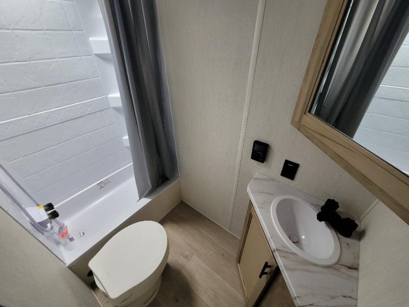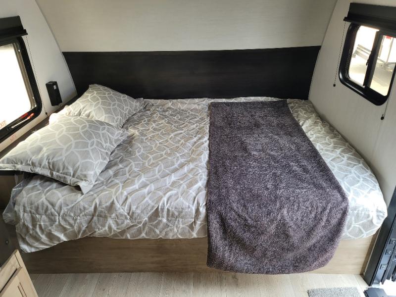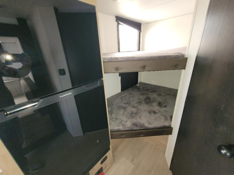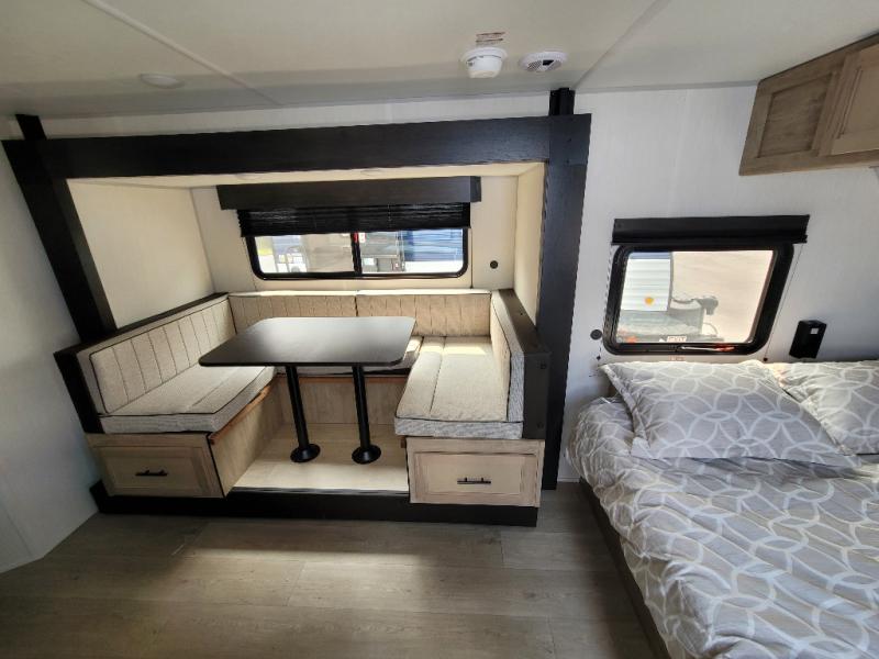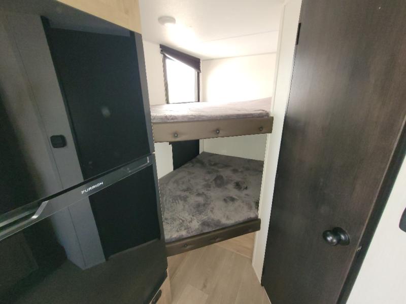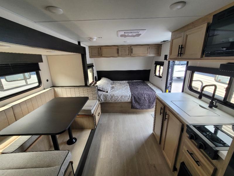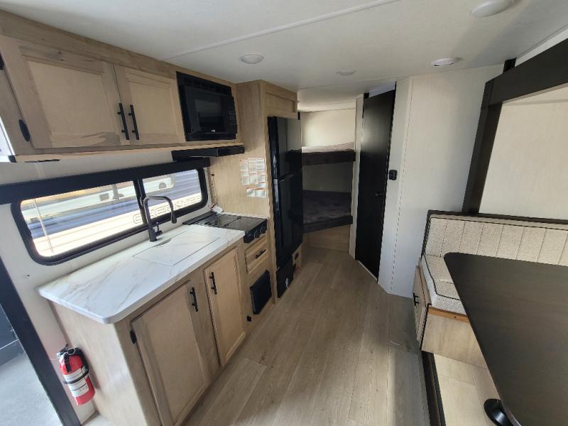 This family travel trailer is ready to head to the campground whenever you are! The kiddos can sleep on the set of double-size bed bunks and you can sleep on the front queen bed, plus the U-shaped dinette slide can also transform into an extra sleeping space when you aren't using it to enjoy a meal prepared with the high output cooktop. You can also prepare your delicious meals at the outside mini kitchen and stay protected by the power awning. The exterior not only has outside storage and an outside TV mount, but also features an outside storage plus door for access to the storage space underneath the bottom bunk bed. The rear corner bath allows everyone to stay clean and refreshed while you camp.