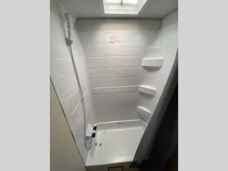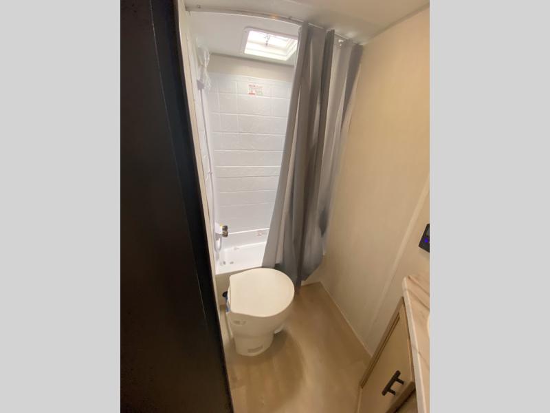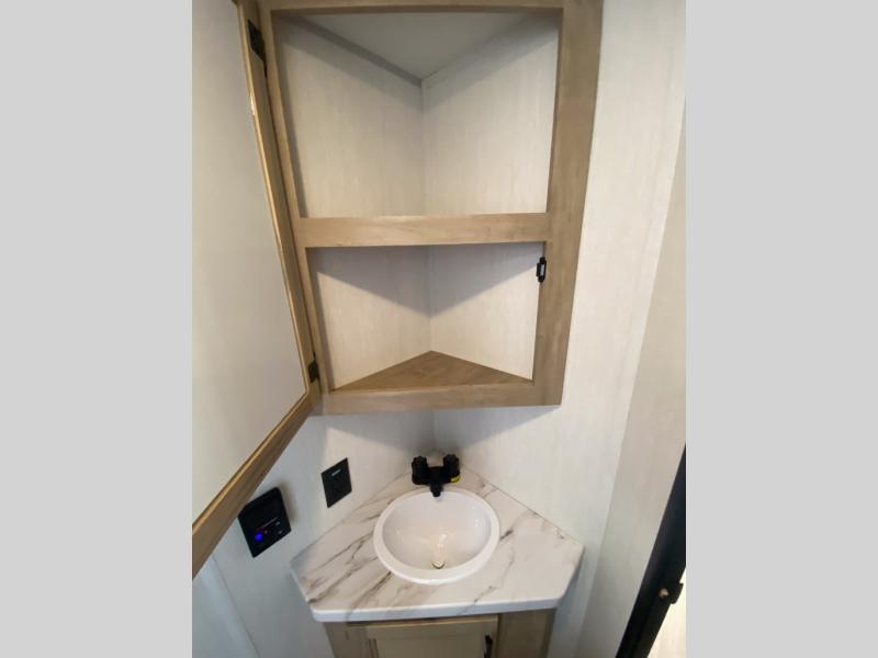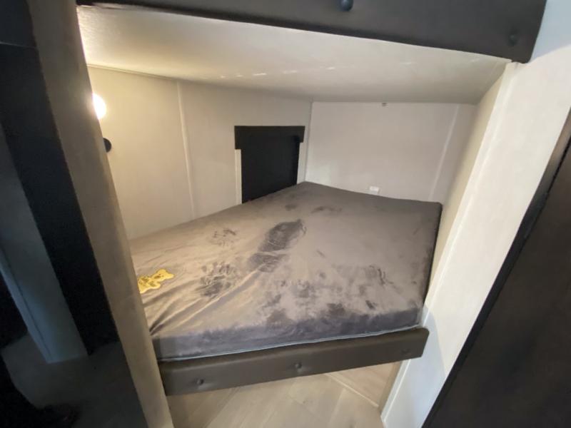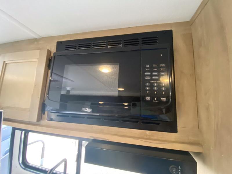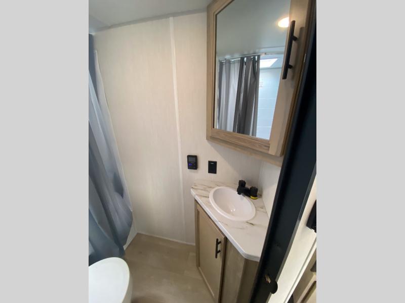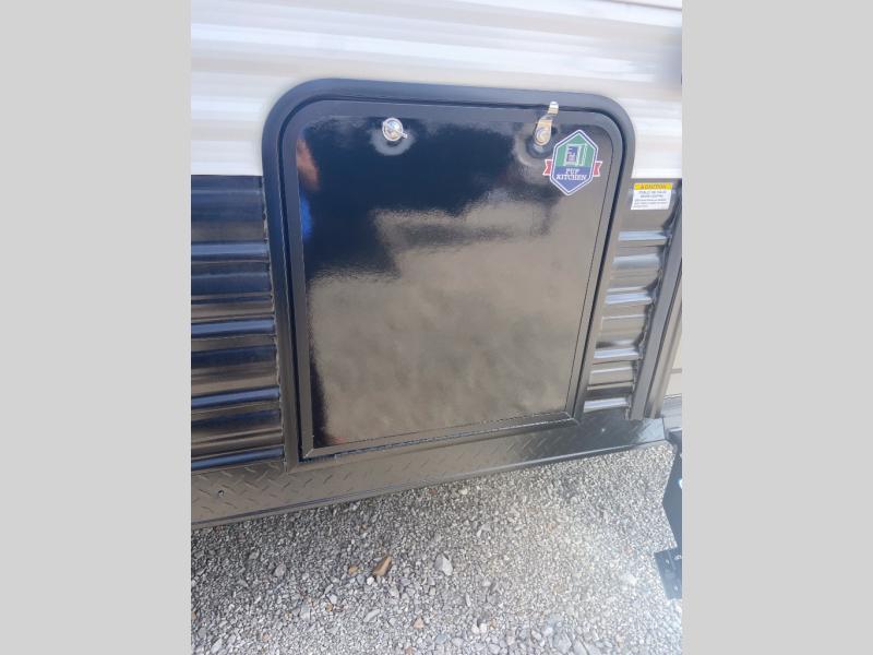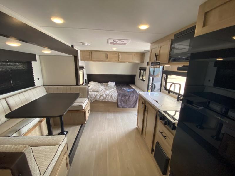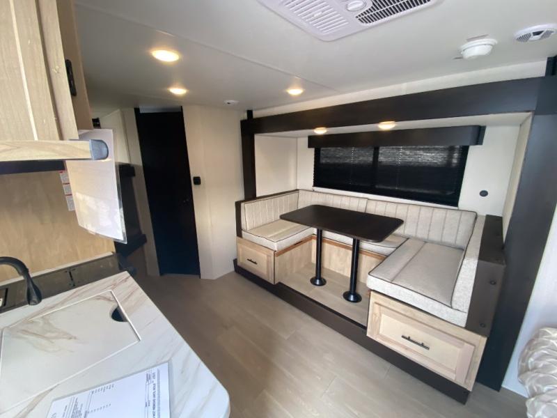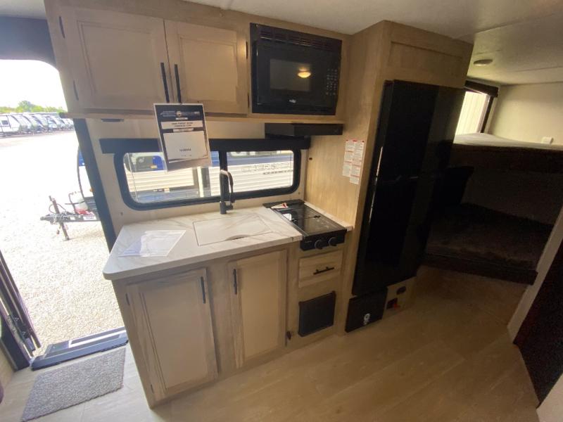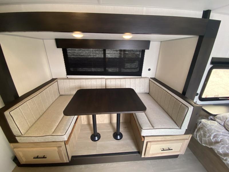 This family travel trailer is ready to head to the campground whenever you are! The kiddos can sleep on the set of double-size bed bunks and you can sleep on the front queen bed, plus the U-shaped dinette slide can also transform into an extra sleeping space when you aren't using it to enjoy a meal prepared with the high output cooktop. You can also prepare your delicious meals at the outside mini kitchen and stay protected by the power awning. The exterior not only has outside storage and an outside TV mount, but also features an outside storage plus door for access to the storage space underneath the bottom bunk bed. The rear corner bath allows everyone to stay clean and refreshed while you camp.