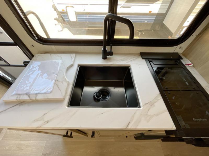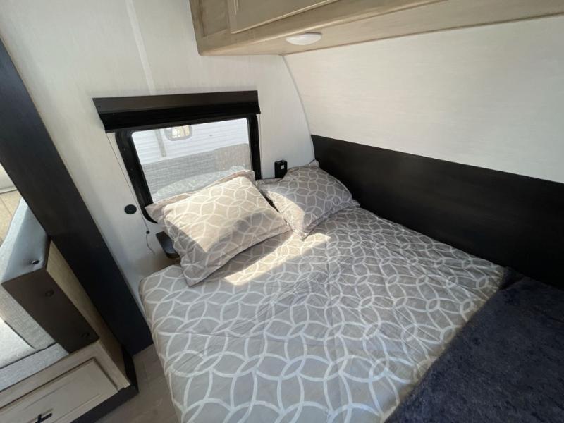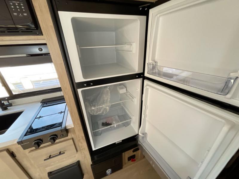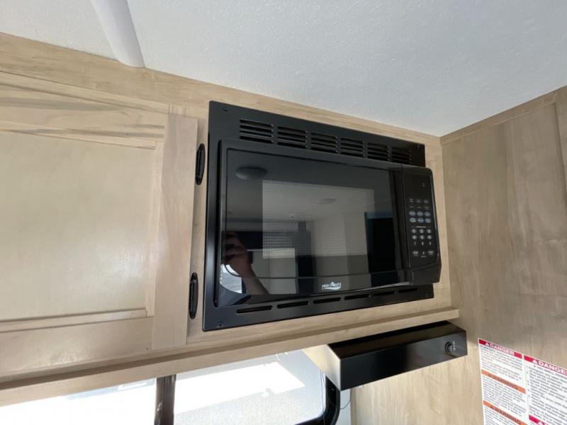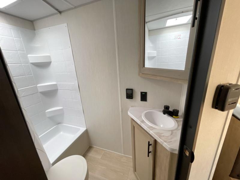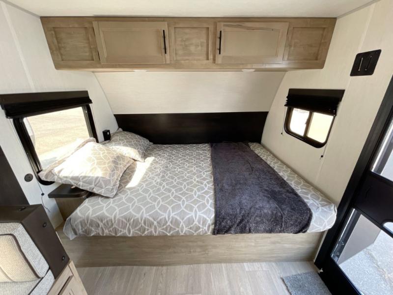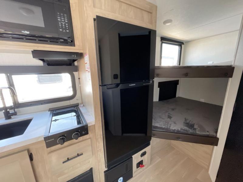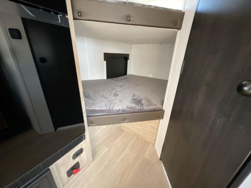 This family travel trailer is ready to head to the campground whenever you are! The kiddos can sleep on the set of double-size bed bunks and you can sleep on the front queen bed, plus the U-shaped dinette slide can also transform into an extra sleeping space when you aren't using it to enjoy a meal prepared with the high output cooktop. You can also prepare your delicious meals at the outside mini kitchen and stay protected by the power awning. The exterior not only has outside storage and an outside TV mount, but also features an outside storage plus door for access to the storage space underneath the bottom bunk bed. The rear corner bath allows everyone to stay clean and refreshed while you camp.