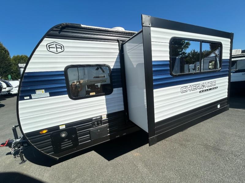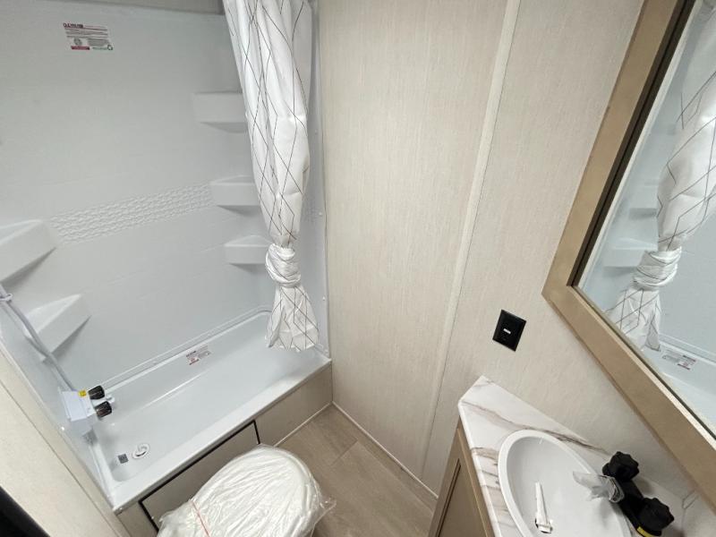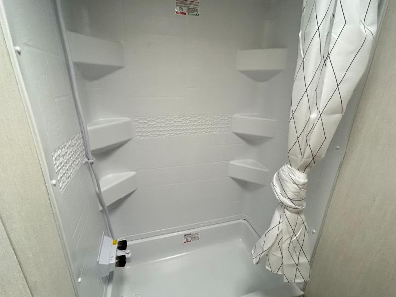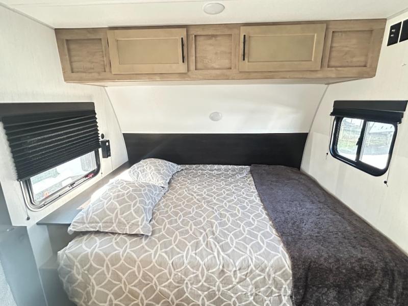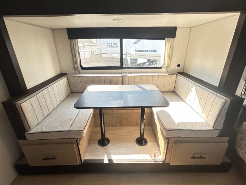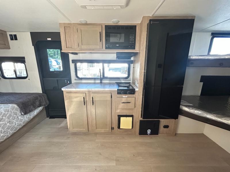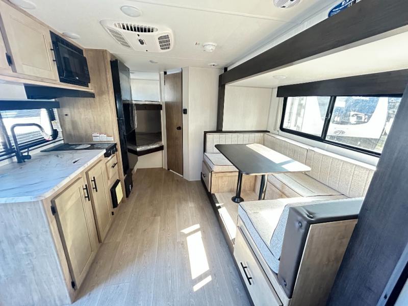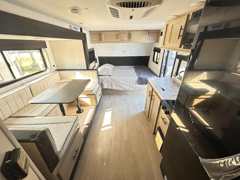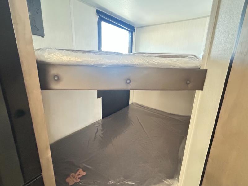 This family travel trailer is ready to head to the campground whenever you are! The kiddos can sleep on the set of double-size bed bunks and you can sleep on the front queen bed, plus the U-shaped dinette slide can also transform into an extra sleeping space when you aren't using it to enjoy a meal prepared with the high output cooktop. You can also prepare your delicious meals at the outside mini kitchen and stay protected by the power awning. The exterior not only has outside storage and an outside TV mount, but also features an outside storage plus door for access to the storage space underneath the bottom bunk bed. The rear corner bath allows everyone to stay clean and refreshed while you camp.