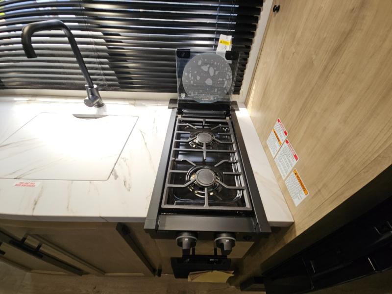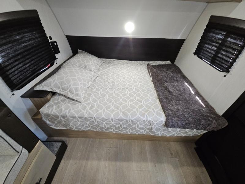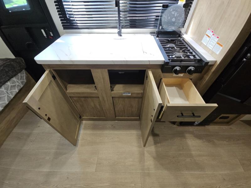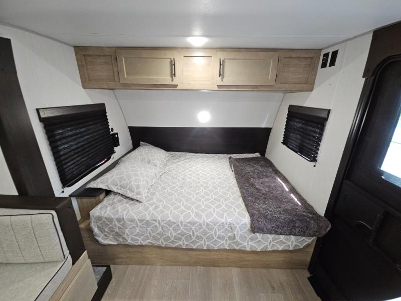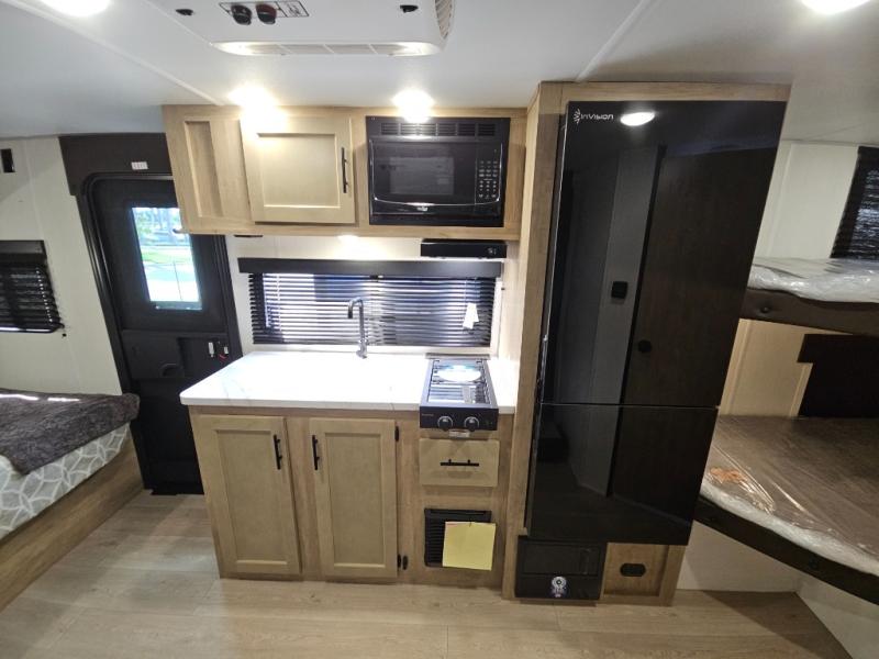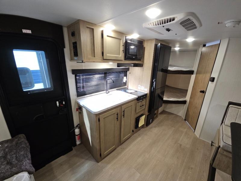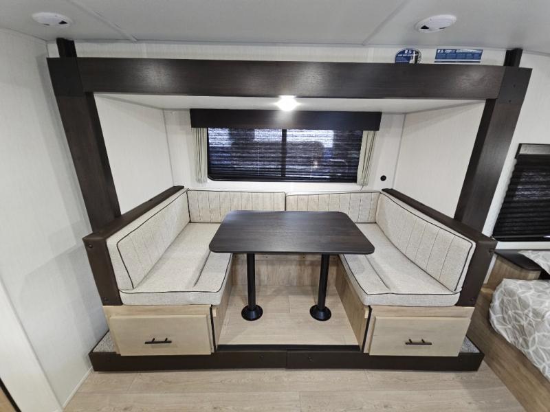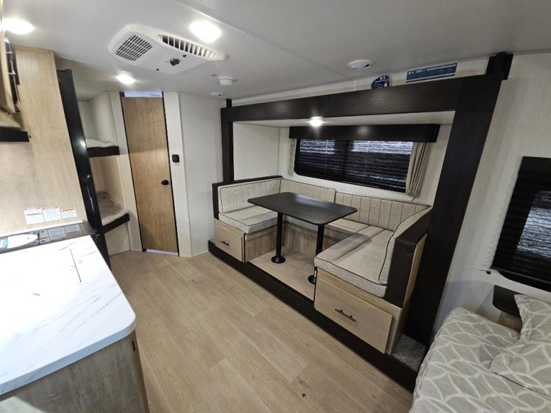 This family travel trailer is ready to head to the campground whenever you are! The kiddos can sleep on the set of double-size bed bunks, and you can sleep on the front queen bed, plus the U-shaped dinette slide can also transform into an extra sleeping space when you aren't using it to enjoy a meal prepared with the cooktop. You can also prepare your delicious meals at the outside mini kitchen and stay protected by the power awning. The exterior not only has outside storage and an outside TV mount but also features an outside storage plus door for access to the storage space underneath the bottom bunk bed. The rear corner bath allows everyone to stay clean and refreshed while you camp.