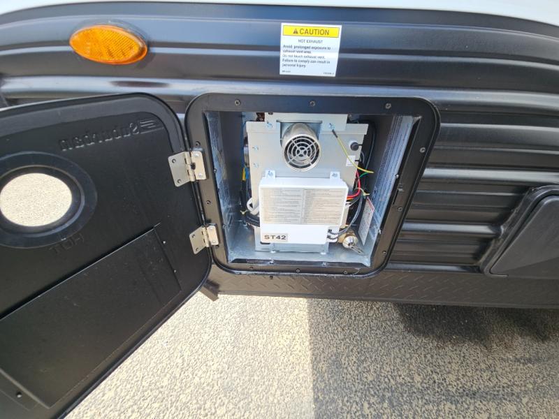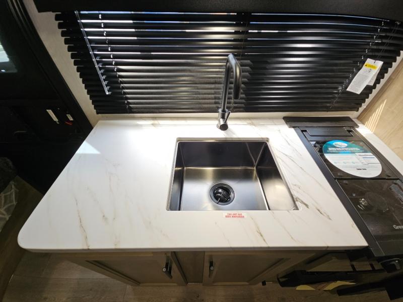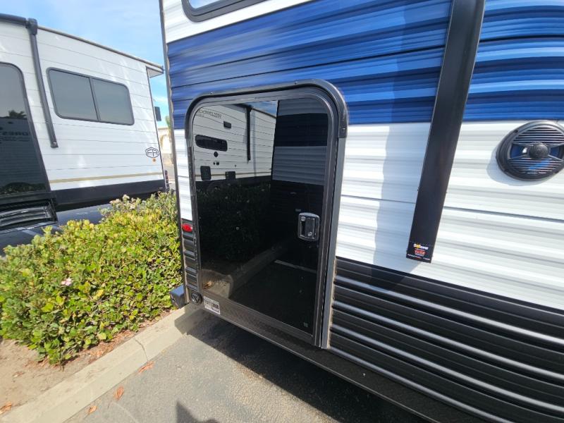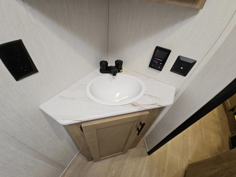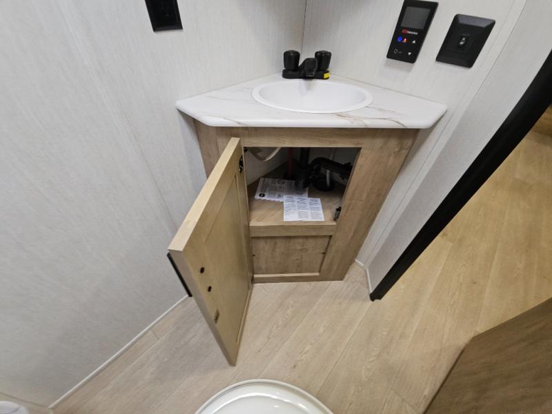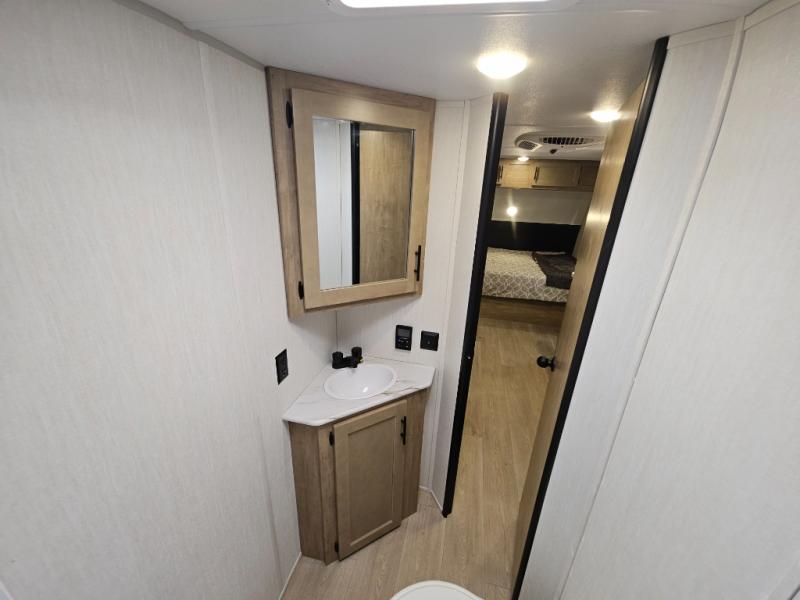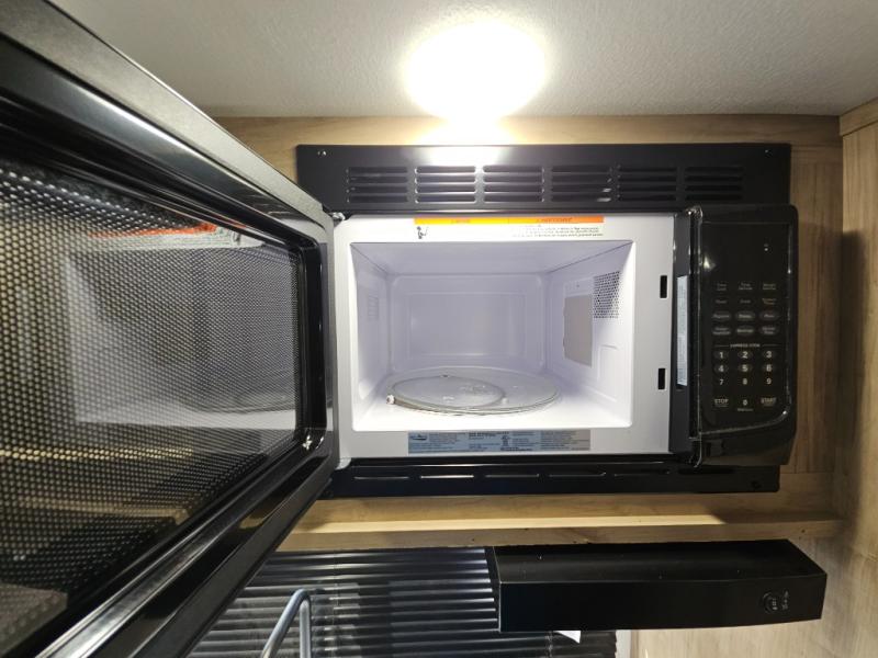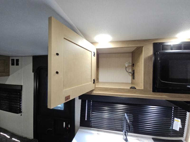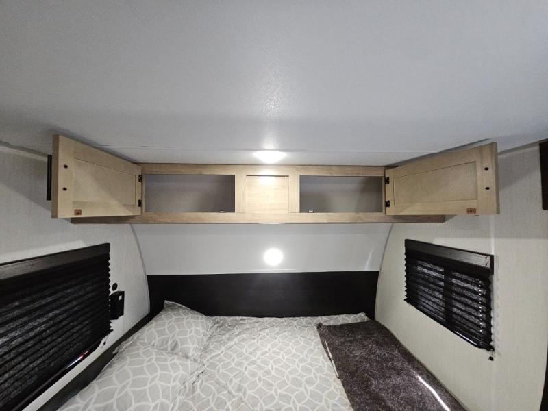 This family travel trailer is ready to head to the campground whenever you are! The kiddos can sleep on the set of double-size bed bunks, and you can sleep on the front queen bed, plus the U-shaped dinette slide can also transform into an extra sleeping space when you aren't using it to enjoy a meal prepared with the cooktop. You can also prepare your delicious meals at the outside mini kitchen and stay protected by the power awning. The exterior not only has outside storage and an outside TV mount but also features an outside storage plus door for access to the storage space underneath the bottom bunk bed. The rear corner bath allows everyone to stay clean and refreshed while you camp.
