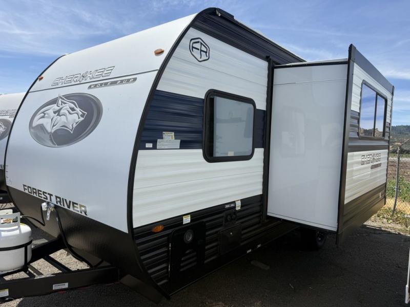 Each one of these Forest River Cherokee Wolf Pup travel trailers and toy hauler are lightweight and easy to tow! They are fully self-contained with ample tank capacities, an abundance of storage space, and filled with at home amenities. The full bath and kitchen amenities will make life at the campground easier than ever, and the outdoor patio awning will provide an inviting outdoor space!