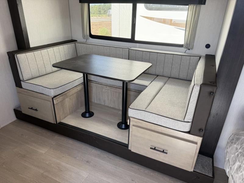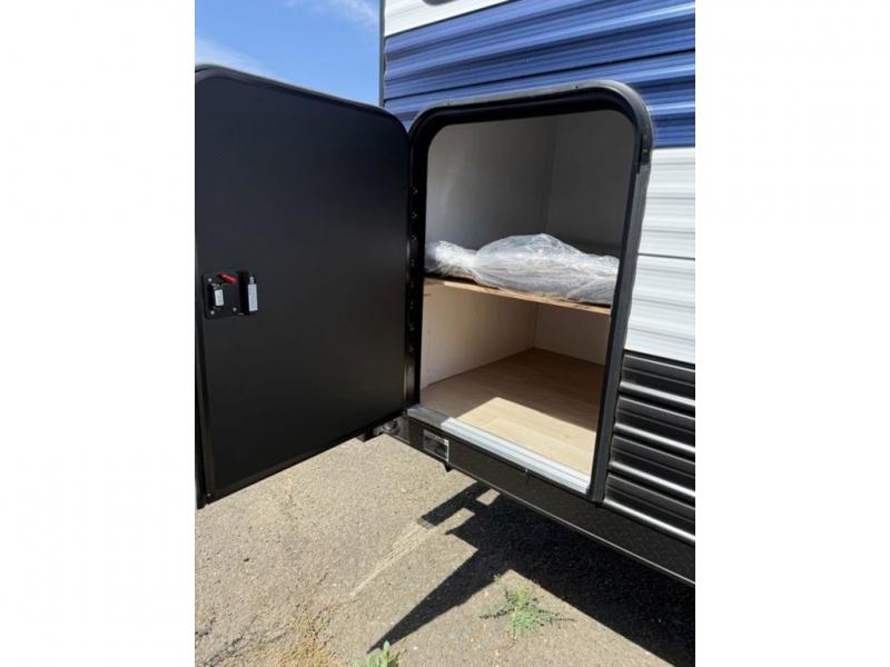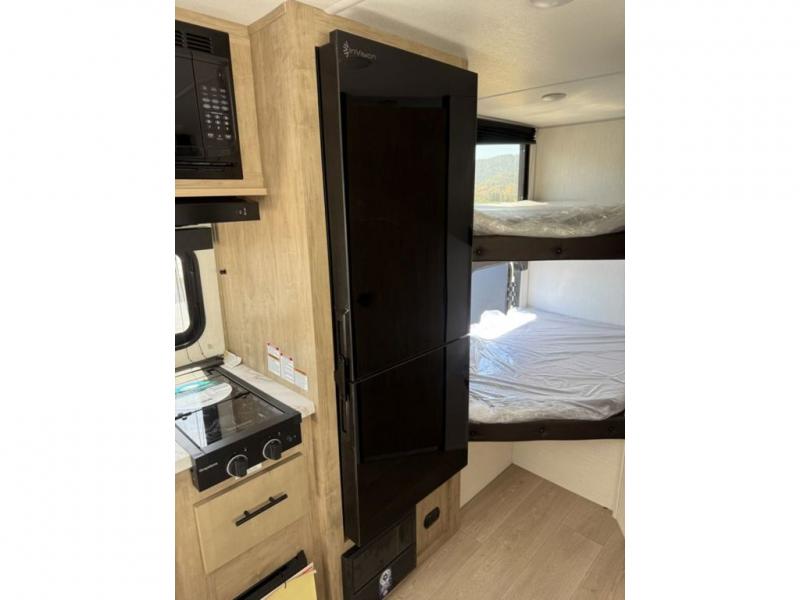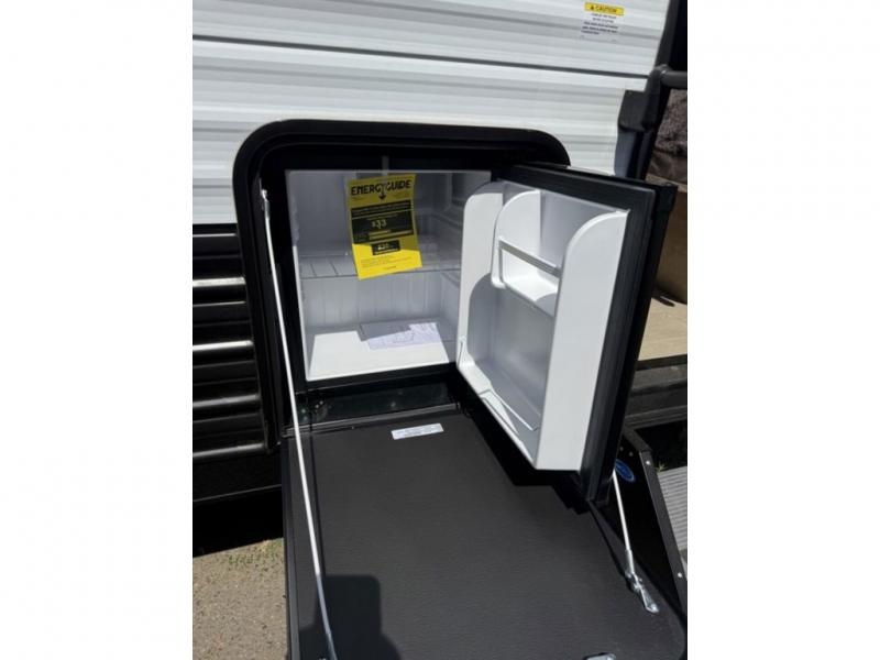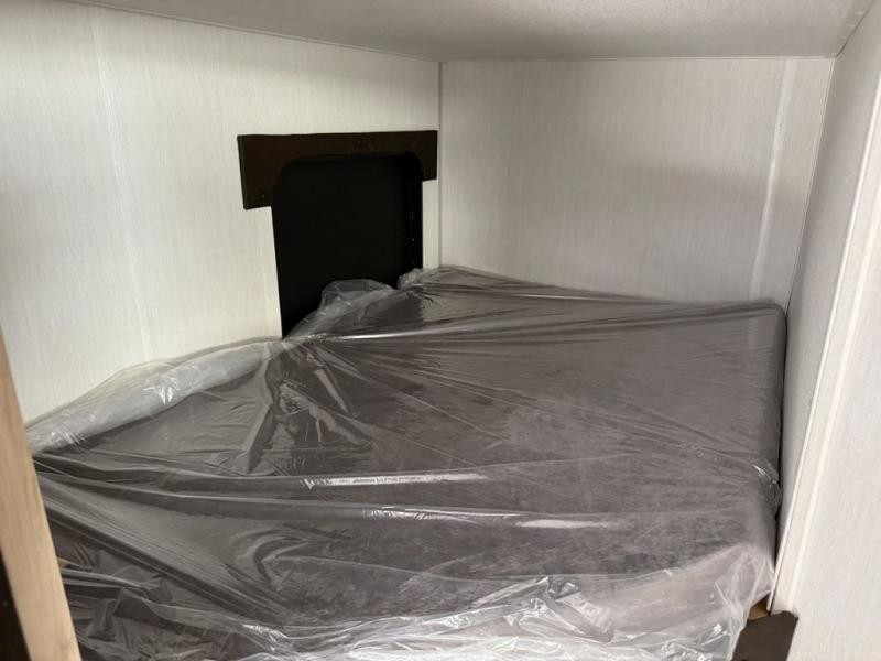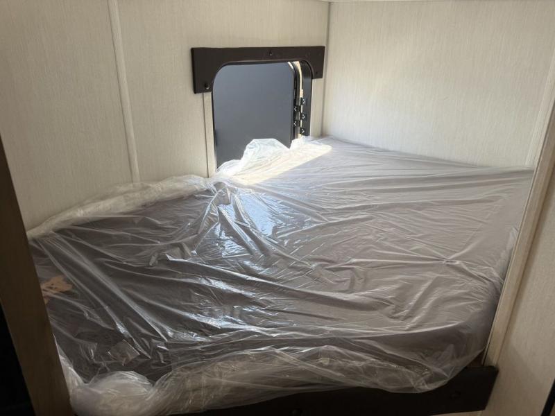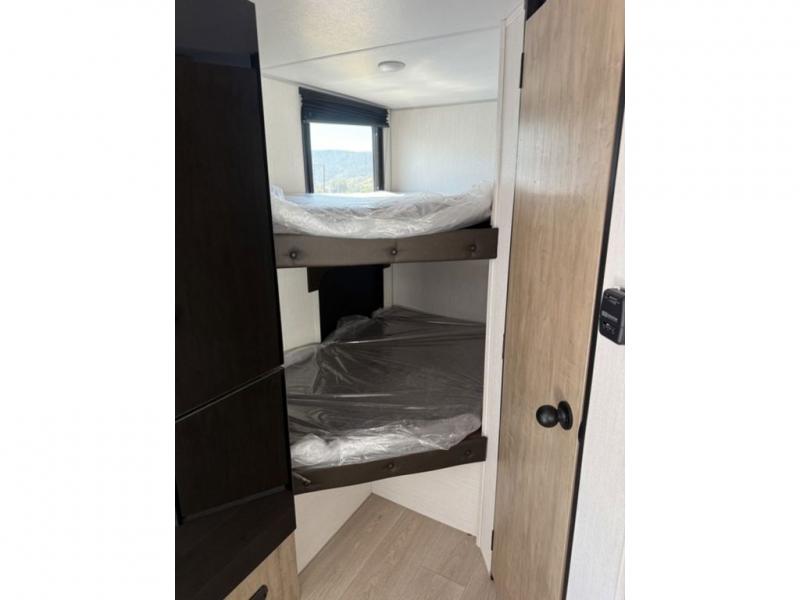 This family travel trailer is ready to head to the campground whenever you are! The kiddos can sleep on the set of double-size bed bunks, and you can sleep on the front queen bed, plus the U-shaped dinette slide can also transform into an extra sleeping space when you aren't using it to enjoy a meal prepared with the cooktop. You can also prepare your delicious meals at the outside mini kitchen and stay protected by the power awning. The exterior not only has outside storage and an outside TV mount but also features an outside storage plus door for access to the storage space underneath the bottom bunk bed. The rear corner bath allows everyone to stay clean and refreshed while you camp.