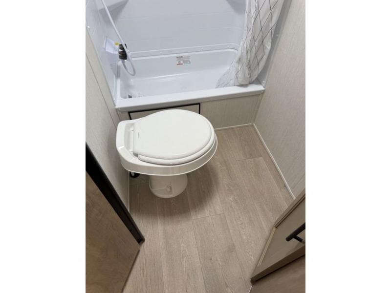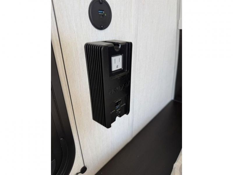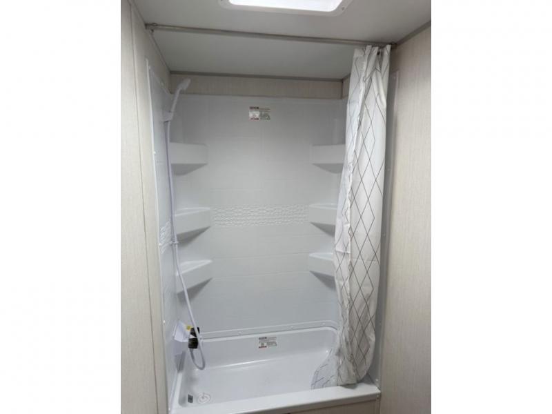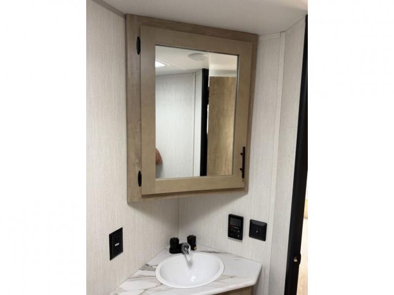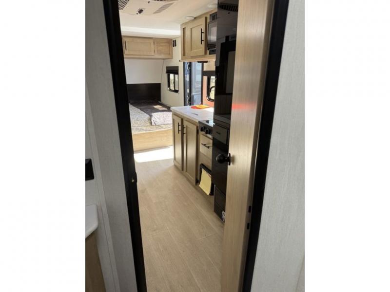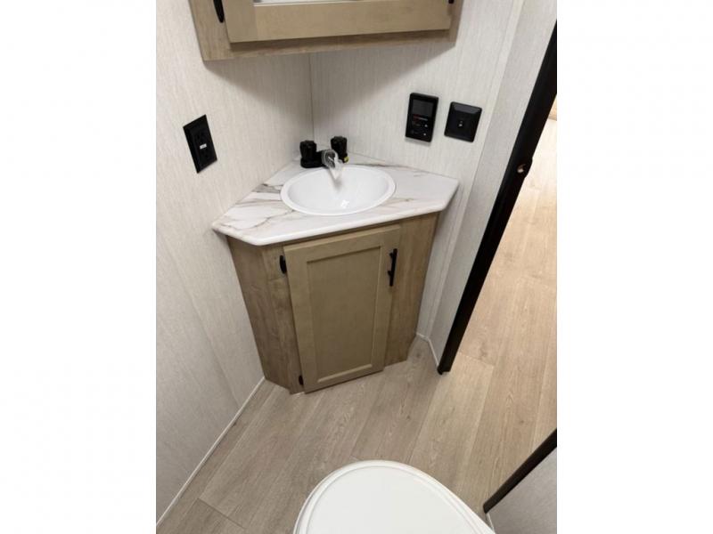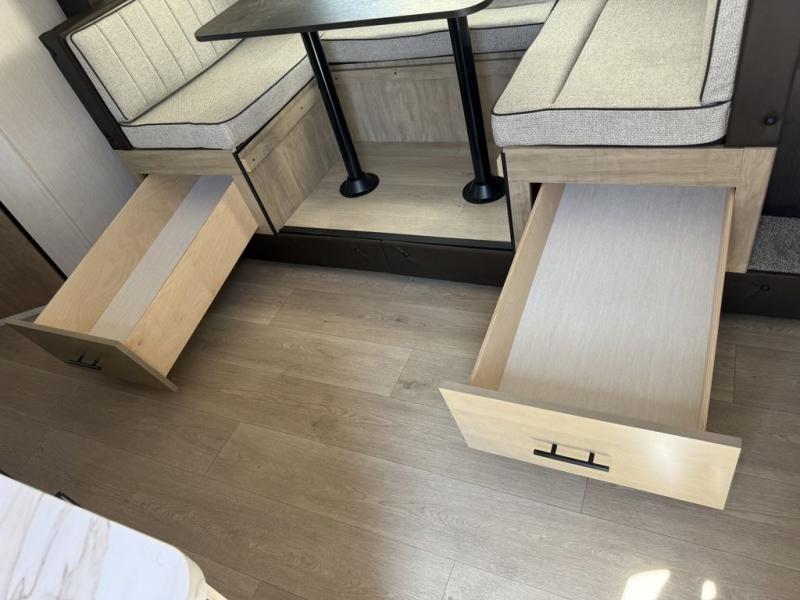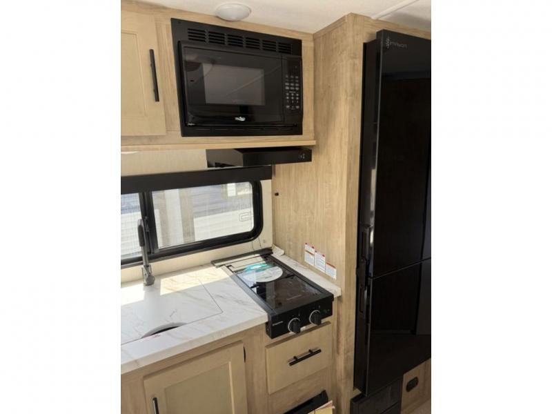This family travel trailer is ready to head to the campground whenever you are! The kiddos can sleep on the set of double-size bed bunks, and you can sleep on the front queen bed, plus the U-shaped dinette slide can also transform into an extra sleeping space when you aren't using it to enjoy a meal prepared with the cooktop. You can also prepare your delicious meals at the outside mini kitchen and stay protected by the power awning. The exterior not only has outside storage and an outside TV mount but also features an outside storage plus door for access to the storage space underneath the bottom bunk bed. The rear corner bath allows everyone to stay clean and refreshed while you camp.