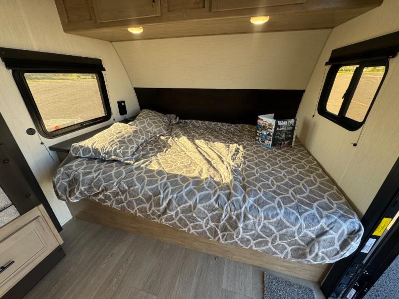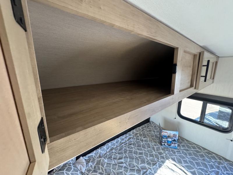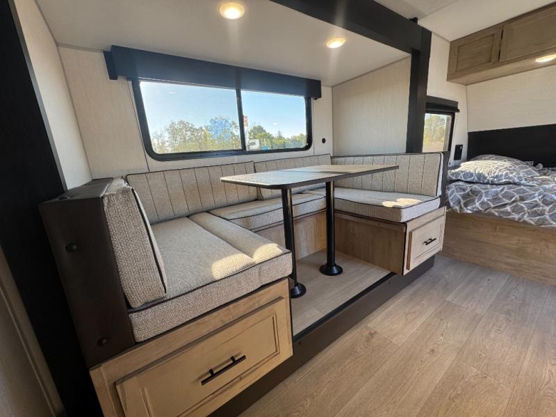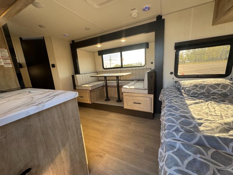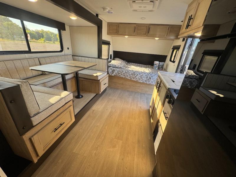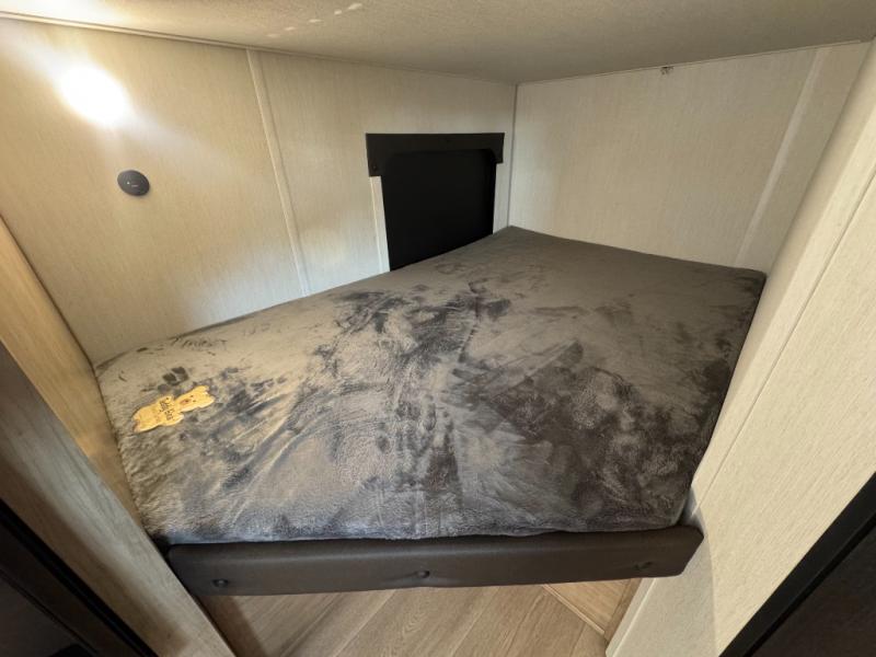 This family travel trailer is ready to head to the campground whenever you are! The kiddos can sleep on the set of double-size bed bunks, and you can sleep on the front queen bed, plus the U-shaped dinette slide can also transform into an extra sleeping space when you aren't using it to enjoy a meal prepared with the cooktop. You can also prepare your delicious meals at the outside mini kitchen and stay protected by the power awning. The exterior not only has outside storage and an outside TV mount but also features an outside storage plus door for access to the storage space underneath the bottom bunk bed. The rear corner bath allows everyone to stay clean and refreshed while you camp.