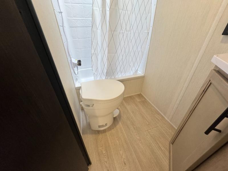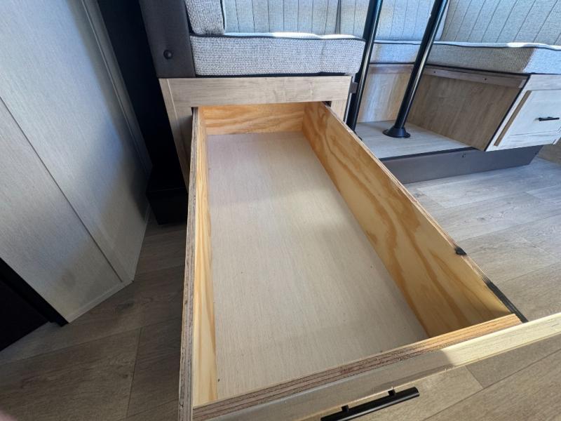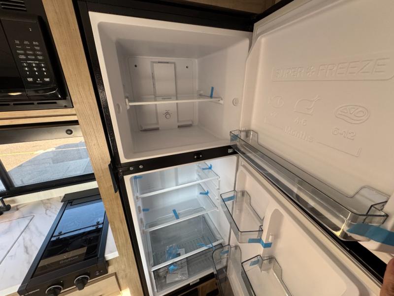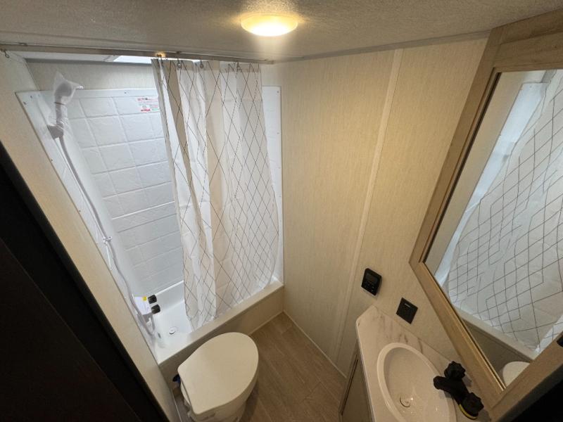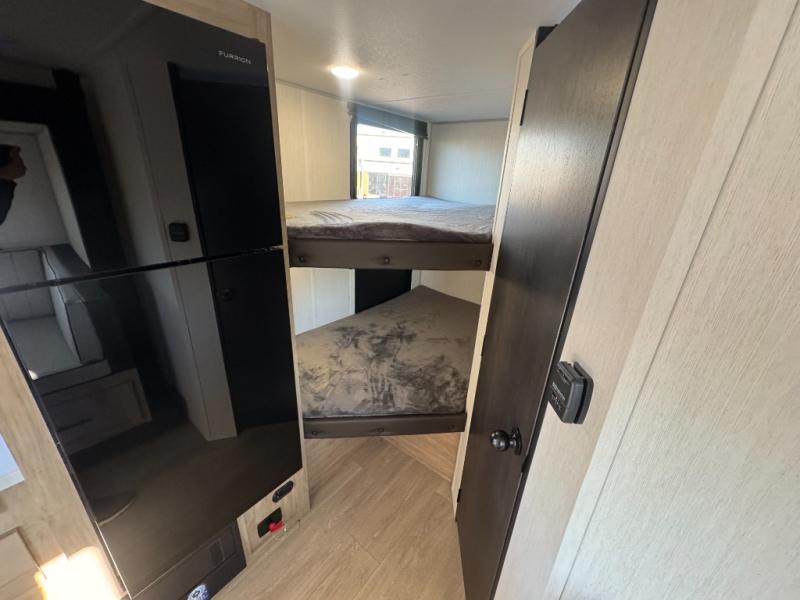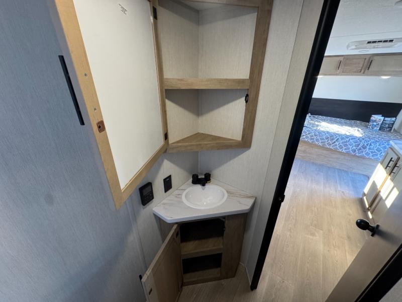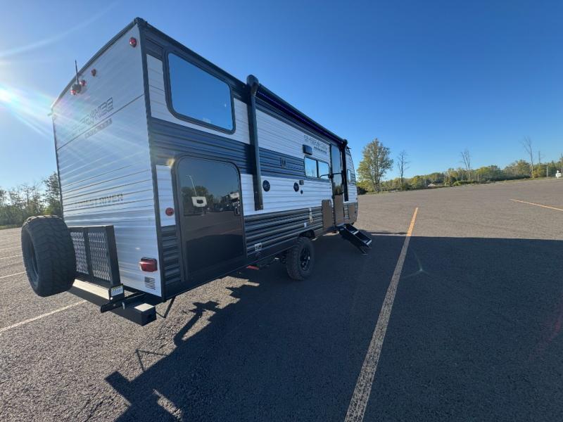 This family travel trailer is ready to head to the campground whenever you are! The kiddos can sleep on the set of double-size bed bunks, and you can sleep on the front queen bed, plus the U-shaped dinette slide can also transform into an extra sleeping space when you aren't using it to enjoy a meal prepared with the cooktop. You can also prepare your delicious meals at the outside mini kitchen and stay protected by the power awning. The exterior not only has outside storage and an outside TV mount but also features an outside storage plus door for access to the storage space underneath the bottom bunk bed. The rear corner bath allows everyone to stay clean and refreshed while you camp.