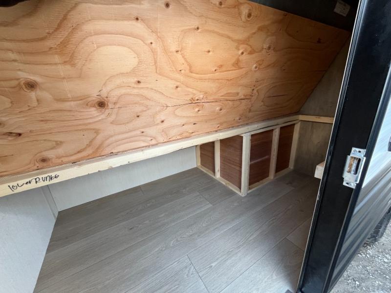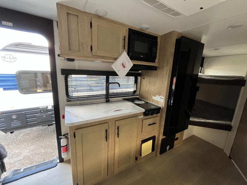 This family travel trailer is ready to head to the campground whenever you are! The kiddos can sleep on the set of double-size bed bunks, and you can sleep on the front queen bed, plus the U-shaped dinette slide can also transform into an extra sleeping space when you aren't using it to enjoy a meal prepared with the cooktop. You can also prepare your delicious meals at the outside mini kitchen and stay protected by the power awning. The exterior not only has outside storage and an outside TV mount but also features an outside storage plus door for access to the storage space underneath the bottom bunk bed. The rear corner bath allows everyone to stay clean and refreshed while you camp.