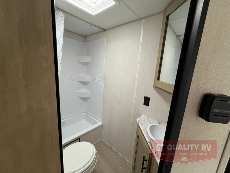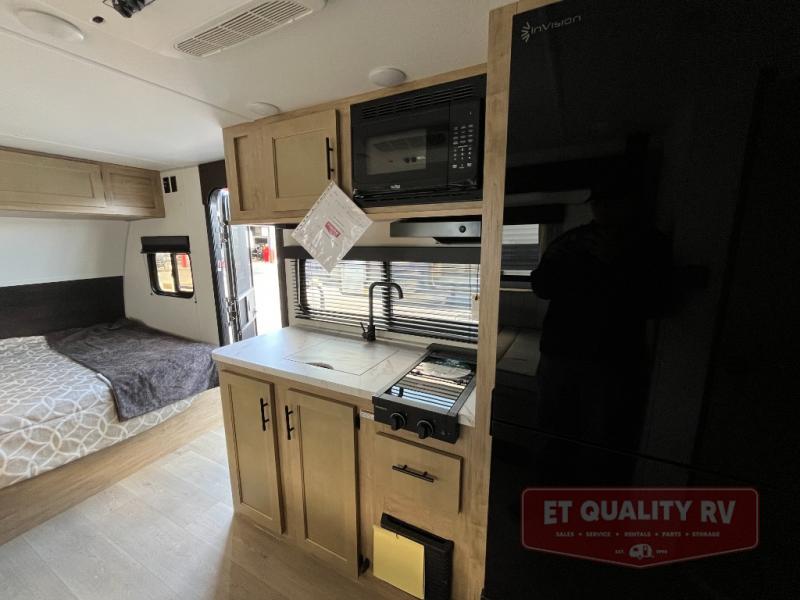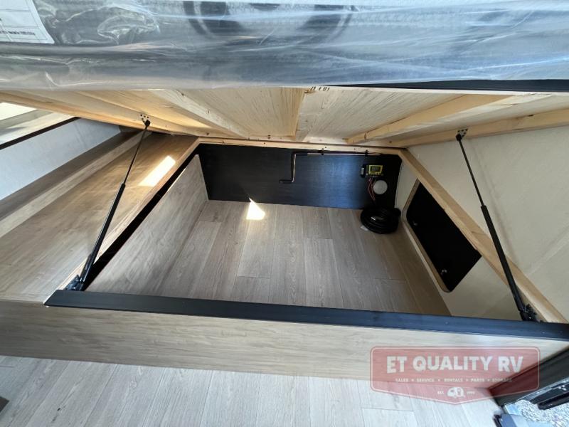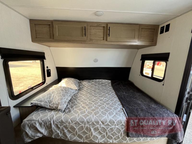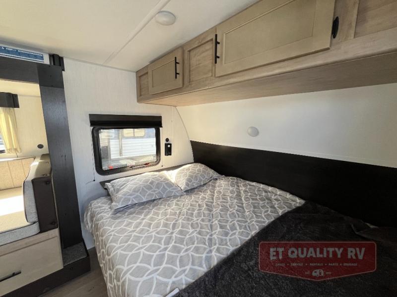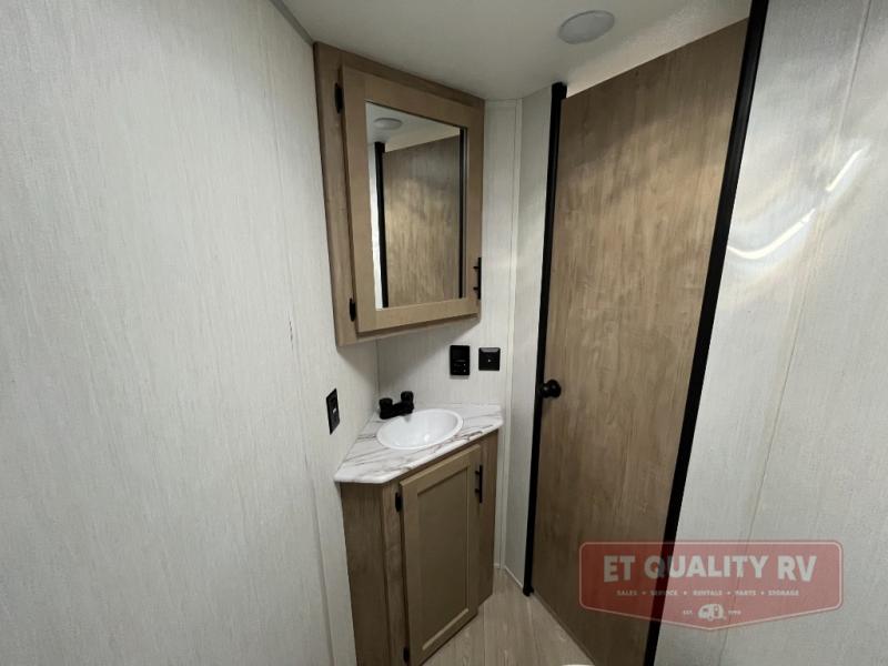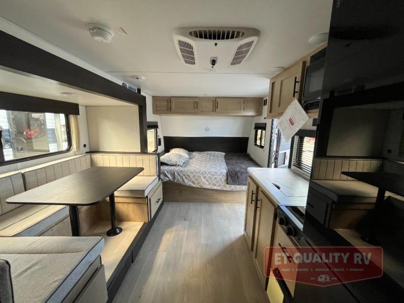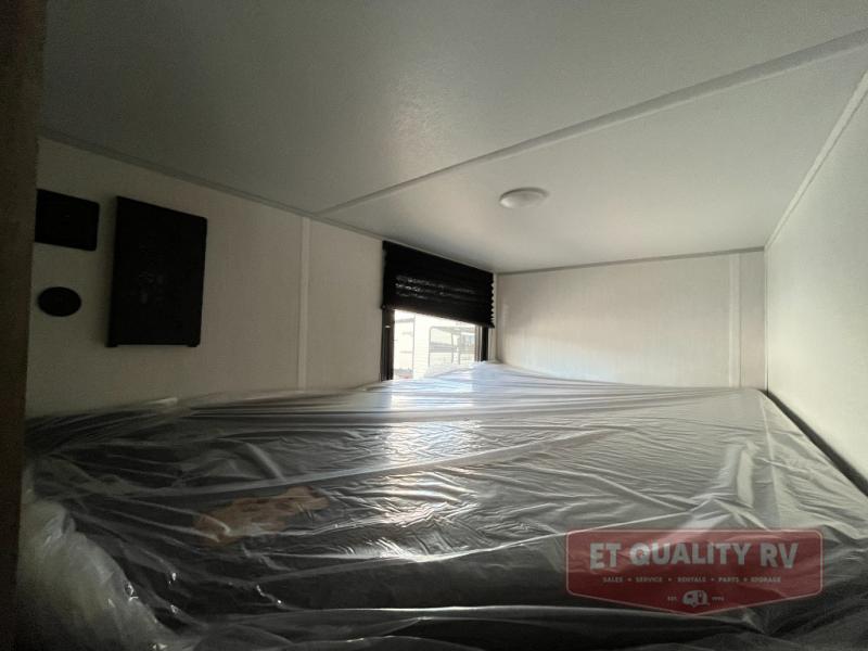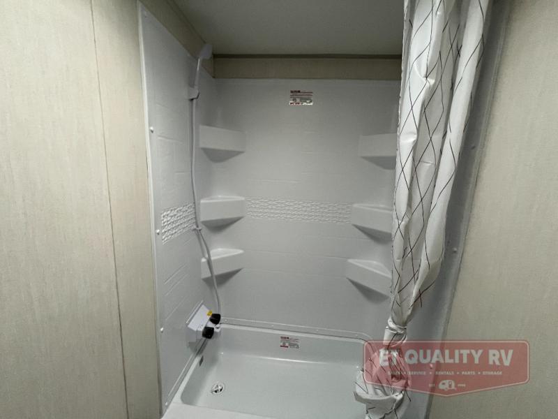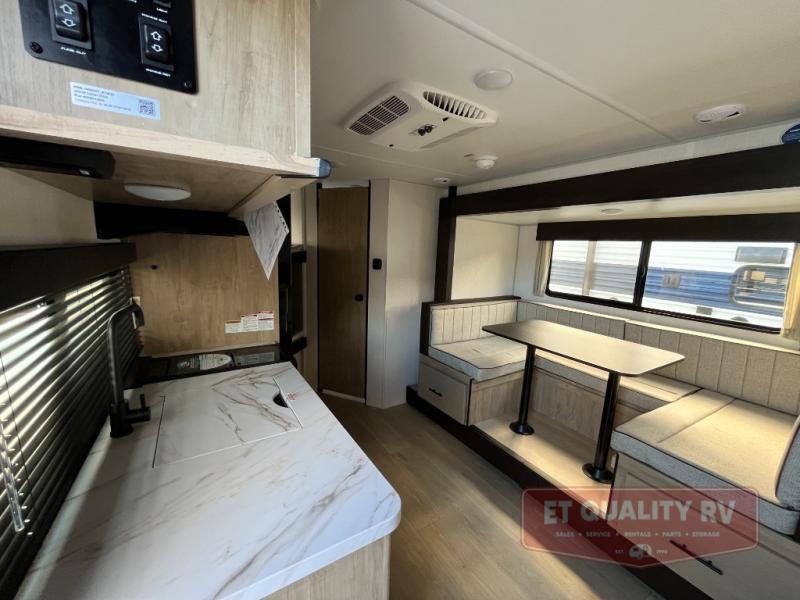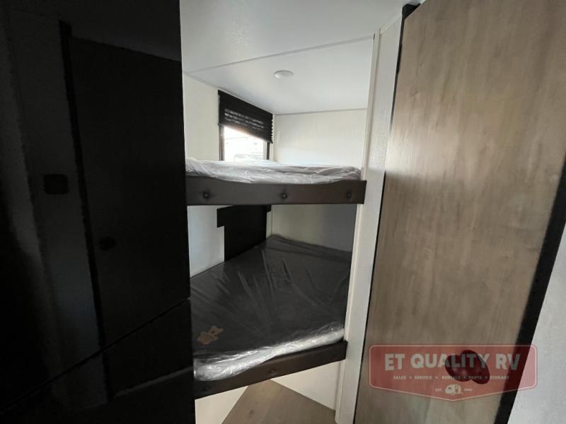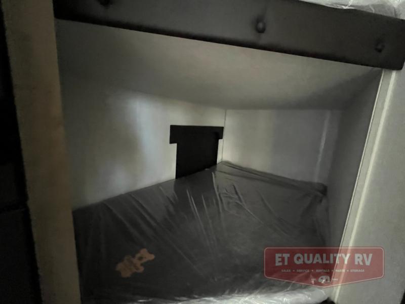 This family travel trailer is ready to head to the campground whenever you are! The kiddos can sleep on the set of double-size bed bunks, and you can sleep on the front queen bed, plus the U-shaped dinette slide can also transform into an extra sleeping space when you aren't using it to enjoy a meal prepared with the cooktop. You can also prepare your delicious meals at the outside mini kitchen and stay protected by the power awning. The exterior not only has outside storage and an outside TV mount but also features an outside storage plus door for access to the storage space underneath the bottom bunk bed. The rear corner bath allows everyone to stay clean and refreshed while you camp.