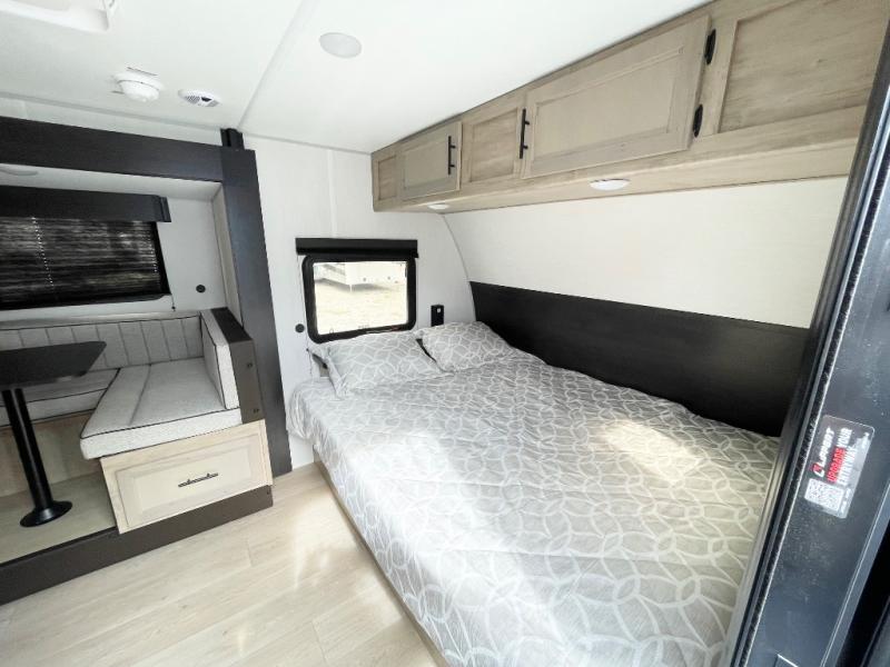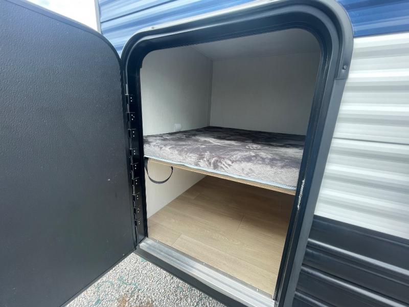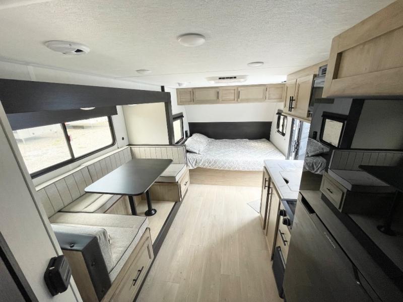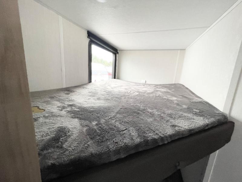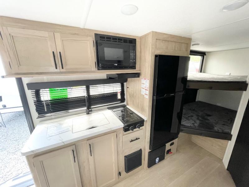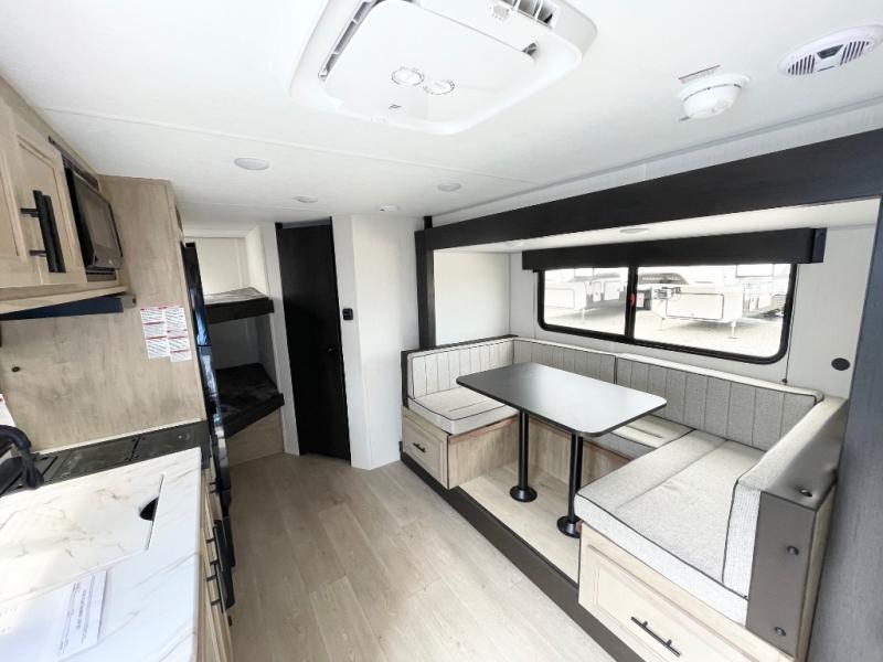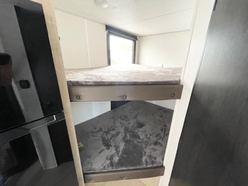 This family travel trailer is ready to head to the campground whenever you are! The kiddos can sleep on the set of double-size bed bunks, and you can sleep on the front queen bed, plus the U-shaped dinette slide can also transform into an extra sleeping space when you aren't using it to enjoy a meal prepared with the cooktop. You can also prepare your delicious meals at the outside mini kitchen and stay protected by the power awning. The exterior not only has outside storage and an outside TV mount but also features an outside storage plus door for access to the storage space underneath the bottom bunk bed. The rear corner bath allows everyone to stay clean and refreshed while you camp.