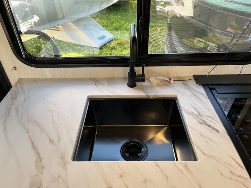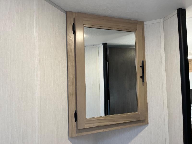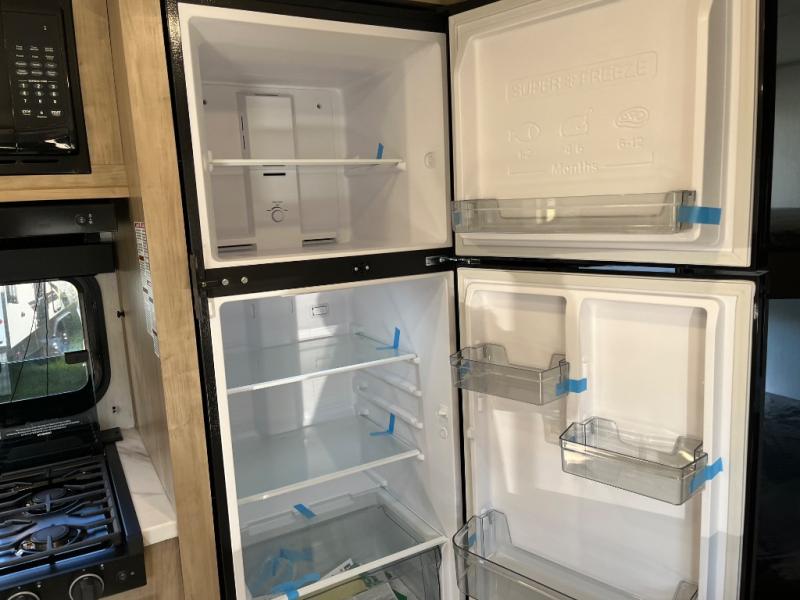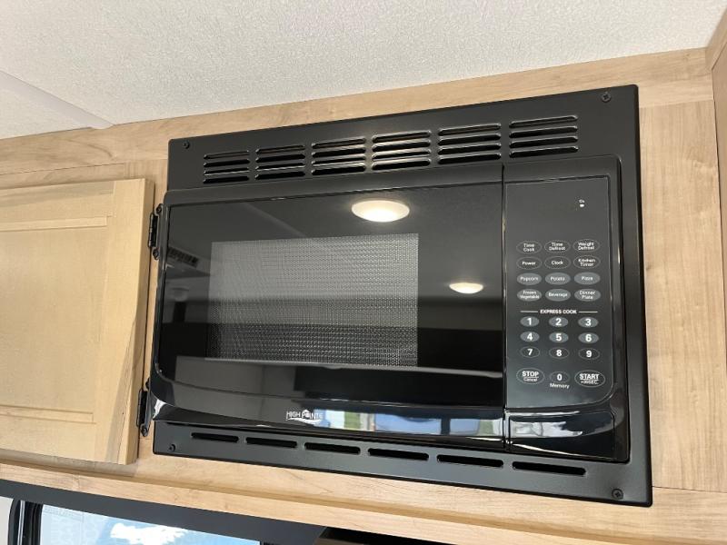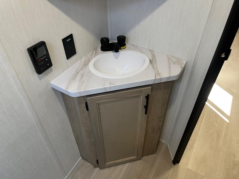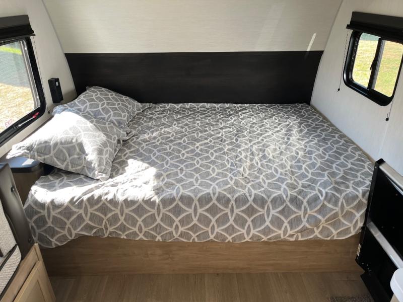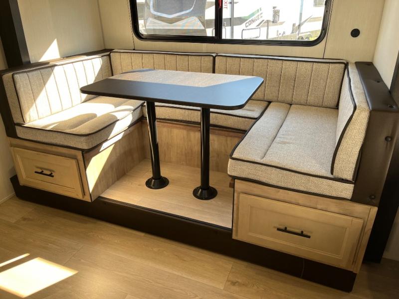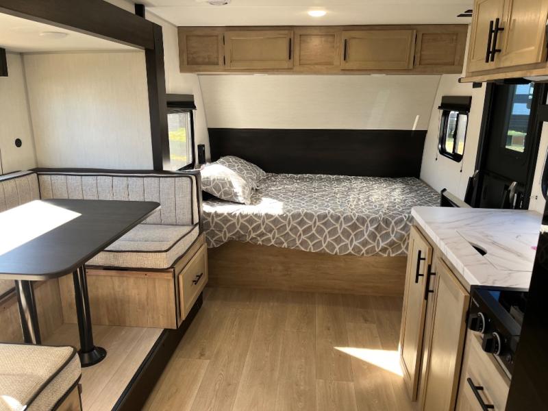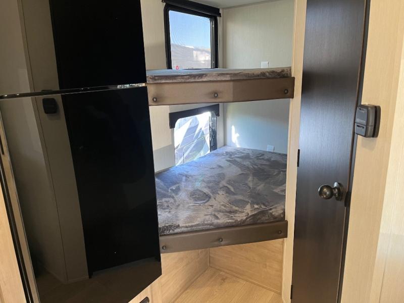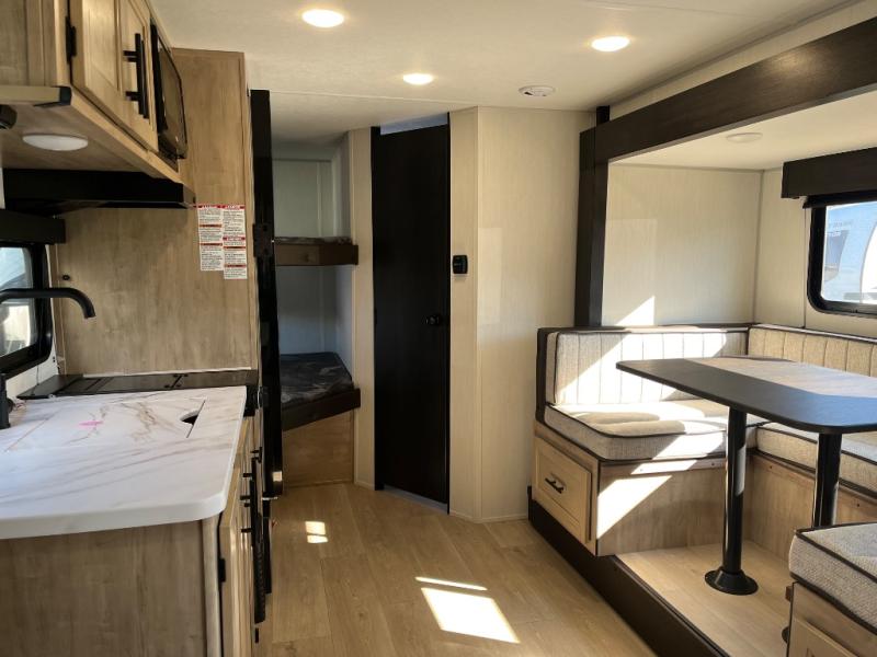 This family travel trailer is ready to head to the campground whenever you are! The kiddos can sleep on the set of double-size bed bunks, and you can sleep on the front queen bed, plus the U-shaped dinette slide can also transform into an extra sleeping space when you aren't using it to enjoy a meal prepared with the cooktop. You can also prepare your delicious meals at the outside mini kitchen and stay protected by the power awning. The exterior not only has outside storage and an outside TV mount but also features an outside storage plus door for access to the storage space underneath the bottom bunk bed. The rear corner bath allows everyone to stay clean and refreshed while you camp.