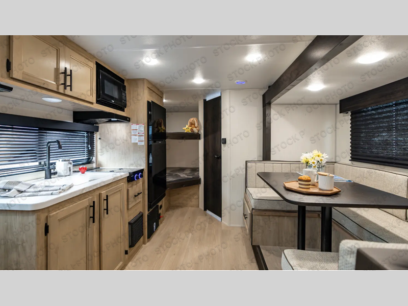 This family travel trailer is ready to head to the campground whenever you are! The kiddos can sleep on the set of double-size bed bunks, and you can sleep on the front queen bed, plus the U-shaped dinette slide can also transform into an extra sleeping space when you aren't using it to enjoy a meal prepared with the cooktop. You can also prepare your delicious meals at the outside mini kitchen and stay protected by the power awning. The exterior not only has outside storage and an outside TV mount but also features an outside storage plus door for access to the storage space underneath the bottom bunk bed. The rear corner bath allows everyone to stay clean and refreshed while you camp.