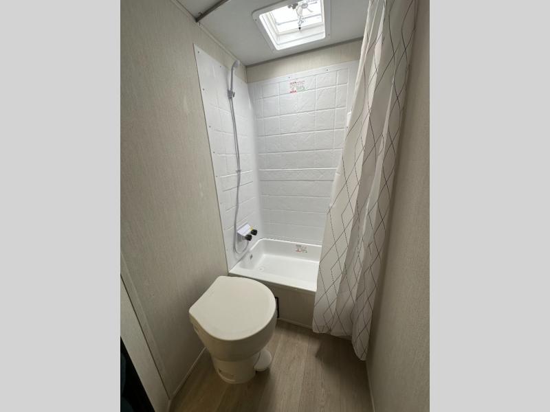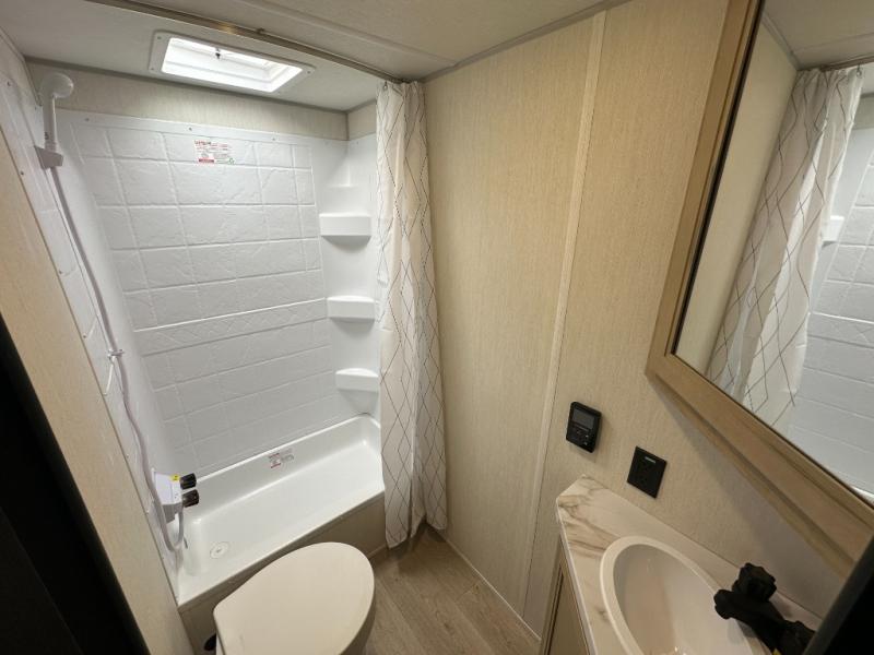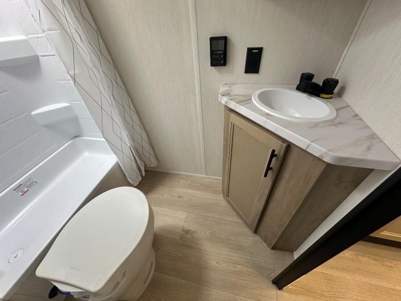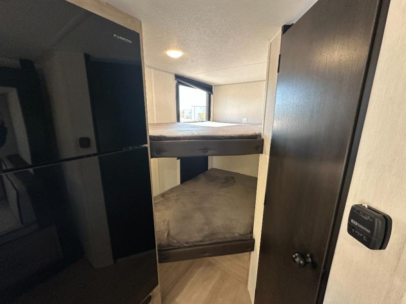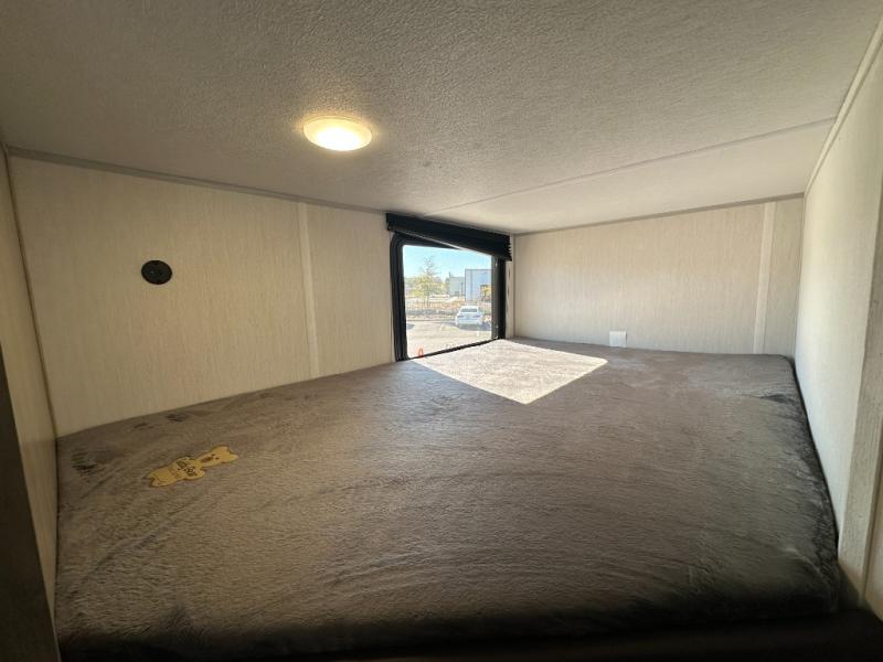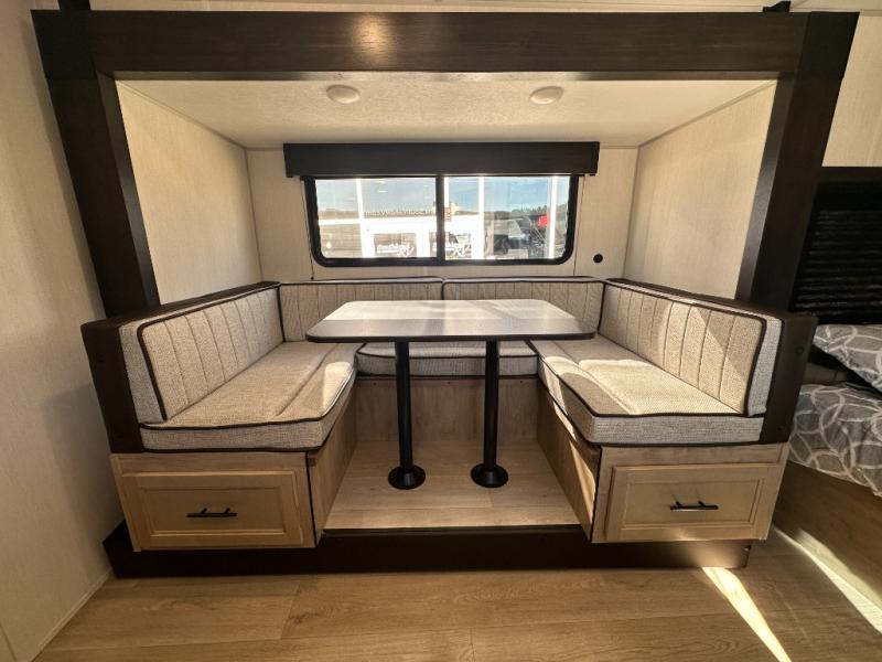 This family travel trailer is ready to head to the campground whenever you are! The kiddos can sleep on the set of double-size bed bunks, and you can sleep on the front queen bed, plus the U-shaped dinette slide can also transform into an extra sleeping space when you aren't using it to enjoy a meal prepared with the cooktop. You can also prepare your delicious meals at the outside mini kitchen and stay protected by the power awning. The exterior not only has outside storage and an outside TV mount but also features an outside storage plus door for access to the storage space underneath the bottom bunk bed. The rear corner bath allows everyone to stay clean and refreshed while you camp.