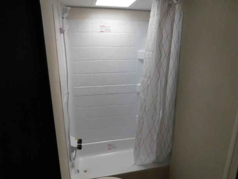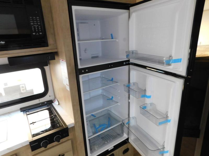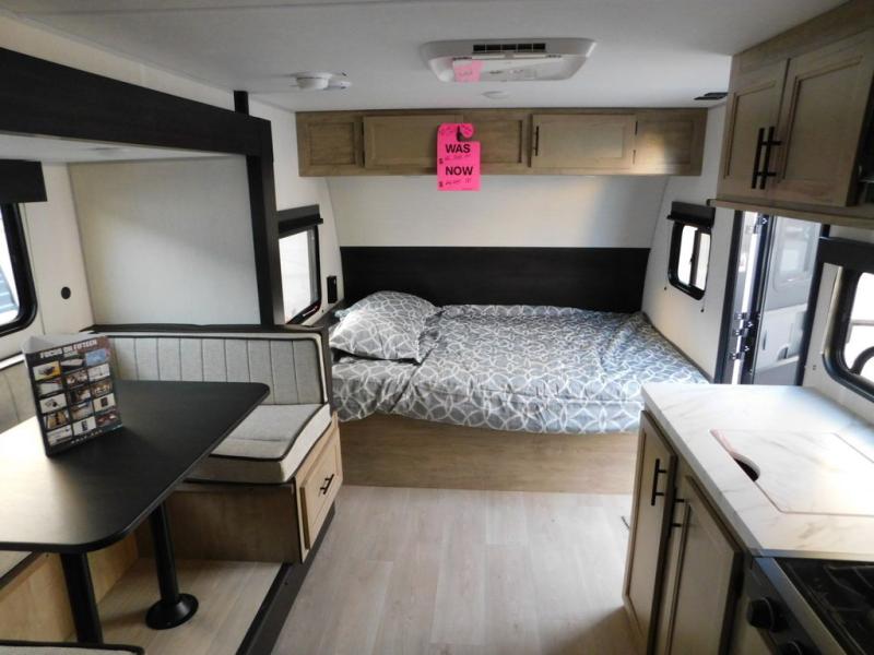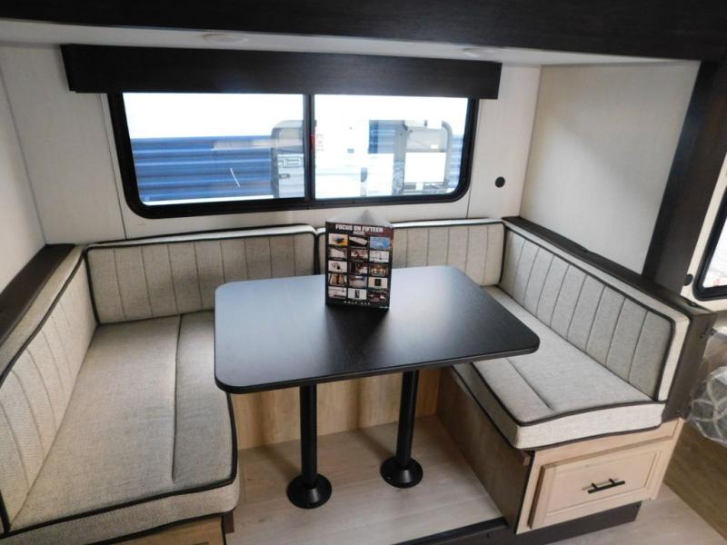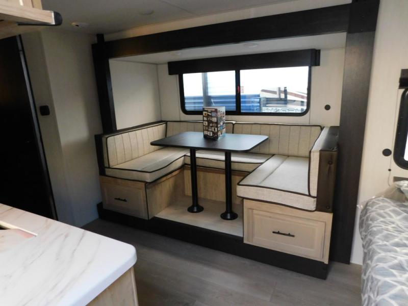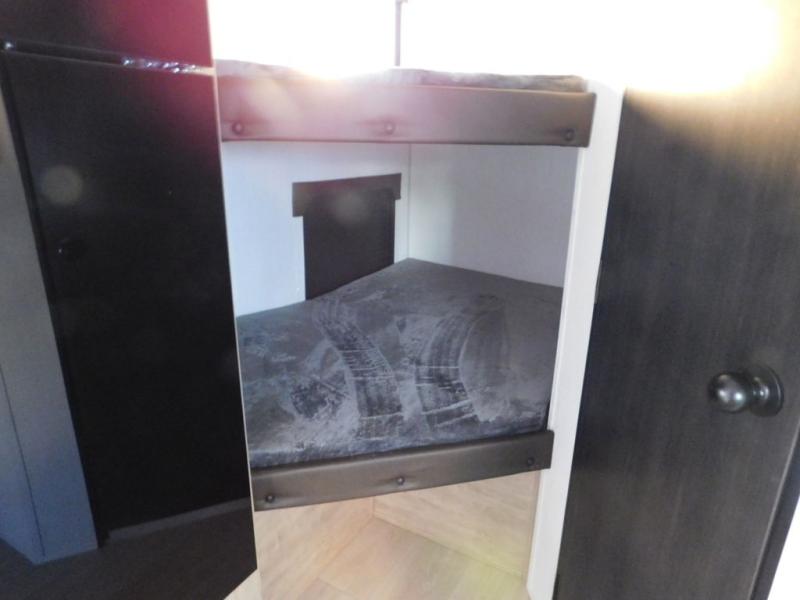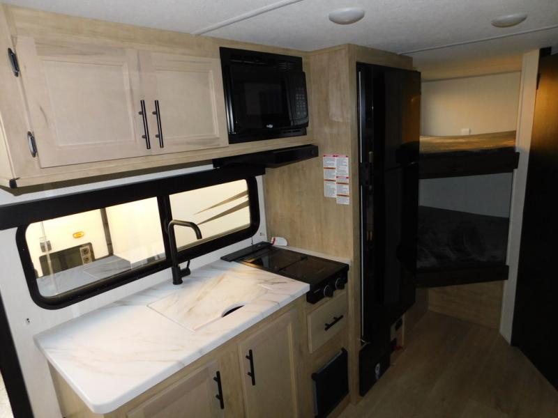 This family travel trailer is ready to head to the campground whenever you are! The kiddos can sleep on the set of double-size bed bunks, and you can sleep on the front queen bed, plus the U-shaped dinette slide can also transform into an extra sleeping space when you aren't using it to enjoy a meal prepared with the cooktop. You can also prepare your delicious meals at the outside mini kitchen and stay protected by the power awning. The exterior not only has outside storage and an outside TV mount but also features an outside storage plus door for access to the storage space underneath the bottom bunk bed. The rear corner bath allows everyone to stay clean and refreshed while you camp.