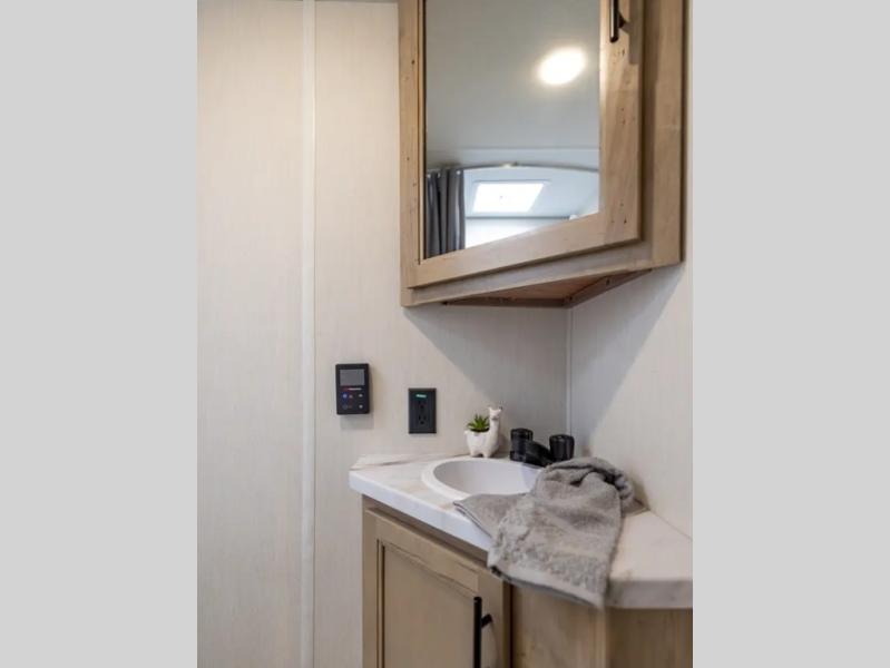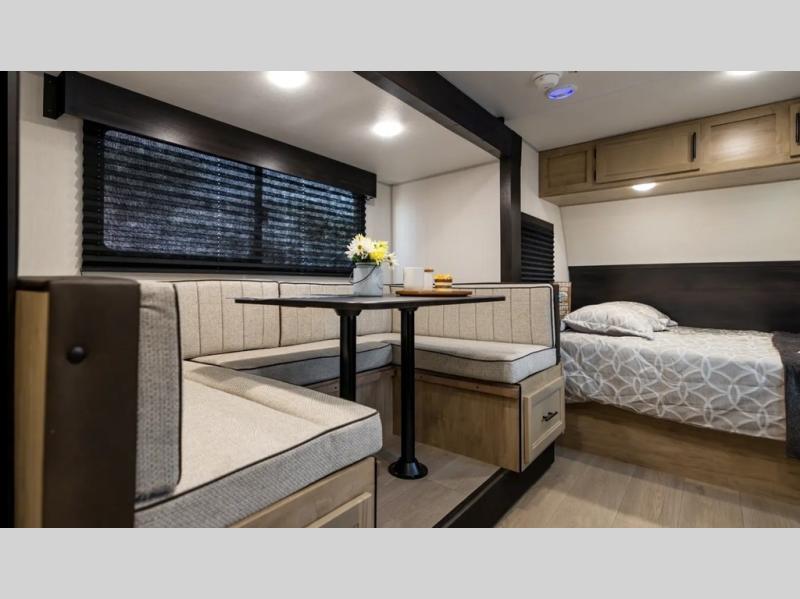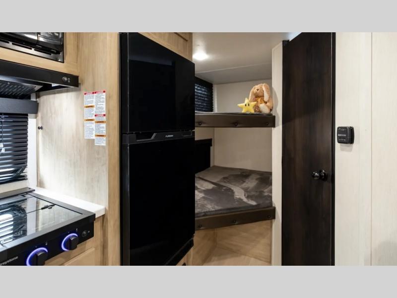 This family travel trailer is ready to head to the campground whenever you are! The kiddos can sleep on the set of double-size bed bunks, and you can sleep on the front queen bed, plus the U-shaped dinette slide can also transform into an extra sleeping space when you aren't using it to enjoy a meal prepared with the cooktop. You can also prepare your delicious meals at the outside mini kitchen and stay protected by the power awning. The exterior not only has outside storage and an outside TV mount but also features an outside storage plus door for access to the storage space underneath the bottom bunk bed. The rear corner bath allows everyone to stay clean and refreshed while you camp.
