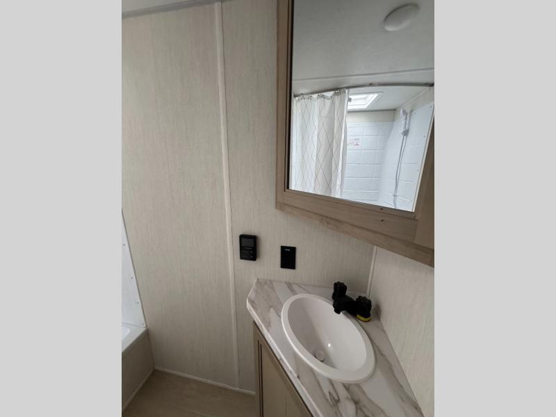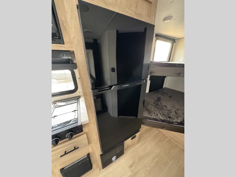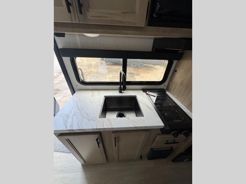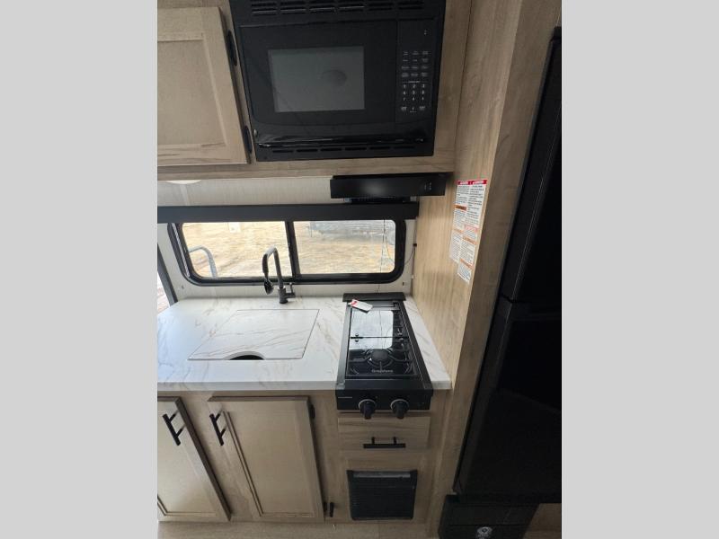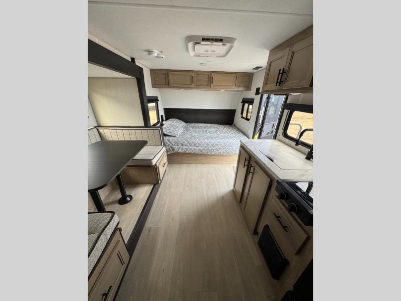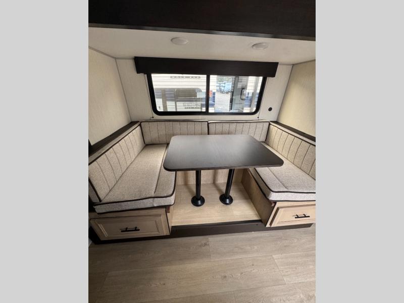 This family travel trailer is ready to head to the campground whenever you are! The kiddos can sleep on the set of double-size bed bunks, and you can sleep on the front queen bed, plus the U-shaped dinette slide can also transform into an extra sleeping space when you aren't using it to enjoy a meal prepared with the cooktop. You can also prepare your delicious meals at the outside mini kitchen and stay protected by the power awning. The exterior not only has outside storage and an outside TV mount but also features an outside storage plus door for access to the storage space underneath the bottom bunk bed. The rear corner bath allows everyone to stay clean and refreshed while you camp.
