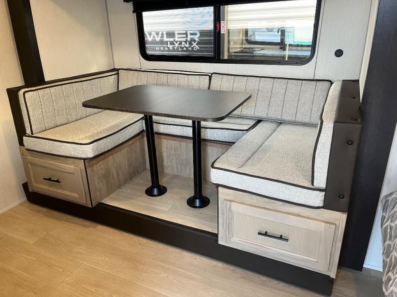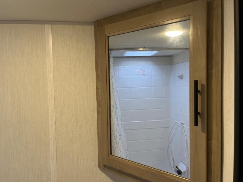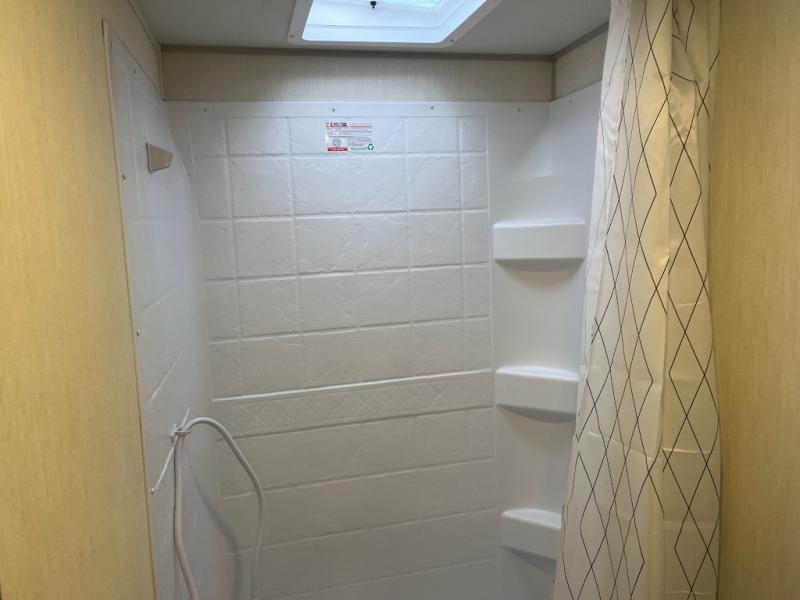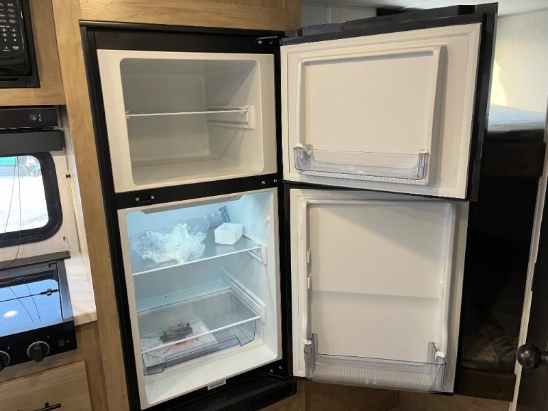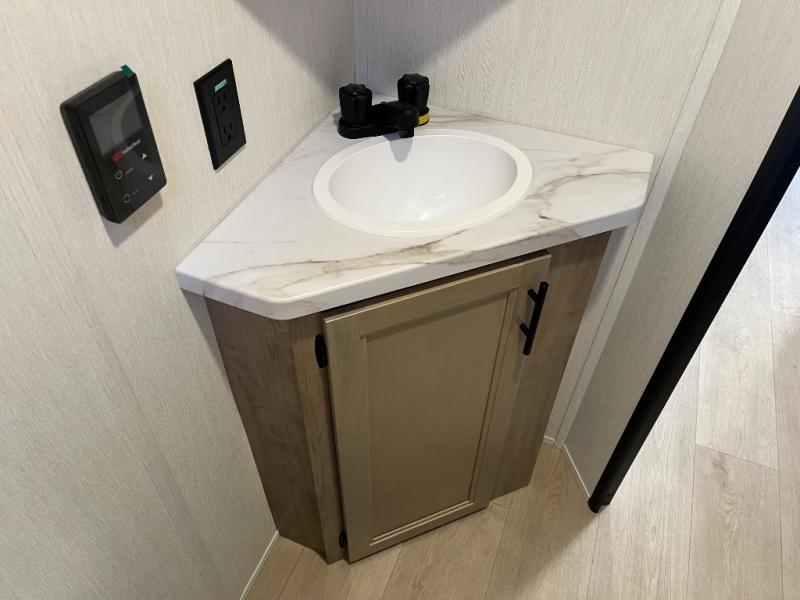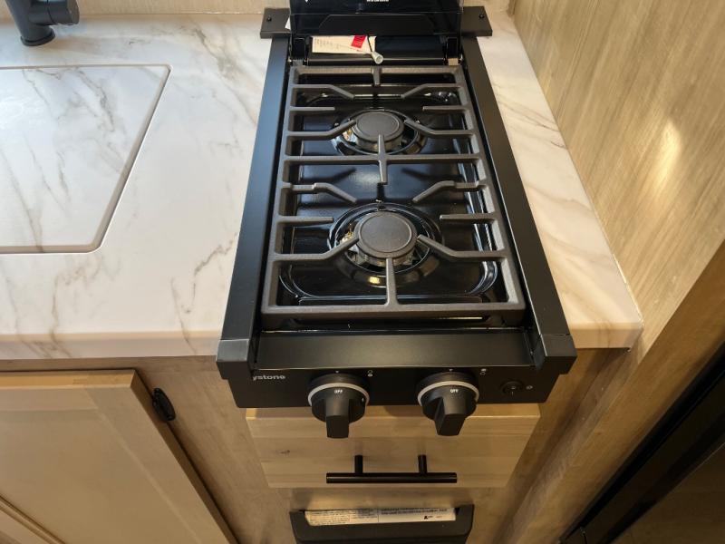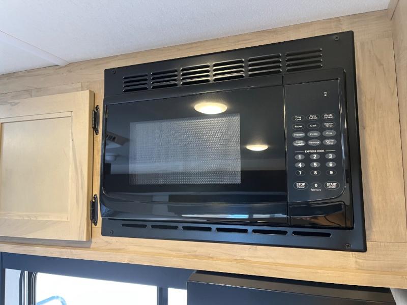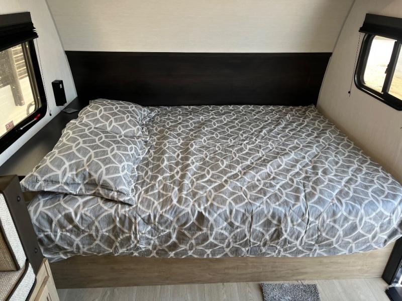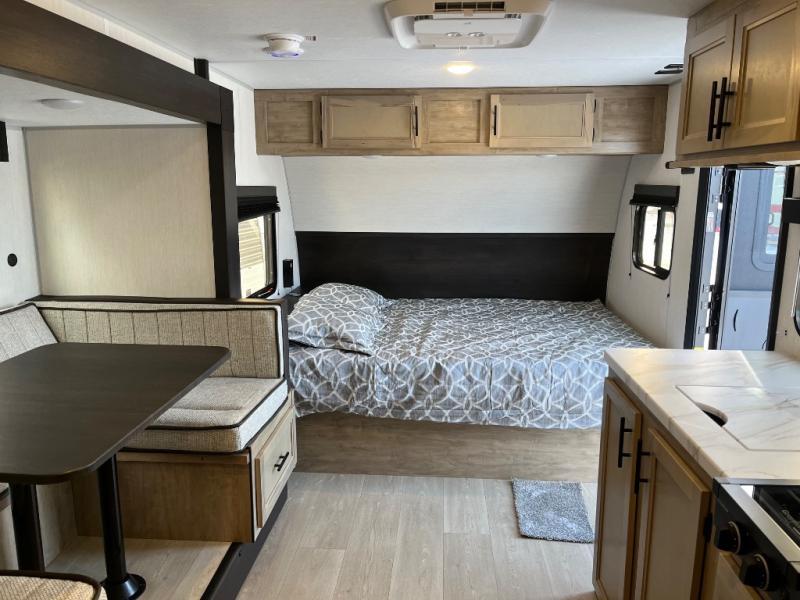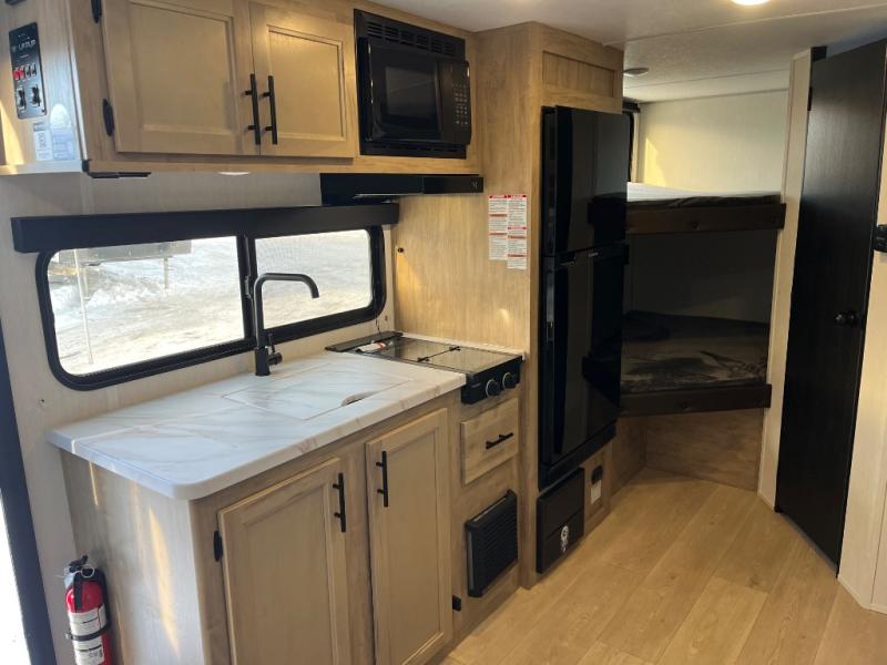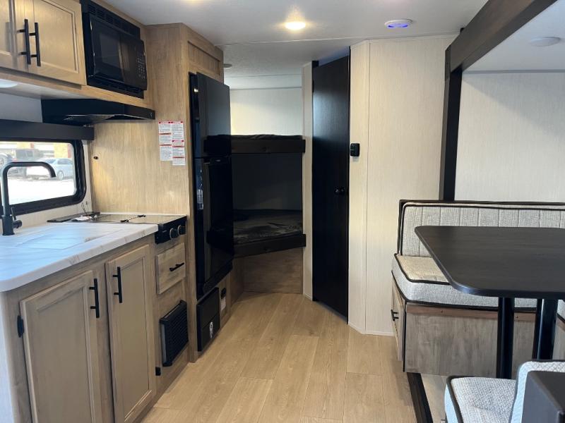 This family travel trailer is ready to head to the campground whenever you are! The kiddos can sleep on the set of double-size bed bunks, and you can sleep on the front queen bed, plus the U-shaped dinette slide can also transform into an extra sleeping space when you aren't using it to enjoy a meal prepared with the cooktop. You can also prepare your delicious meals at the outside mini kitchen and stay protected by the power awning. The exterior not only has outside storage and an outside TV mount but also features an outside storage plus door for access to the storage space underneath the bottom bunk bed. The rear corner bath allows everyone to stay clean and refreshed while you camp.