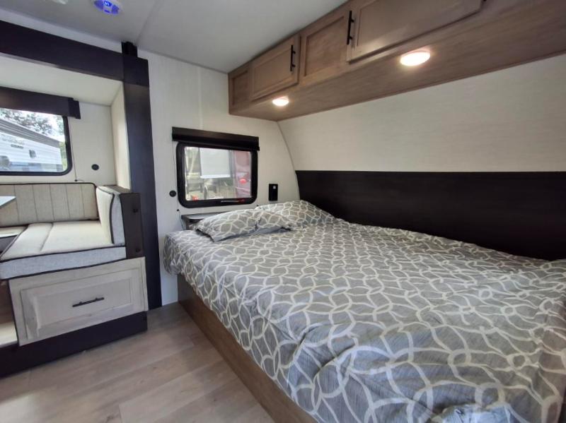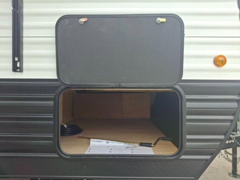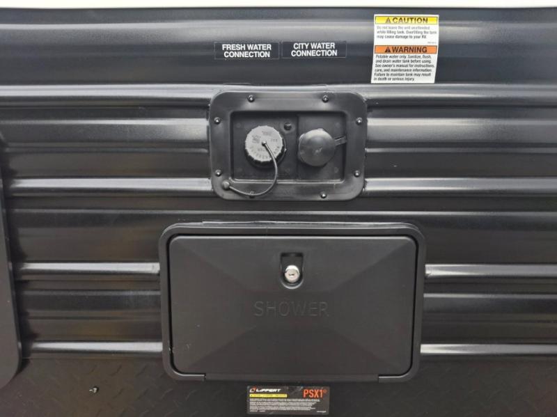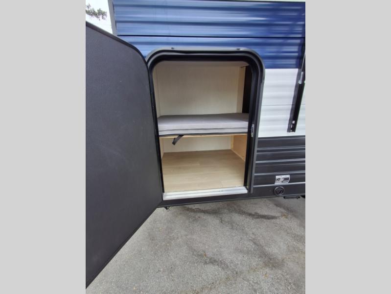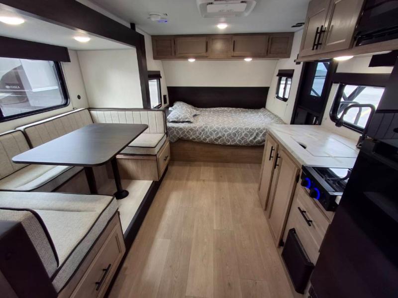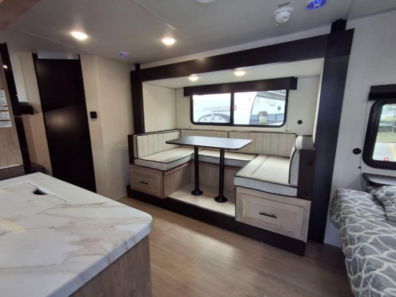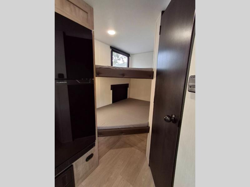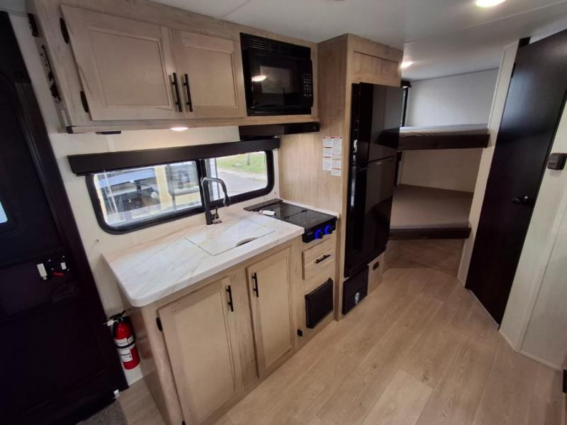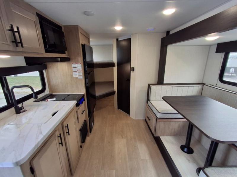 This family travel trailer is ready to head to the campground whenever you are! The kiddos can sleep on the set of double-size bed bunks, and you can sleep on the front queen bed, plus the U-shaped dinette slide can also transform into an extra sleeping space when you aren't using it to enjoy a meal prepared with the cooktop. You can also prepare your delicious meals at the outside mini kitchen and stay protected by the power awning. The exterior not only has outside storage and an outside TV mount but also features an outside storage plus door for access to the storage space underneath the bottom bunk bed. The rear corner bath allows everyone to stay clean and refreshed while you camp.