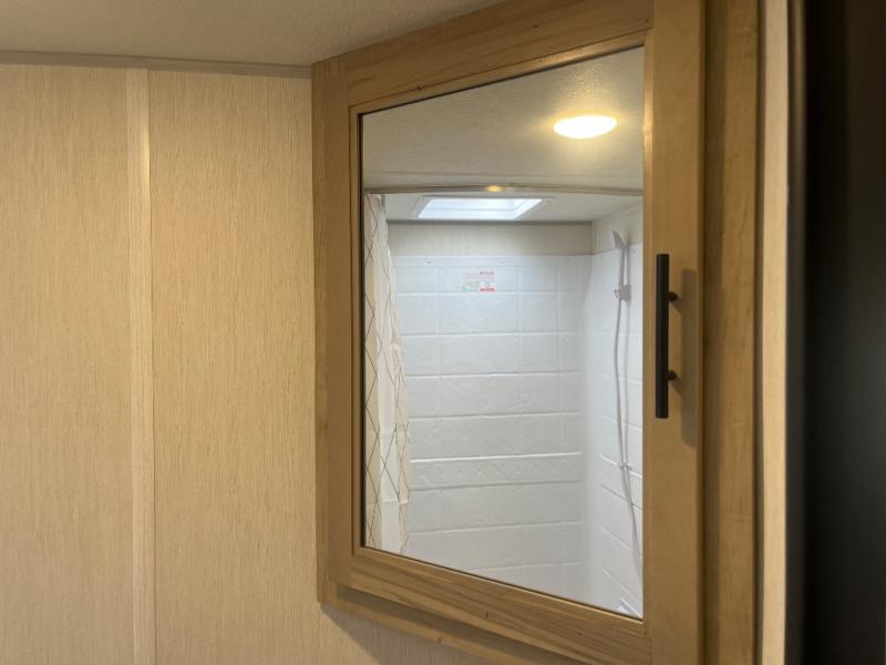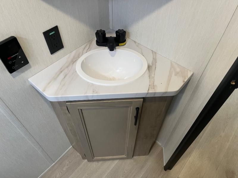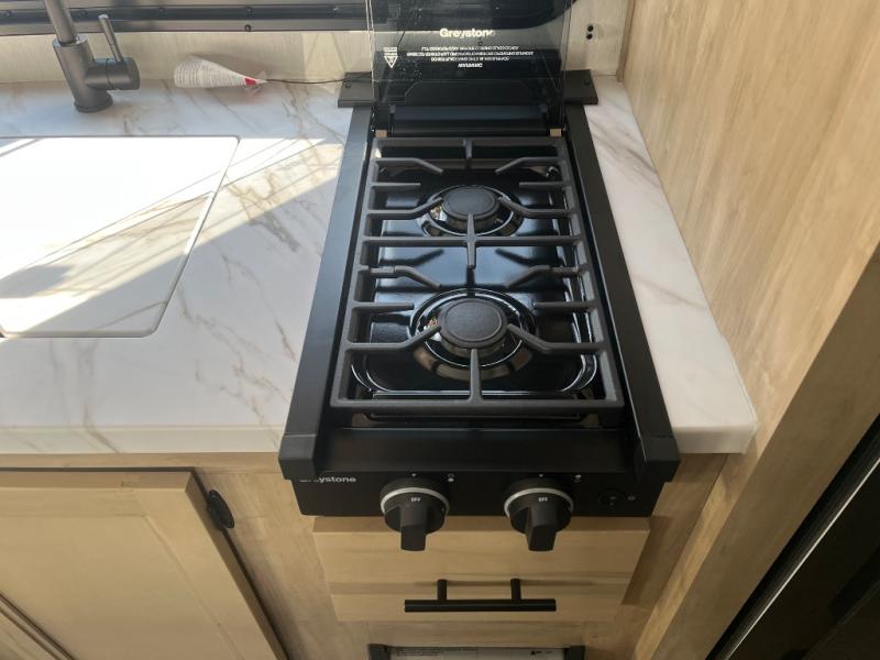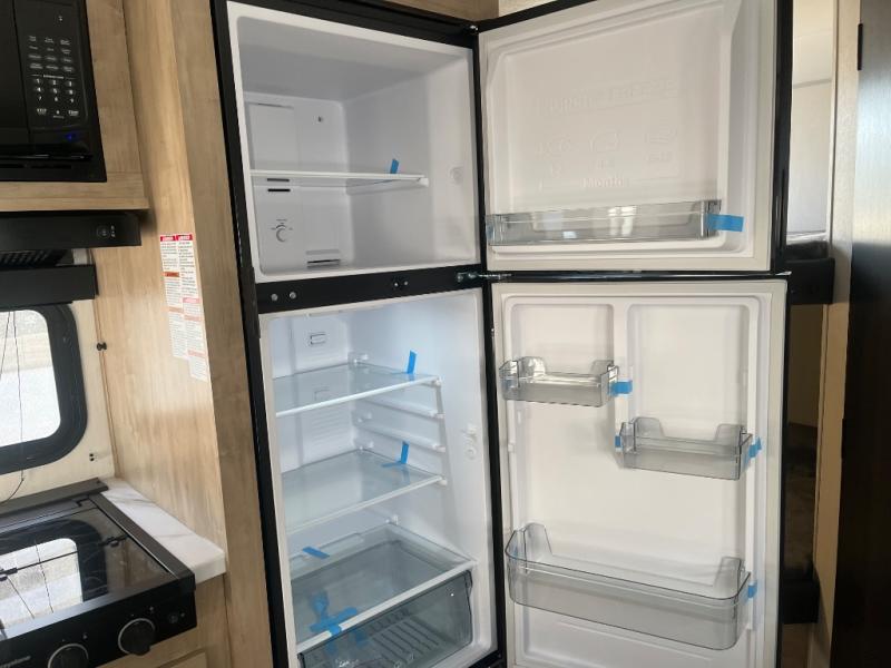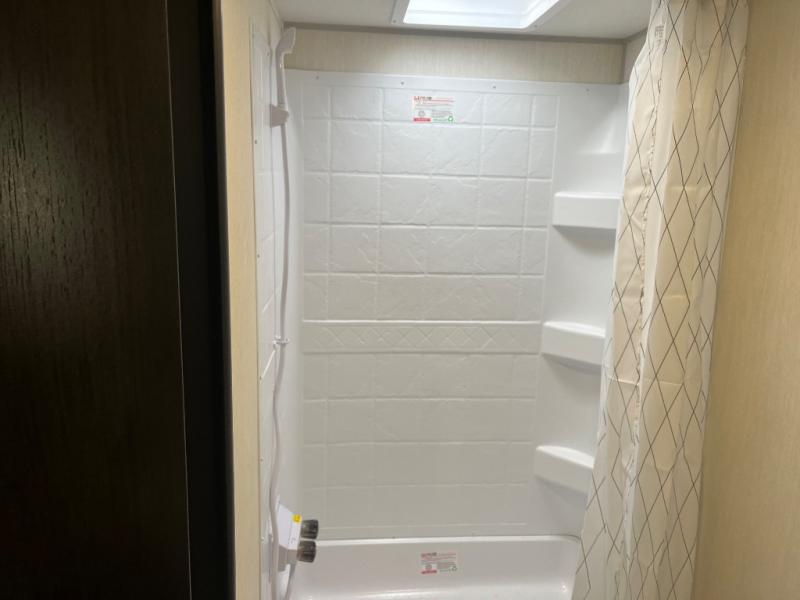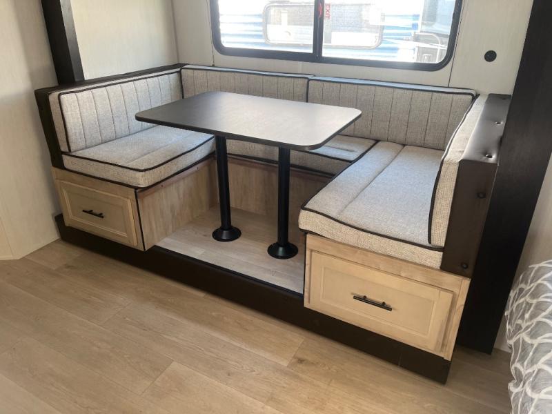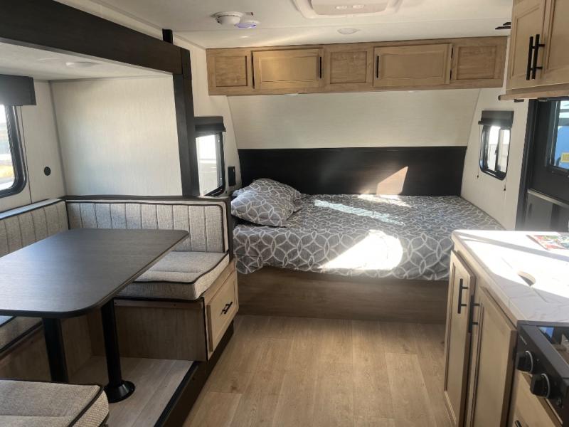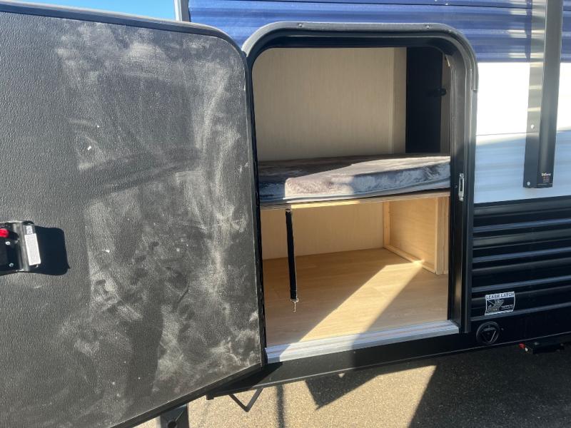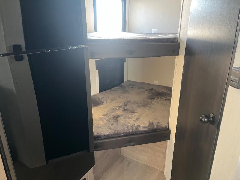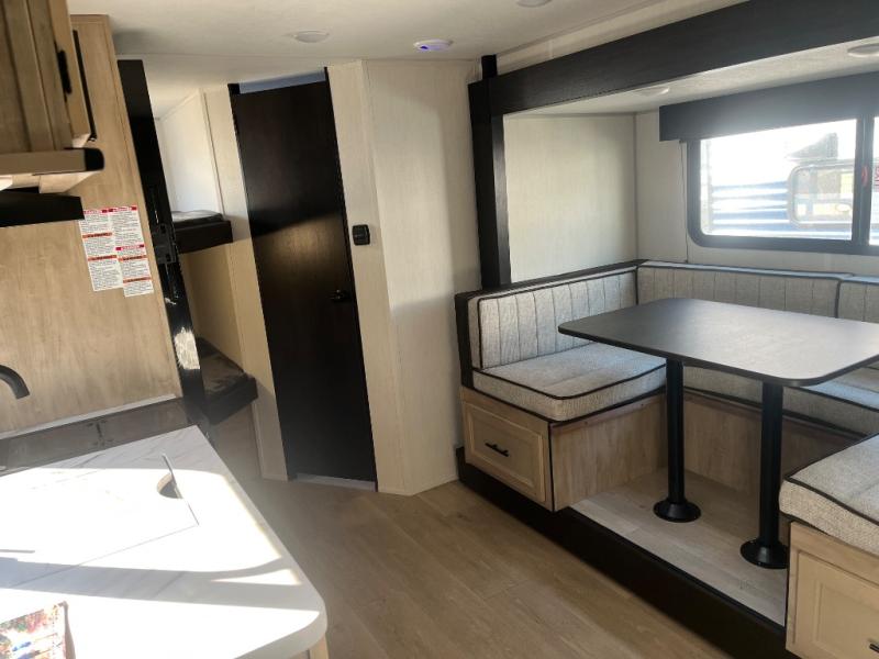 This family travel trailer is ready to head to the campground whenever you are! The kiddos can sleep on the set of double-size bed bunks, and you can sleep on the front queen bed, plus the U-shaped dinette slide can also transform into an extra sleeping space when you aren't using it to enjoy a meal prepared with the cooktop. You can also prepare your delicious meals at the outside mini kitchen and stay protected by the power awning. The exterior not only has outside storage and an outside TV mount but also features an outside storage plus door for access to the storage space underneath the bottom bunk bed. The rear corner bath allows everyone to stay clean and refreshed while you camp.