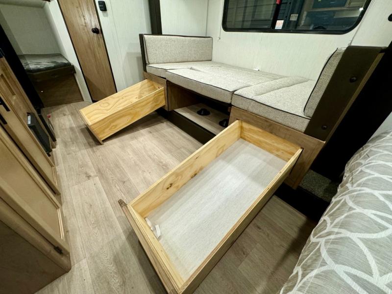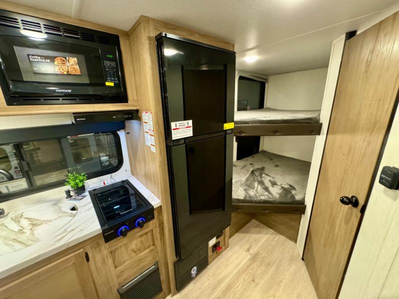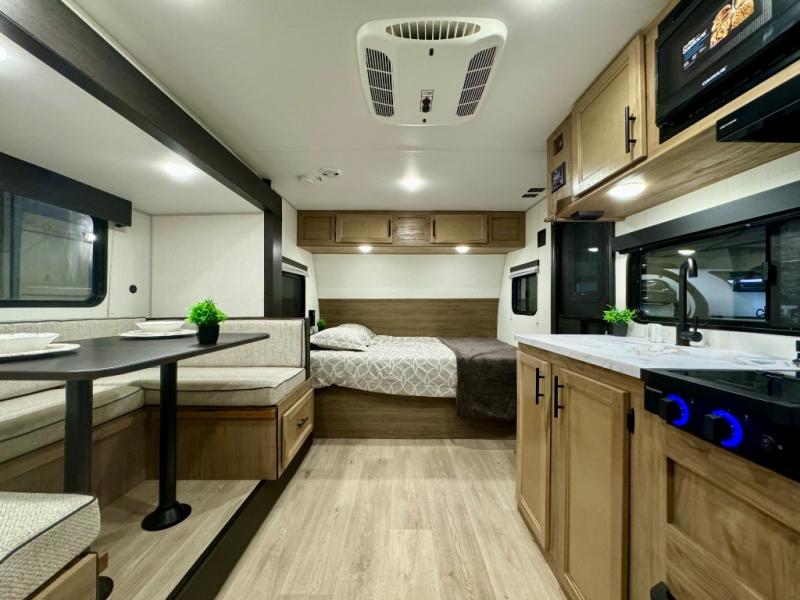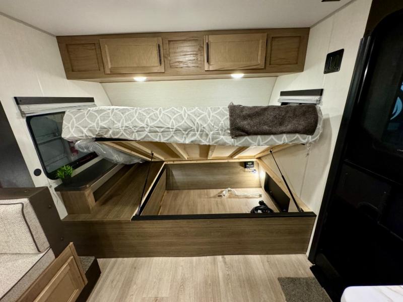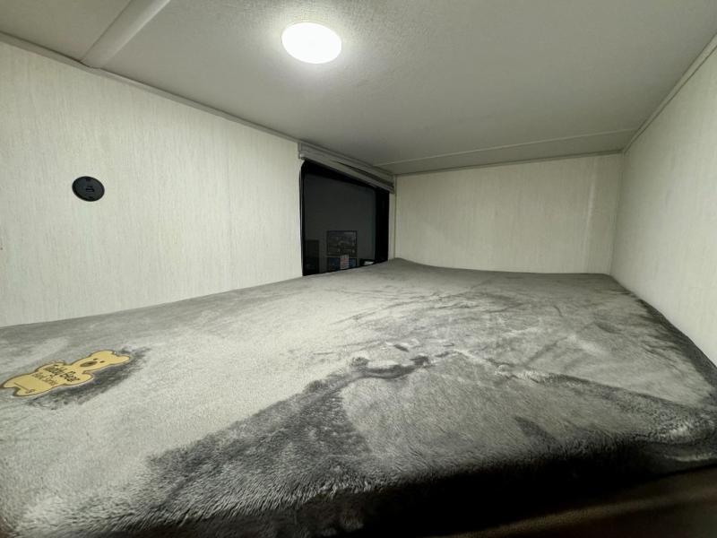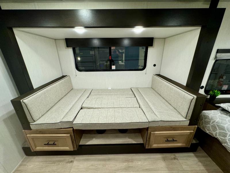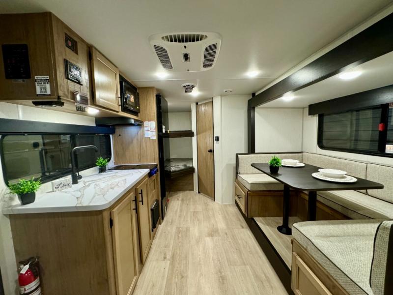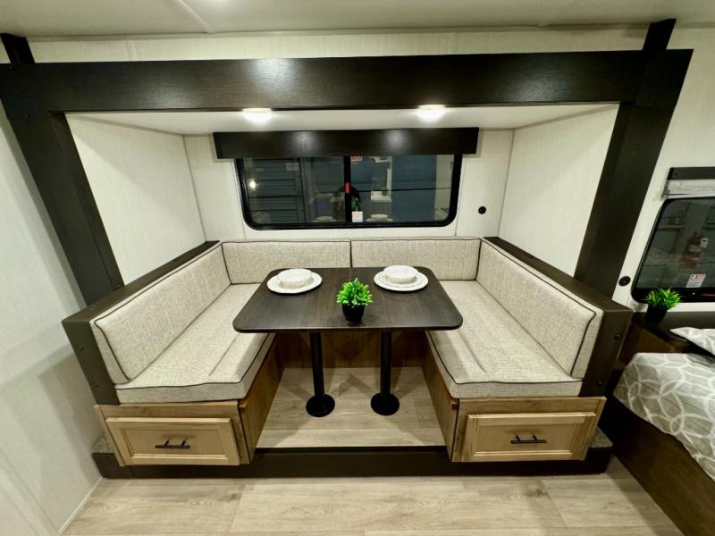 This family travel trailer is ready to head to the campground whenever you are! The kiddos can sleep on the set of double-size bed bunks and you can sleep on the front queen bed, plus the U-shaped dinette slide can also transform into an extra sleeping space when you aren't using it to enjoy a meal prepared with the high output cooktop. You can also prepare your delicious meals at the outside mini kitchen and stay protected by the power awning. The exterior not only has outside storage and an outside TV mount, but also features an outside storage plus door for access to the storage space underneath the bottom bunk bed. The rear corner bath allows everyone to stay clean and refreshed while you camp.