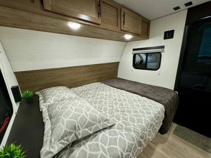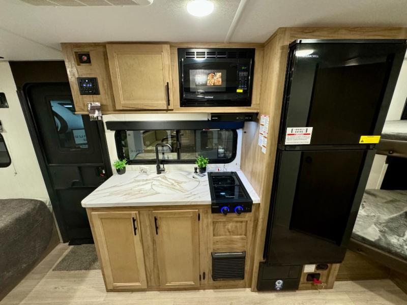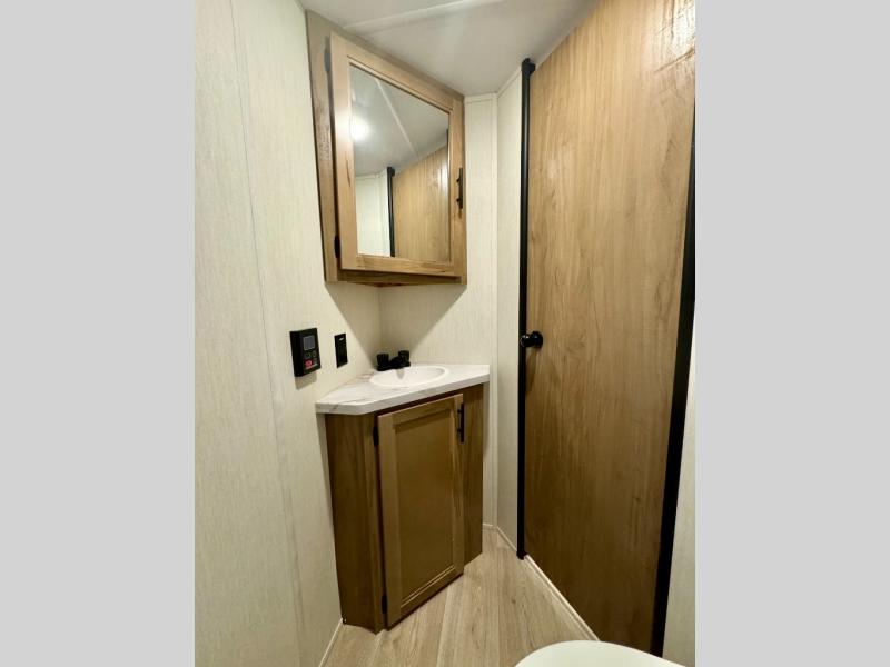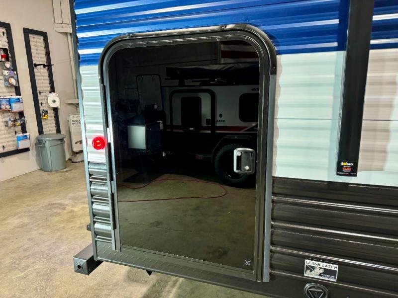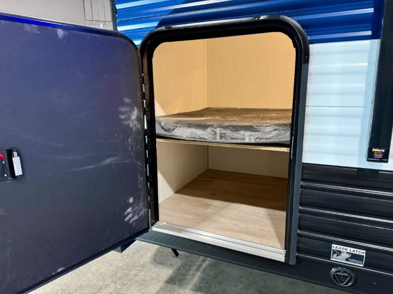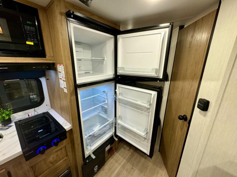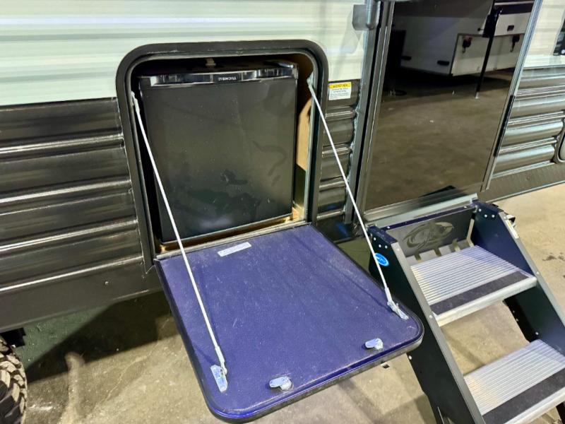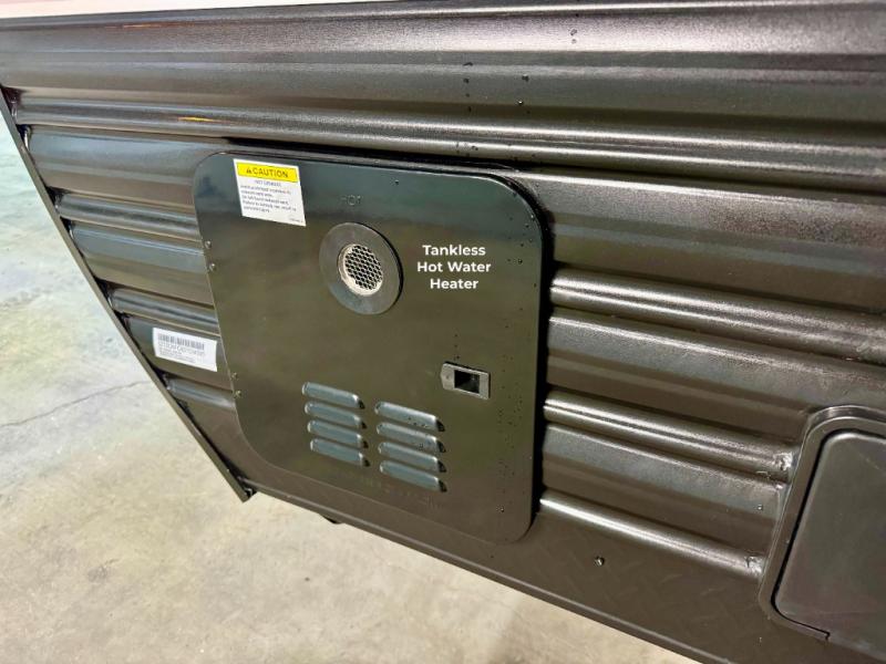 This family travel trailer is ready to head to the campground whenever you are! The kiddos can sleep on the set of double-size bed bunks and you can sleep on the front queen bed, plus the U-shaped dinette slide can also transform into an extra sleeping space when you aren't using it to enjoy a meal prepared with the high output cooktop. You can also prepare your delicious meals at the outside mini kitchen and stay protected by the power awning. The exterior not only has outside storage and an outside TV mount, but also features an outside storage plus door for access to the storage space underneath the bottom bunk bed. The rear corner bath allows everyone to stay clean and refreshed while you camp.