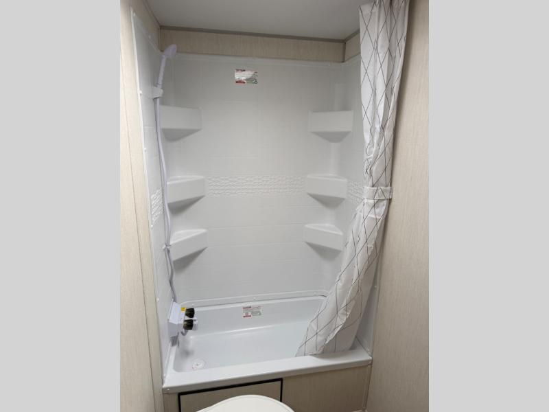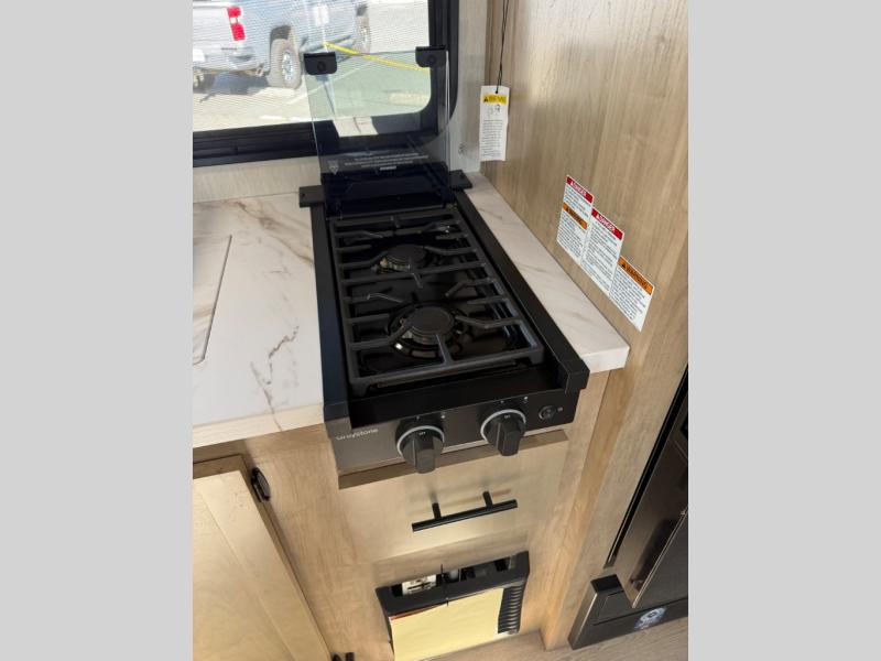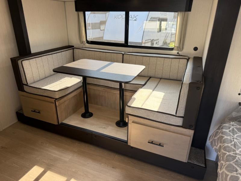 This family travel trailer is ready to head to the campground whenever you are! The kiddos can sleep on the set of double-size bed bunks, and you can sleep on the front queen bed, plus the U-shaped dinette slide can also transform into an extra sleeping space when you aren't using it to enjoy a meal prepared with the cooktop. You can also prepare your delicious meals at the outside mini kitchen and stay protected by the power awning. The exterior not only has outside storage and an outside TV mount but also features an outside storage plus door for access to the storage space underneath the bottom bunk bed. The rear corner bath allows everyone to stay clean and refreshed while you camp.