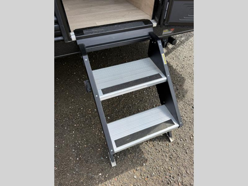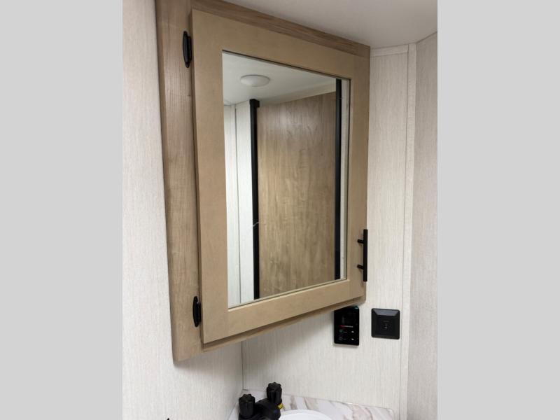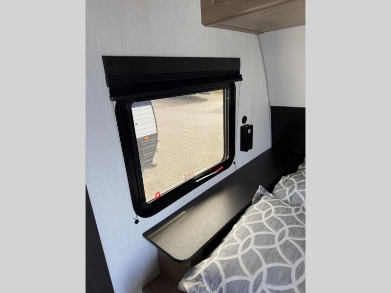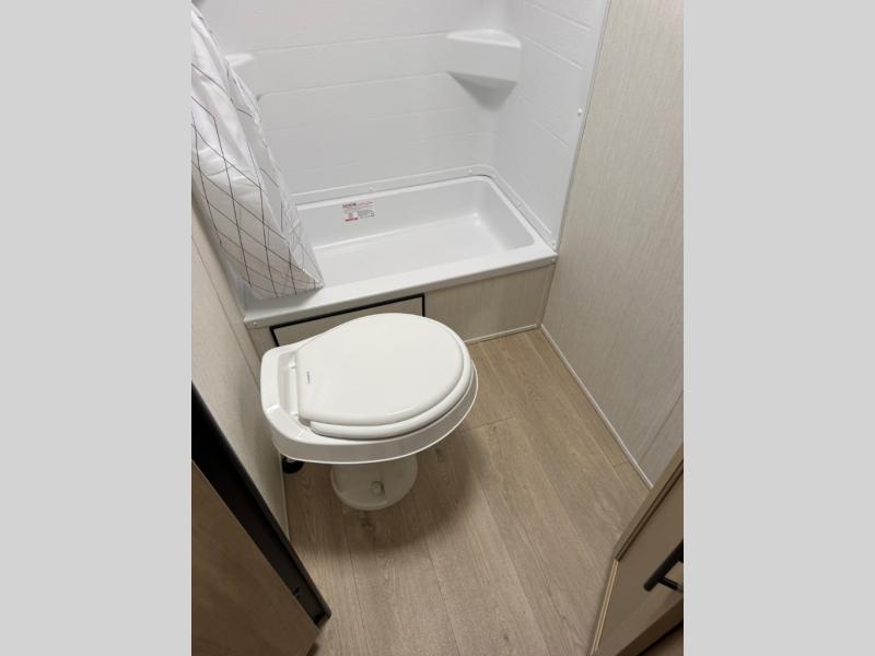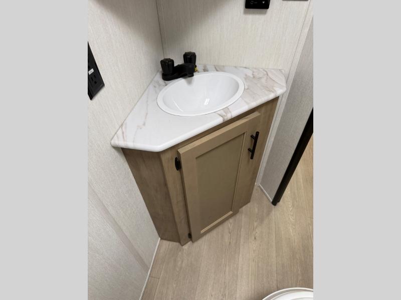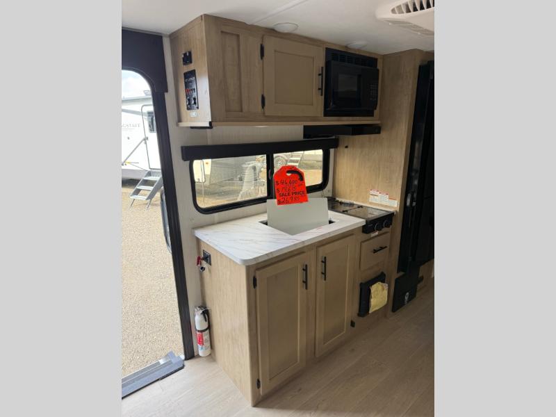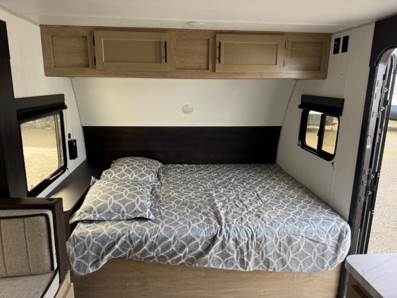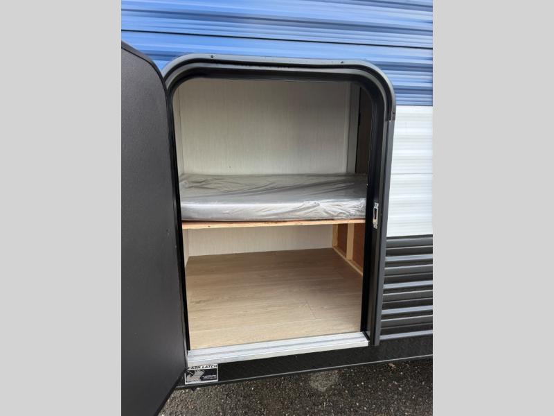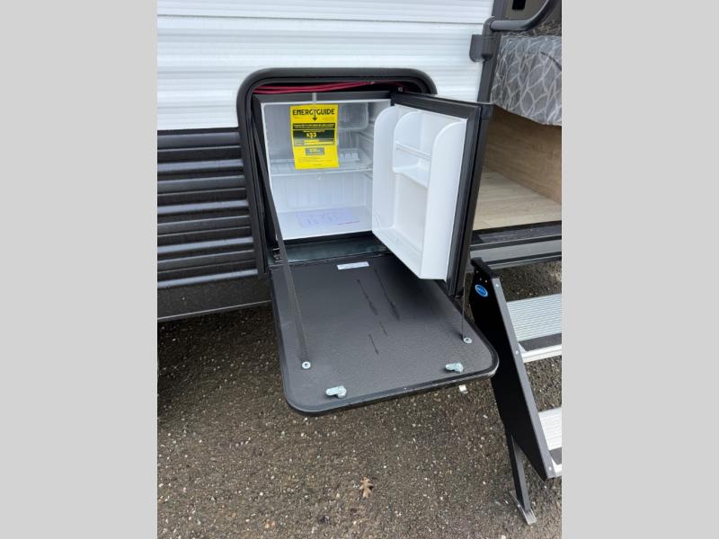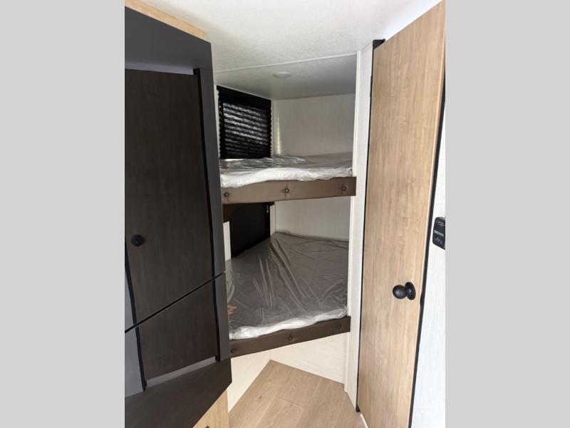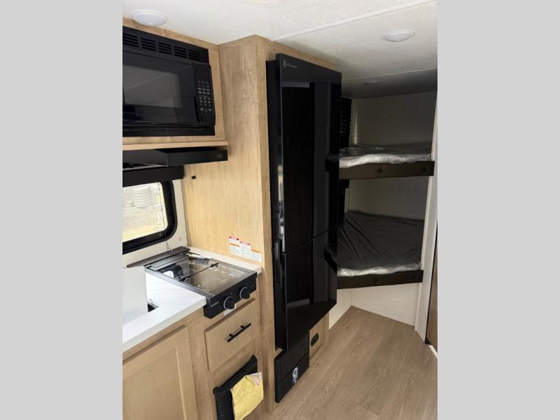 This family travel trailer is ready to head to the campground whenever you are! The kiddos can sleep on the set of double-size bed bunks, and you can sleep on the front queen bed, plus the U-shaped dinette slide can also transform into an extra sleeping space when you aren't using it to enjoy a meal prepared with the cooktop. You can also prepare your delicious meals at the outside mini kitchen and stay protected by the power awning. The exterior not only has outside storage and an outside TV mount but also features an outside storage plus door for access to the storage space underneath the bottom bunk bed. The rear corner bath allows everyone to stay clean and refreshed while you camp.