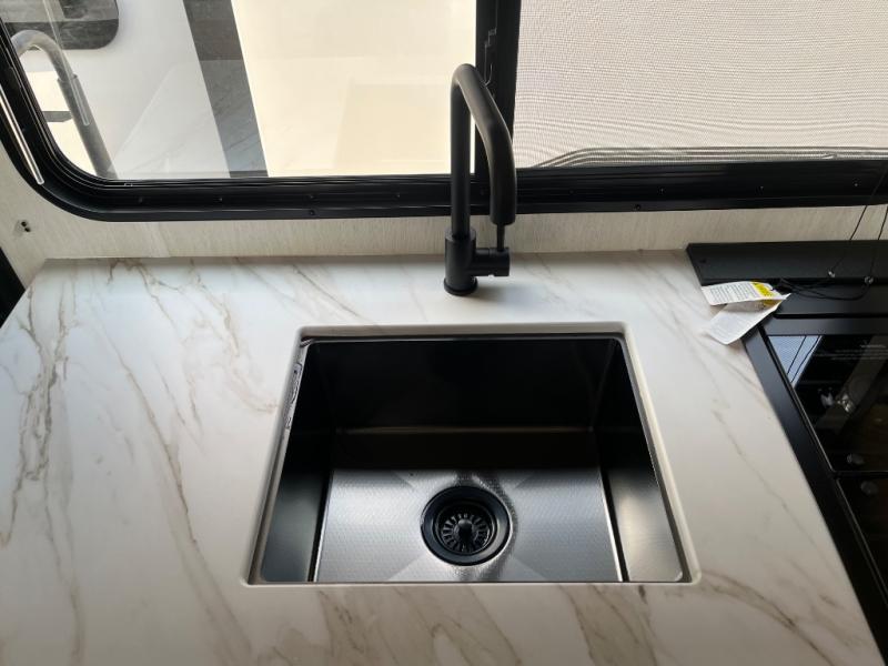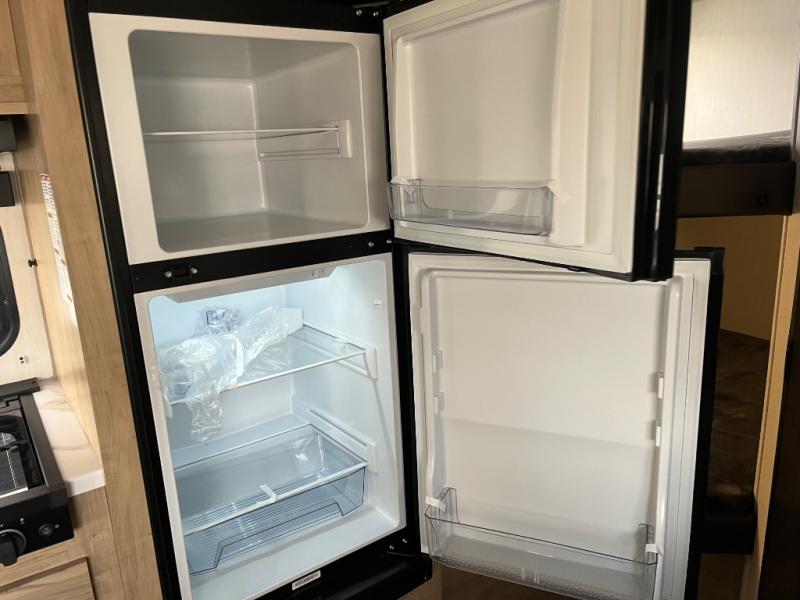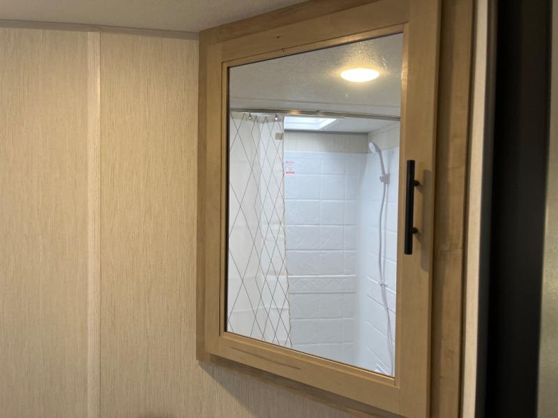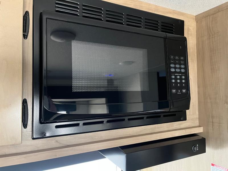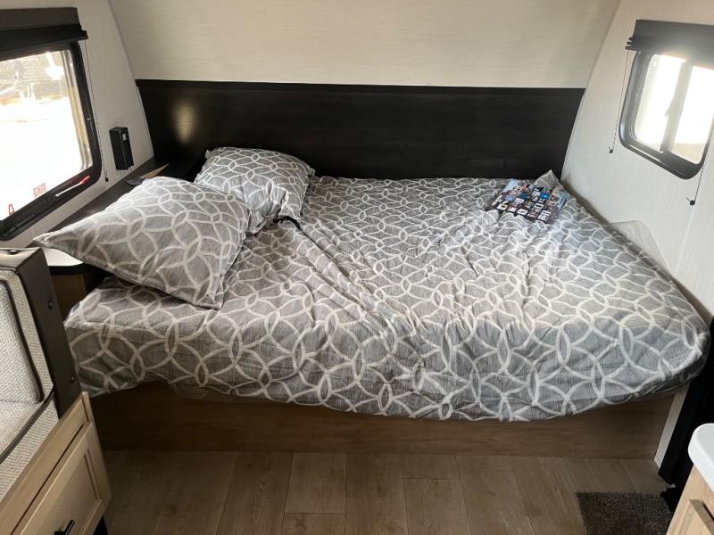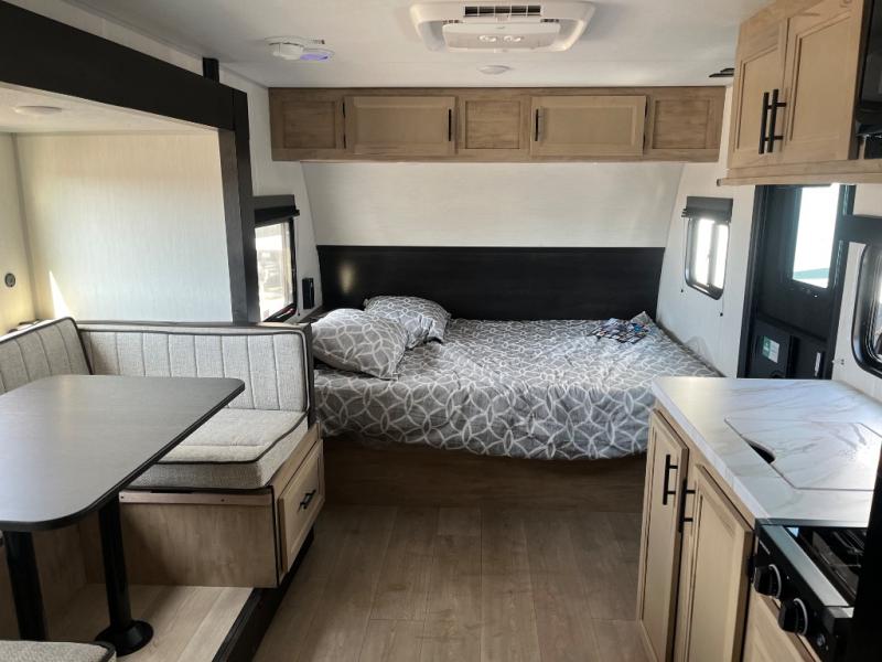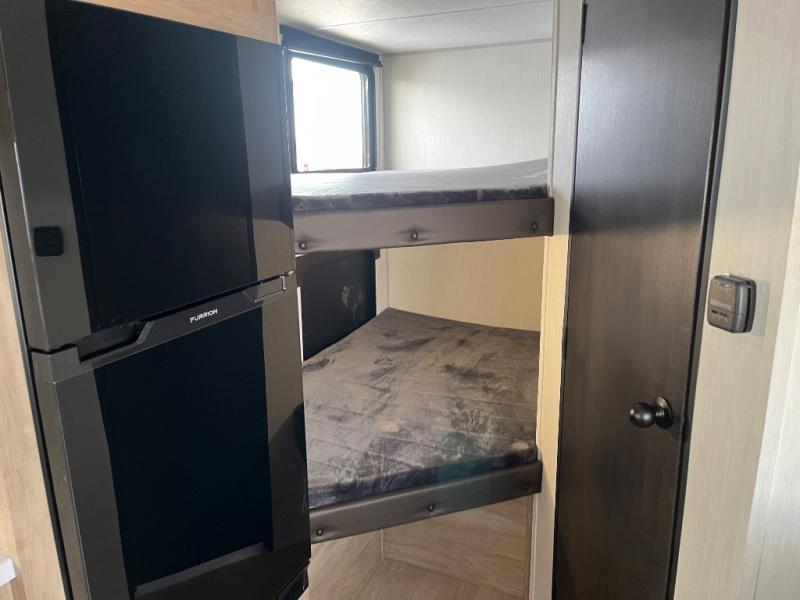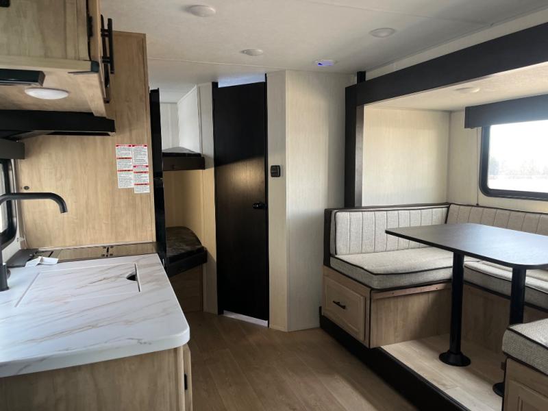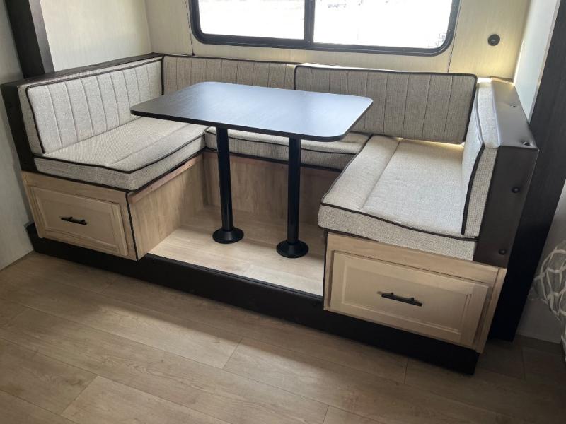 This family travel trailer is ready to head to the campground whenever you are! The kiddos can sleep on the set of double-size bed bunks, and you can sleep on the front queen bed, plus the U-shaped dinette slide can also transform into an extra sleeping space when you aren't using it to enjoy a meal prepared with the cooktop. You can also prepare your delicious meals at the outside mini kitchen and stay protected by the power awning. The exterior not only has outside storage and an outside TV mount but also features an outside storage plus door for access to the storage space underneath the bottom bunk bed. The rear corner bath allows everyone to stay clean and refreshed while you camp.