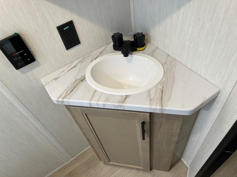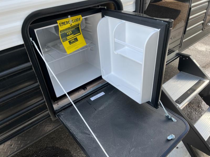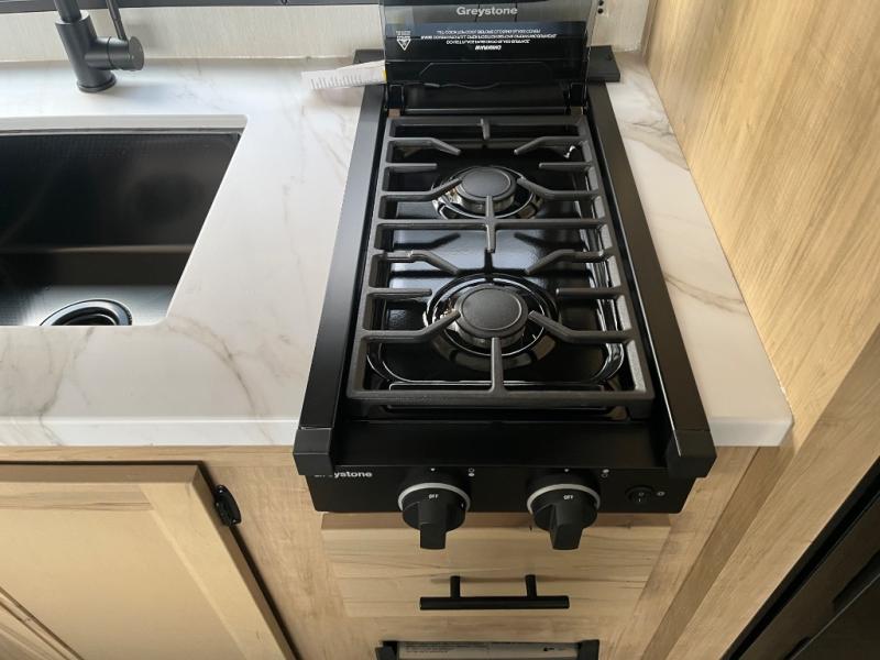 This family travel trailer is ready to head to the campground whenever you are! The kiddos can sleep on the set of double-size bed bunks, and you can sleep on the front queen bed, plus the U-shaped dinette slide can also transform into an extra sleeping space when you aren't using it to enjoy a meal prepared with the cooktop. You can also prepare your delicious meals at the outside mini kitchen and stay protected by the power awning. The exterior not only has outside storage and an outside TV mount but also features an outside storage plus door for access to the storage space underneath the bottom bunk bed. The rear corner bath allows everyone to stay clean and refreshed while you camp.