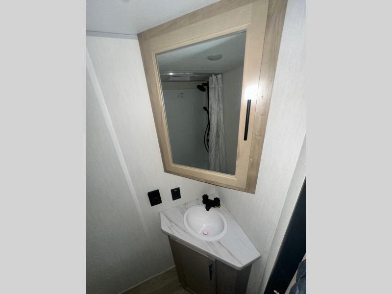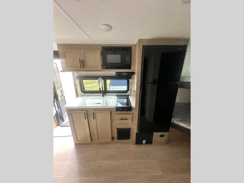 This family travel trailer is ready to head to the campground whenever you are! The kiddos can sleep on the set of double-size bed bunks, and you can sleep on the front queen bed, plus the U-shaped dinette slide can also transform into an extra sleeping space when you aren't using it to enjoy a meal prepared with the cooktop. You can also prepare your delicious meals at the outside mini kitchen and stay protected by the power awning. The exterior not only has outside storage and an outside TV mount but also features an outside storage plus door for access to the storage space underneath the bottom bunk bed. The rear corner bath allows everyone to stay clean and refreshed while you camp.